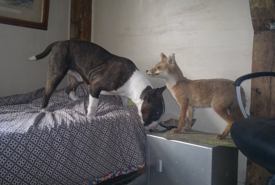 3 maart 2012: Bolletje ontmoet de opgezette vos in ons opkamertje, dat vond onze majesteit wel heel spannend, haha!