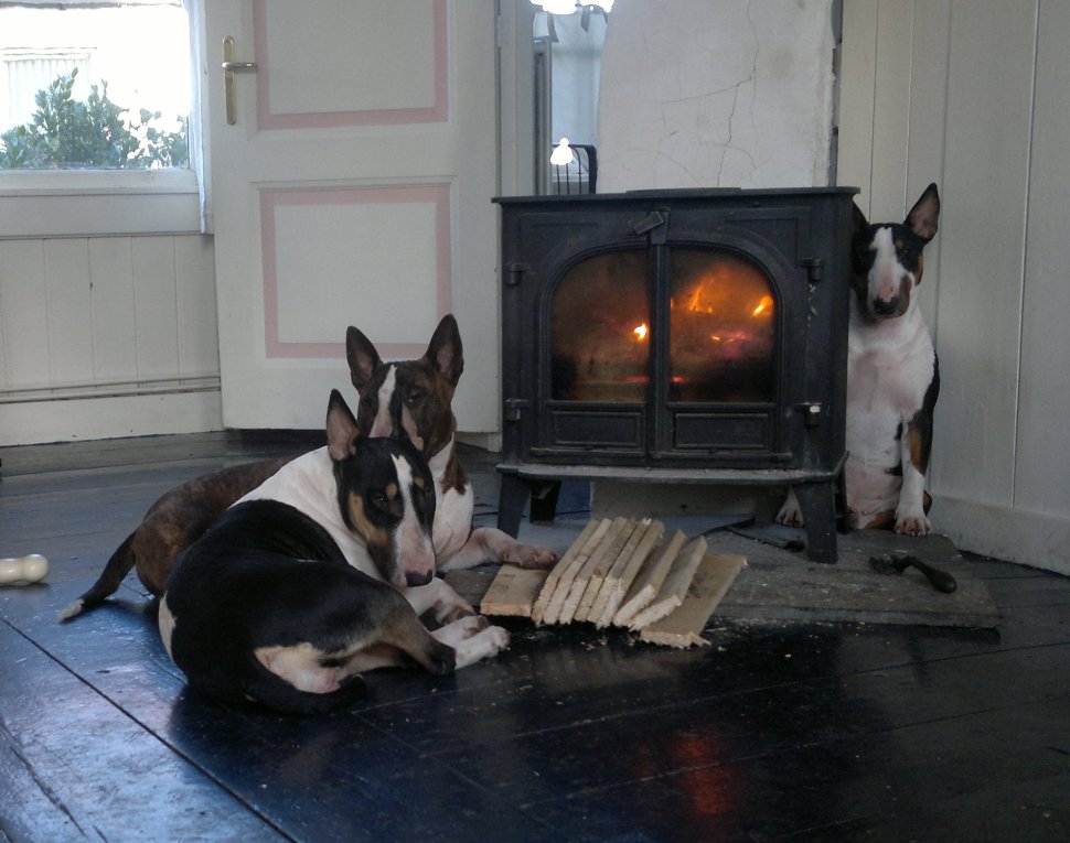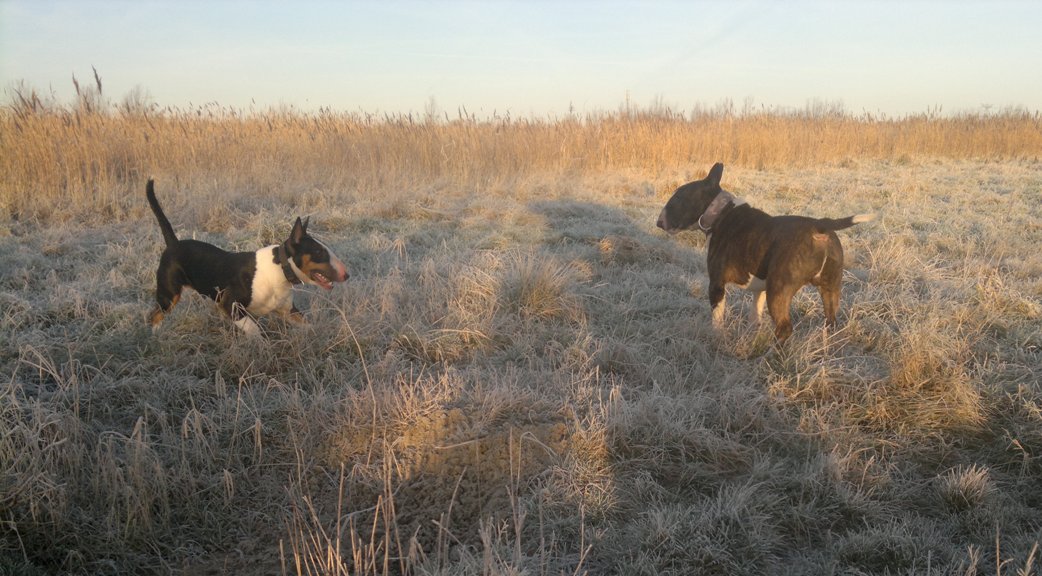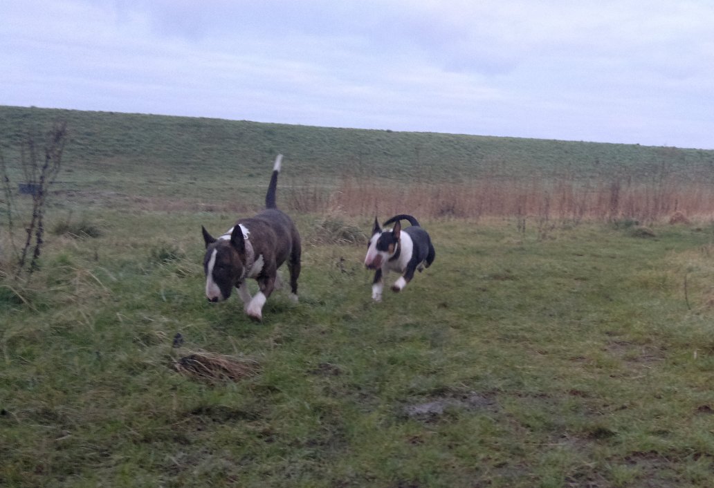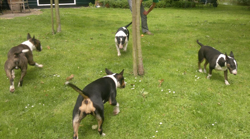 22 januari 2012: Tess en Bolletje doen samen een gekke bullie run. Gladys, die sowieso een beetje hormonaal is op het ogenblik, vindt het een beetje te wild worden en denkt dat ze 'haar kindje' Tess moet beschermen. Niets is minder waar, ik denk dat ze beter Bolletje zou kunnen beschermen, die doet echt geen vlieg kwaad. Verder niks aan de hand hoor... Bullterriers kunnen wel tegen een stootje.