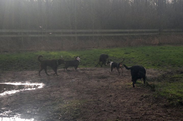 4 januari 2012: vanmorgen zijn Bolletje en ik in het Twiske bij de uitlaatservice van Mirjam op bezoek geweest, alwaar Tess al was (Gladys is loops, dus die kon niet mee). Bolletje ging direct perfect in het roedel van 20 (voor hem) vreemde honden op, waaronder ook meerdere ongecastreerde reuen! Bolletje heeft leuk met de andere honden gespeeld! Mooi hoor, hij is vanaf volgende week welkom om ook met Anubis mee te gaan. Dankjewel Mirjam!