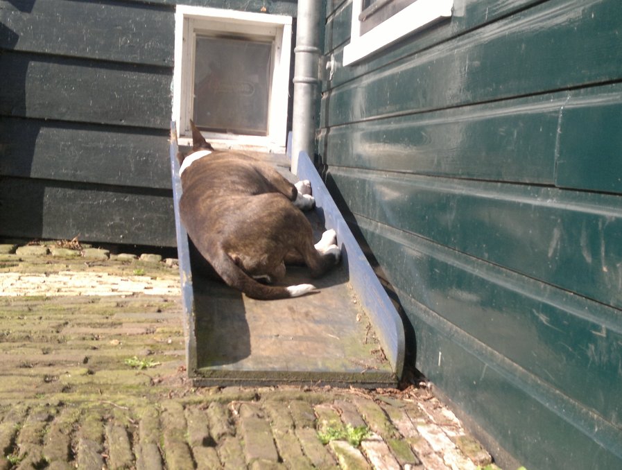 Ook Tess vindt het loopplankje naar het hondendeurtje wel een lekker warm beschut plekje...
