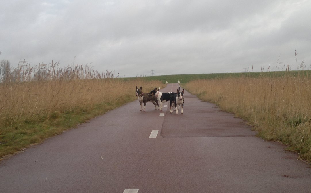 Op het overdreven beschermende gedrag van Gladys richting Tess heb ik iets gevonden: zodra Bolletje, aangezet door Tess en samen met Tess aan hun wilde bullie runs en stoeipartijen beginnen (elke wandeling wel een keer) roep ik Gladys (via een hondenkoekje) bij me. Gladys en ik kijken dan, al rustig koekjes etend (dan heb ik de aandacht), het wilde spel van Bolletje en Tess aan. We hebben dit nu al drie keer succesvol geoefend! Mooi hoor, aandacht verleggen, positief gedrag belonen, negatief gedrag negeren, werkt altijd (als je maar genoeg hondenkoekjes mee hebt, haha).