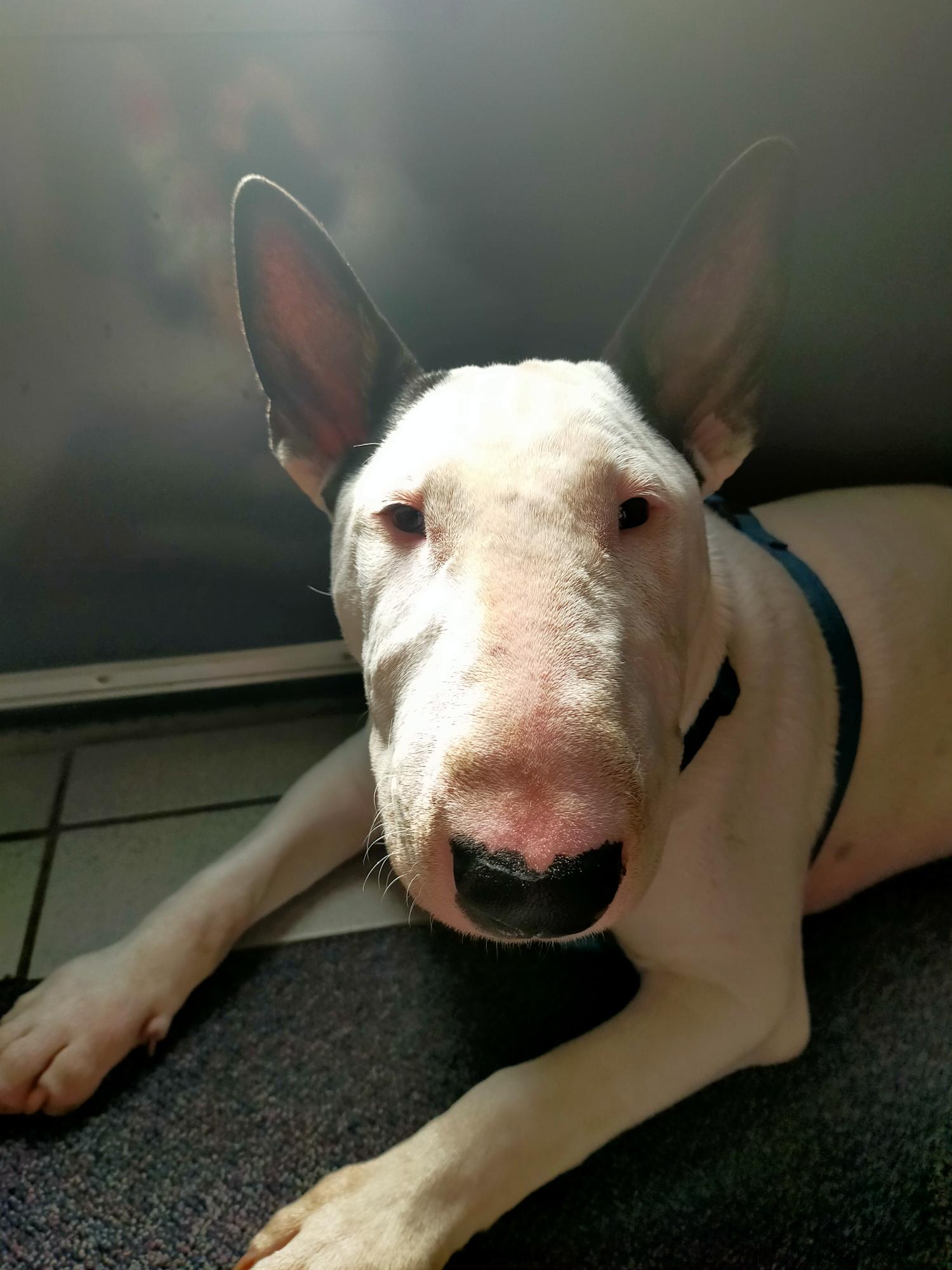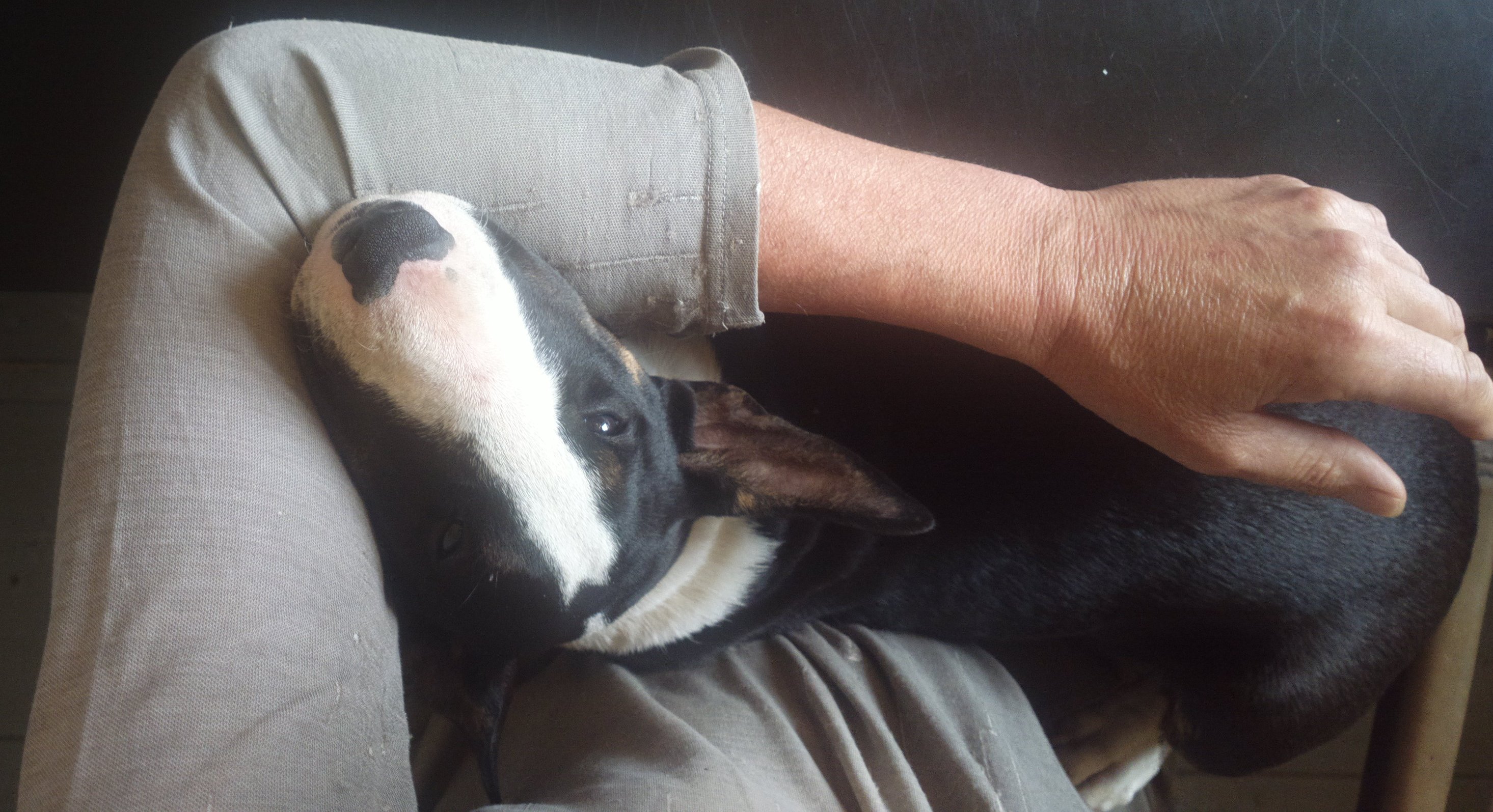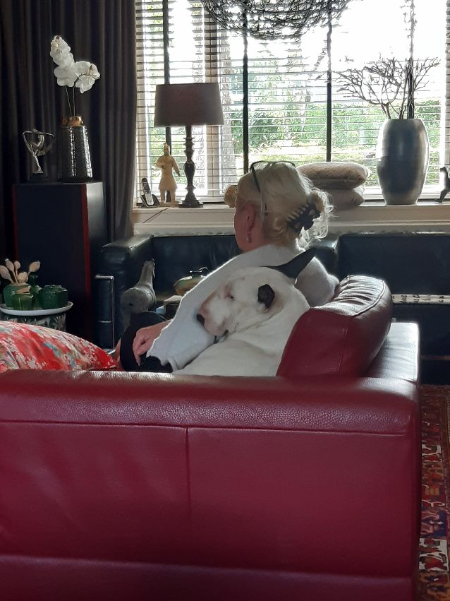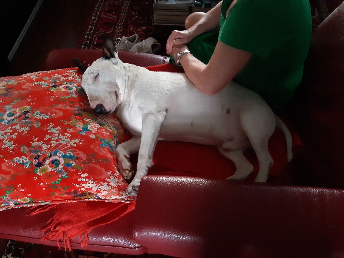 Our last photo of Bull Terrier Boritesia Poborete Varkhond (Babba, named after a Turkish Maffia Boss by his adoption parents...), 2 hours before he left us to go and live with Ruud and Marianne.