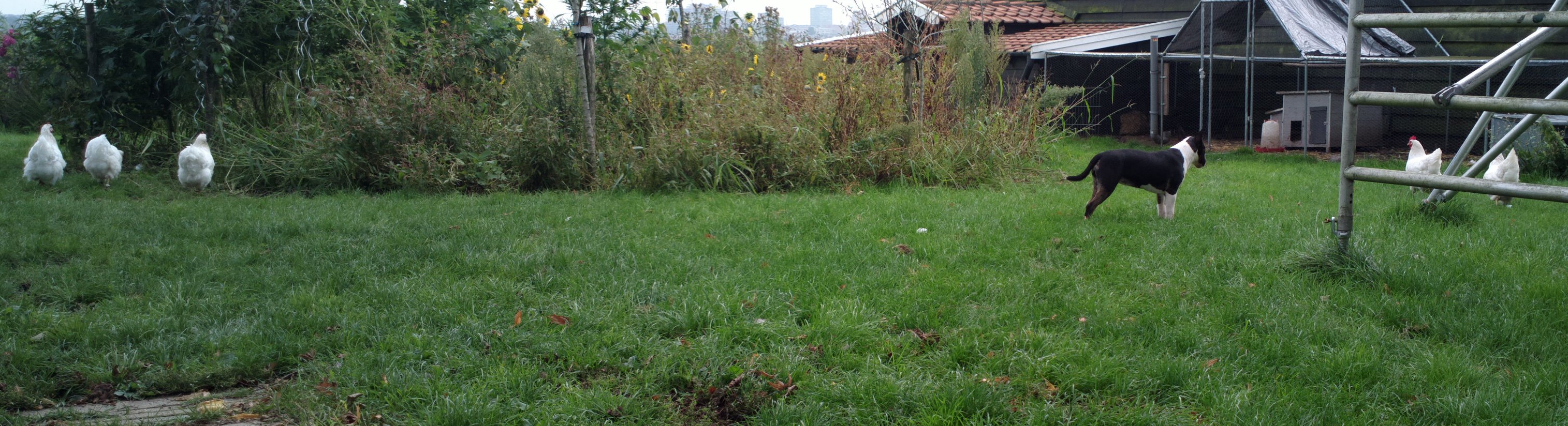 27th of September 2023: as of yesterday our chickens are allowed to free range in the garden again for the winter (our vegetable garden is finished for the year, Autumn). Meisje needed some correcting about chasing the chickens, but now gently and in awe follows them all around our garden ;-)