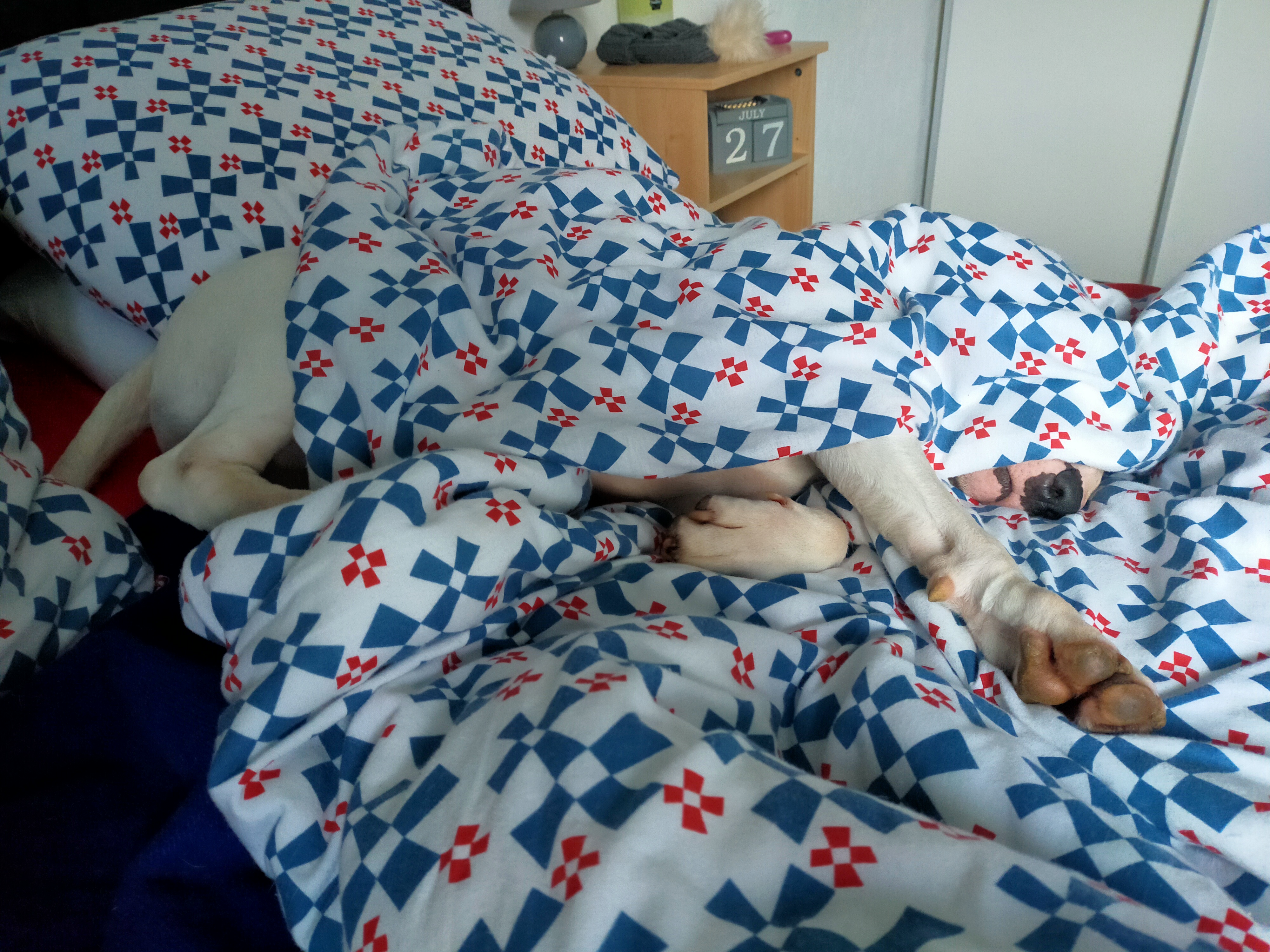 4th of July 2023: Meisje's brother Gabber having a lazy relaxed lie in in bed this morning, with no intention of getting up together with Albert ;-)