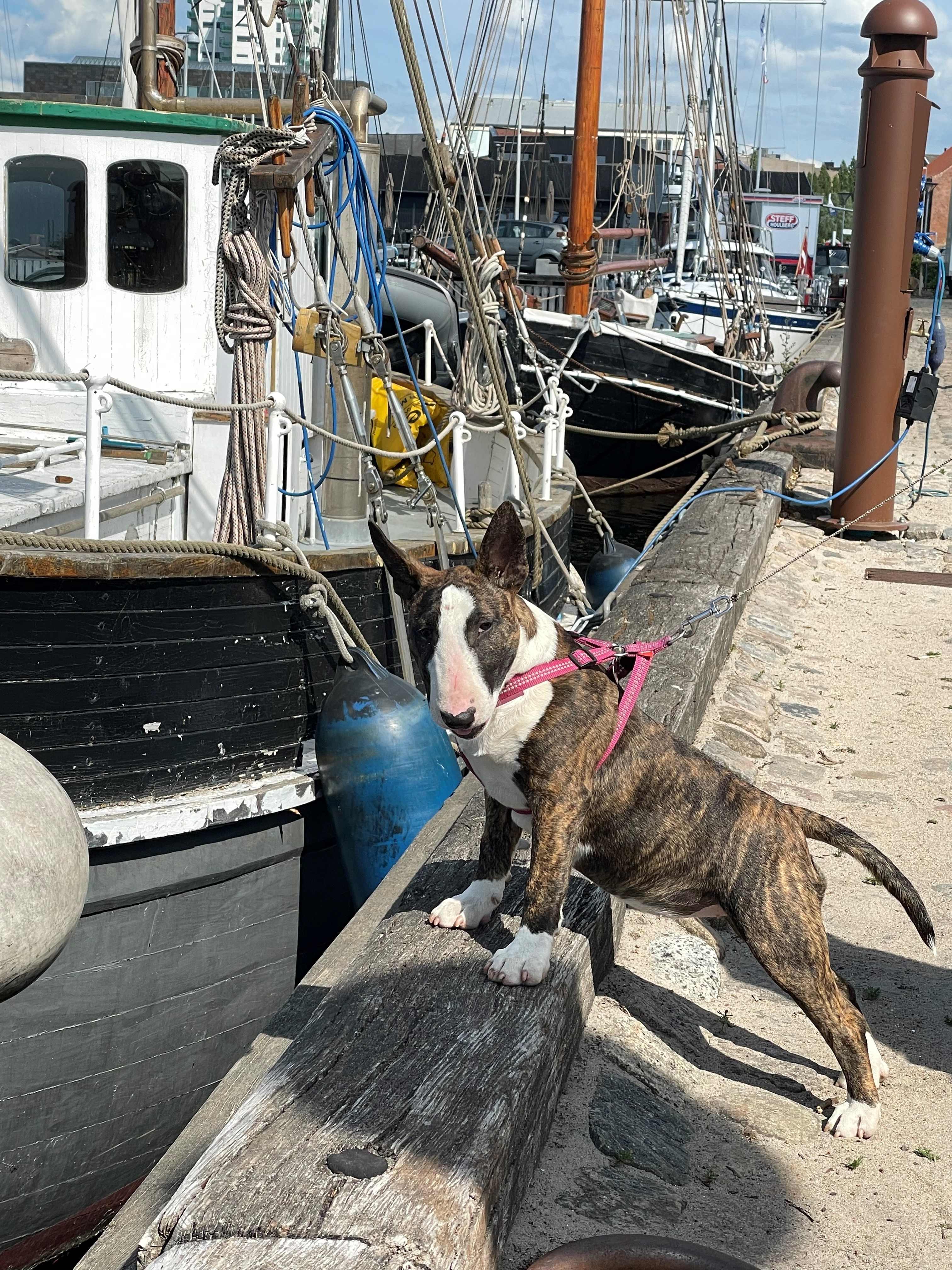 30th of June 2023: Meisje's sister Macey visiting the harbour of a big city with Kim and Bente in Denmark. Kim writes: she is fearless and full of self esteem towards traffic and strangers ❤️