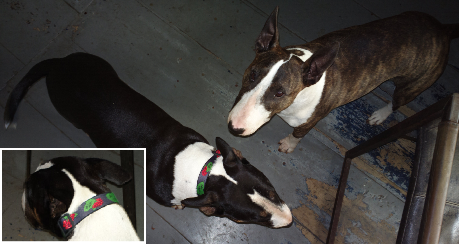19th of september 2023: what a treat today, e-mails and photo's of Meisje's brothers Kay and Gabber! Kay has a new harness, gabber a bunch of new bones, probably also to distract him from chewing up the kitchen chairs ;-)