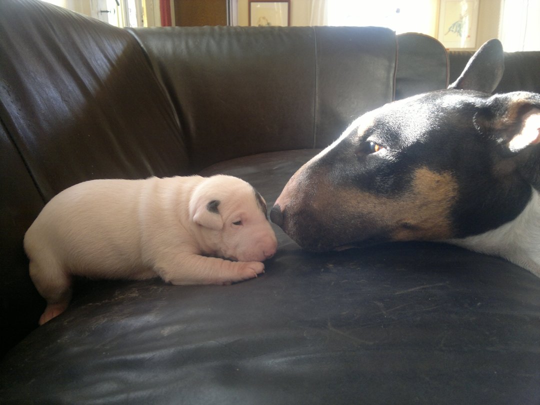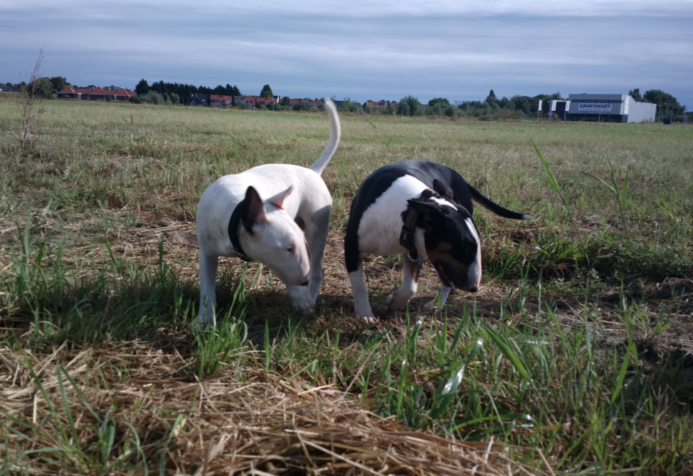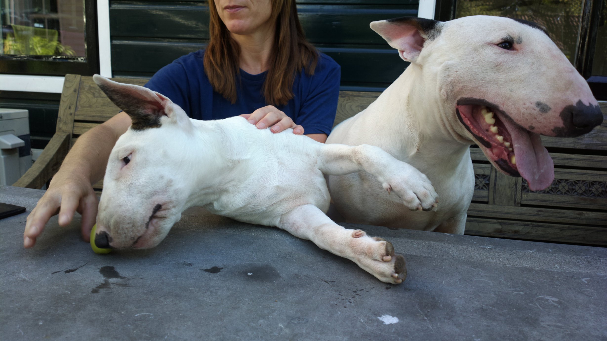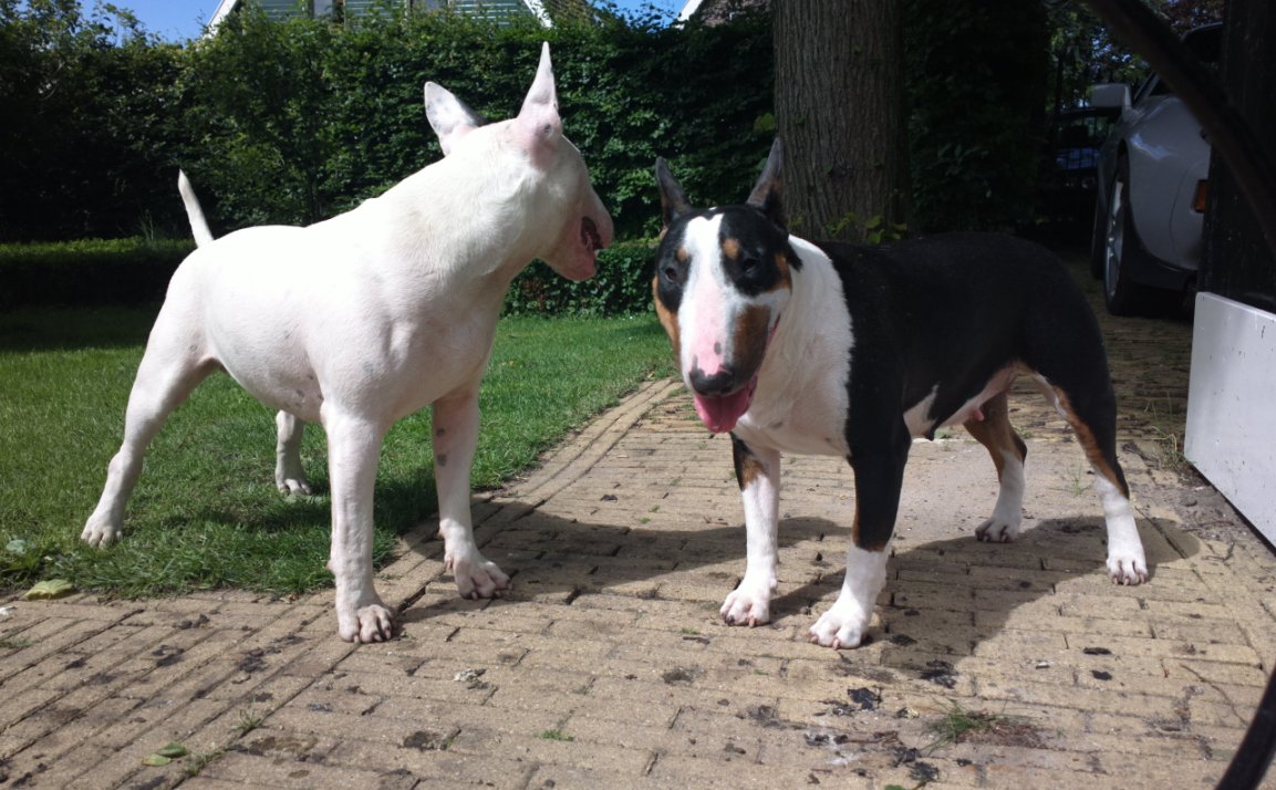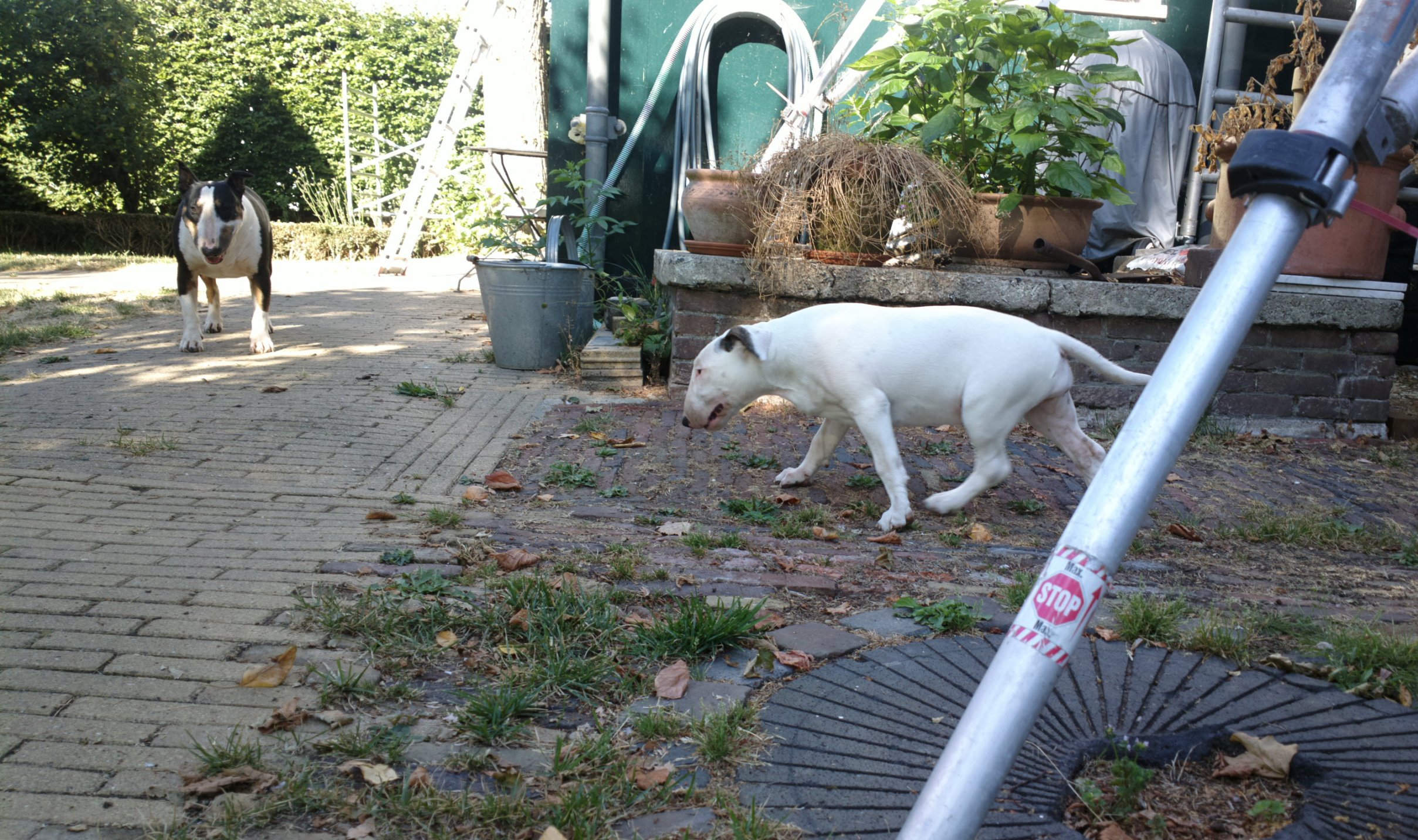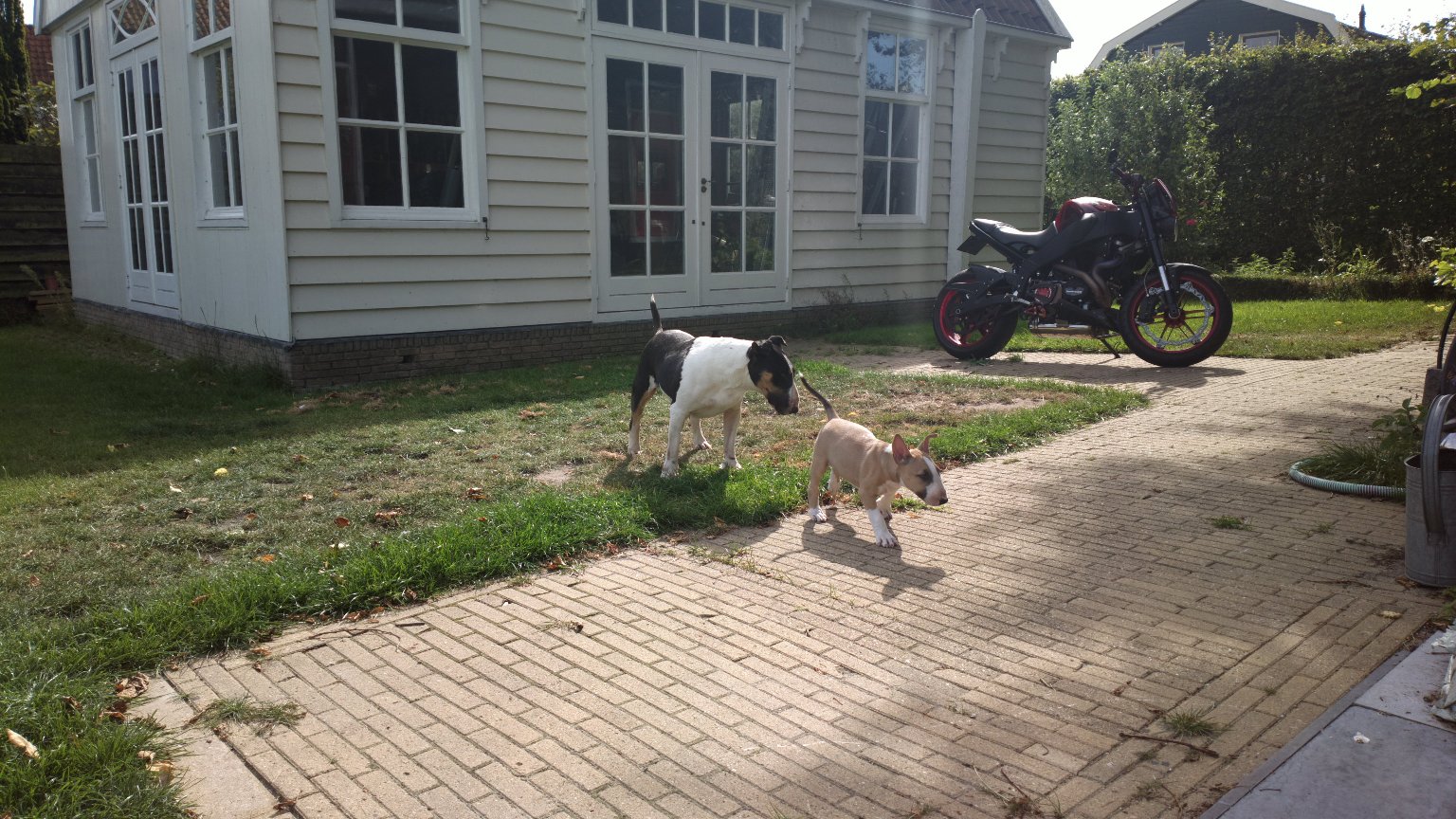 30 augustus 2019: leuk, vanmiddag Leo weer met Dessa's 9 weken oude BT pup Lady op bezoek. Het is zo'n snoesje... Wat zijn Bull Terriers toch een lieve, zorgzame en positief opvoedende honden!