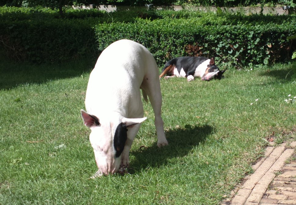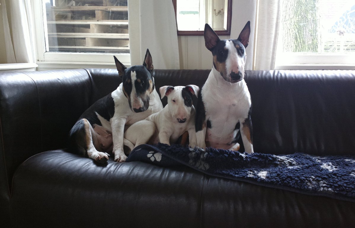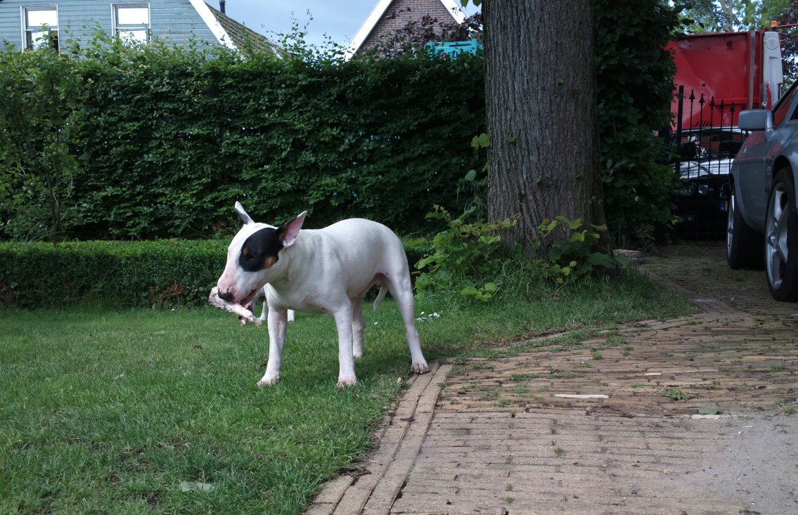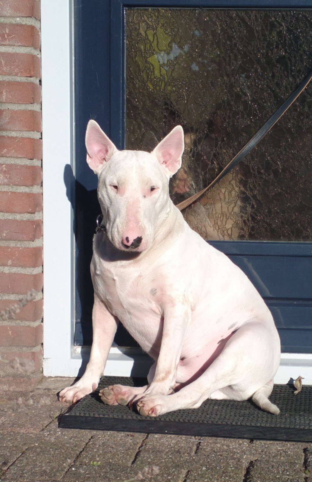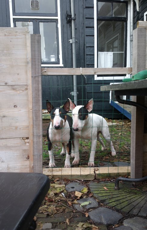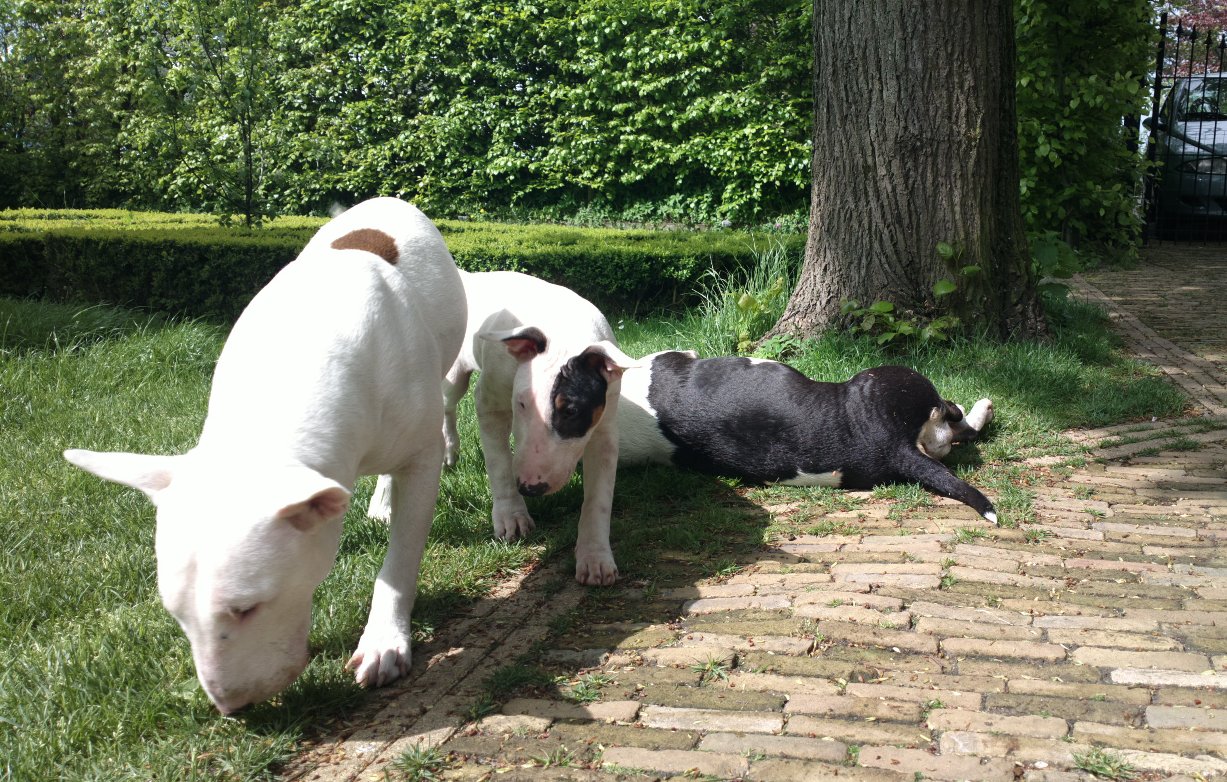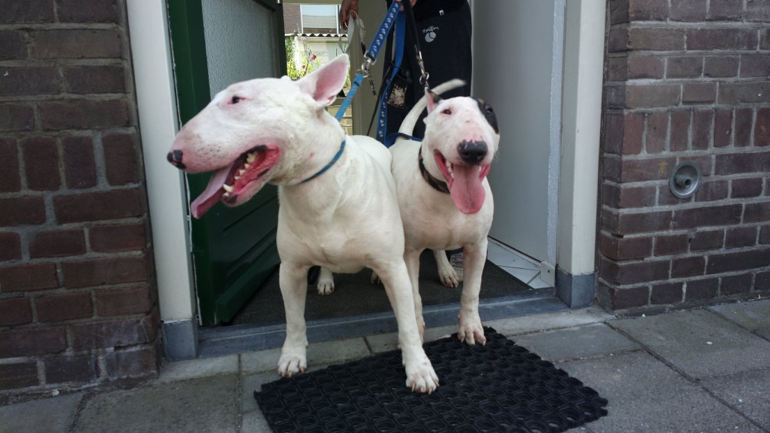 30 augustus 2019: leuk, vanmiddag Leo weer met Dessa's 9 weken oude BT pup Lady op bezoek. Het is zo'n snoesje... Wat zijn Bull Terriers toch een lieve, zorgzame en positief opvoedende honden!