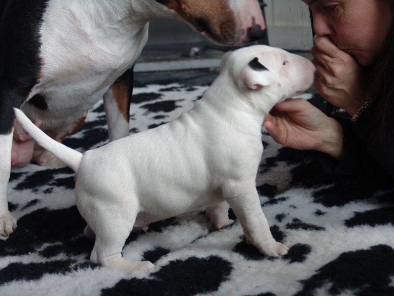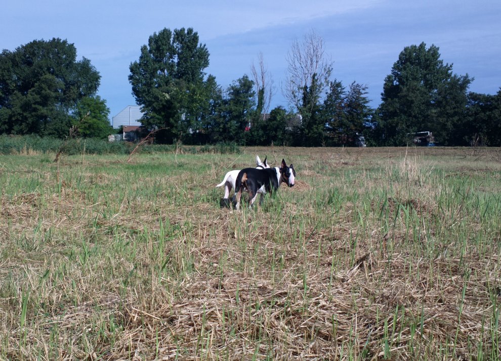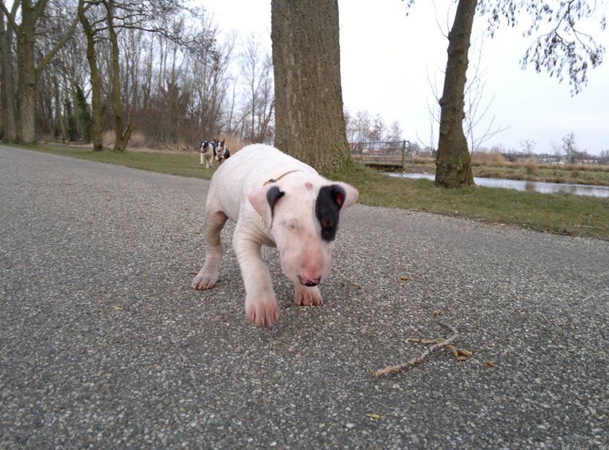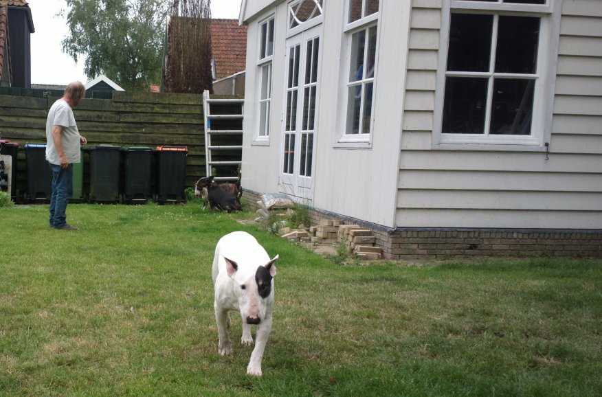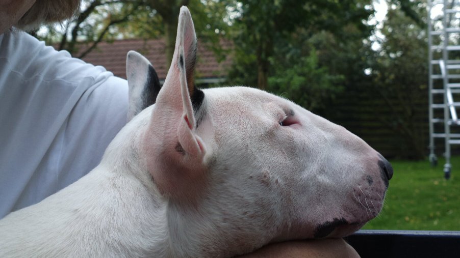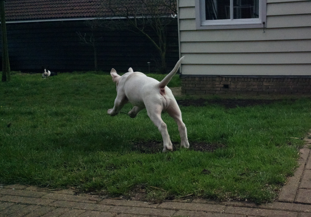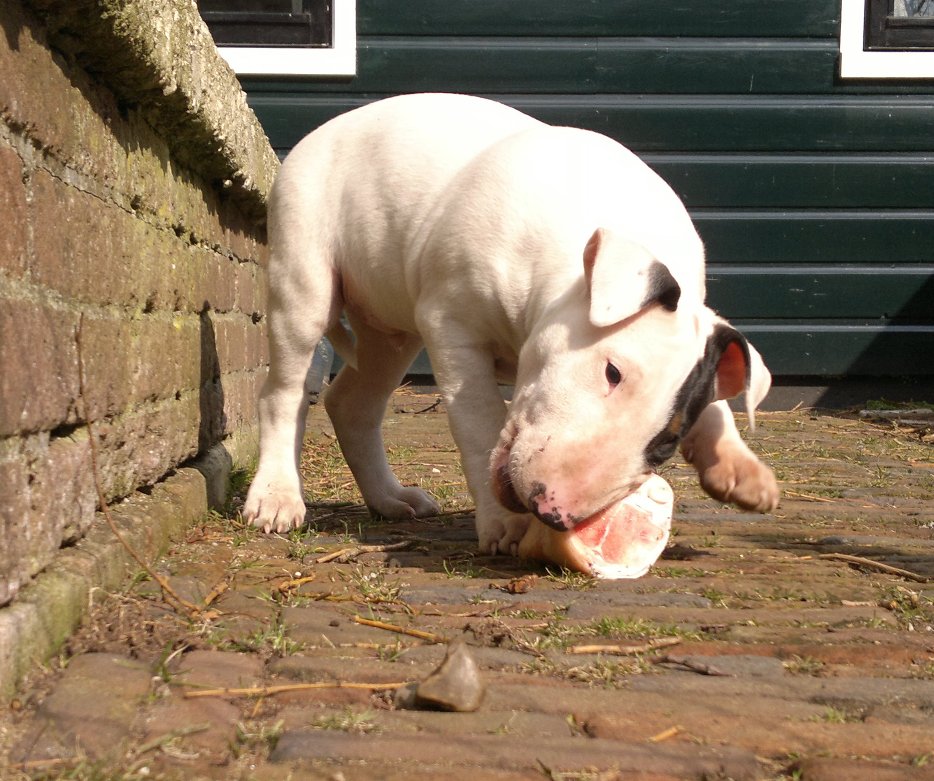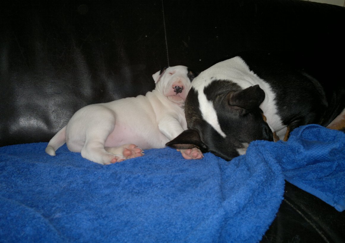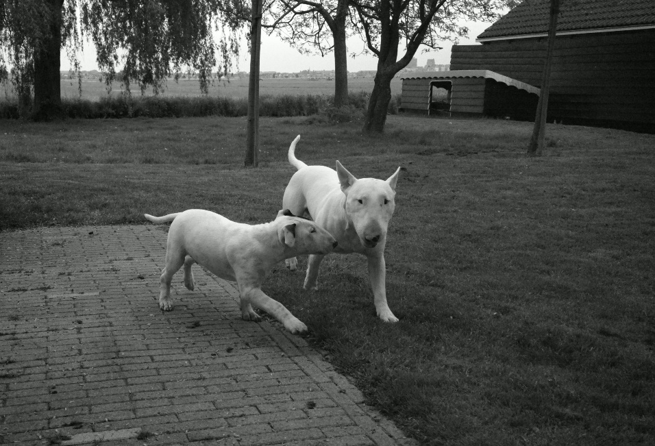 30 augustus 2019: leuk, vanmiddag Leo weer met Dessa's 9 weken oude BT pup Lady op bezoek. Het is zo'n snoesje... Wat zijn Bull Terriers toch een lieve, zorgzame en positief opvoedende honden!