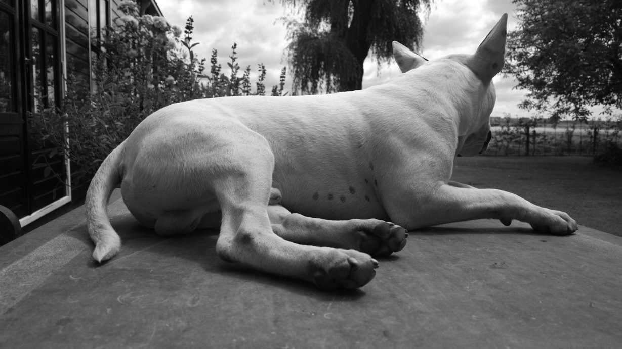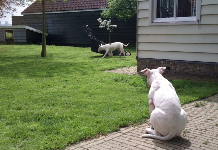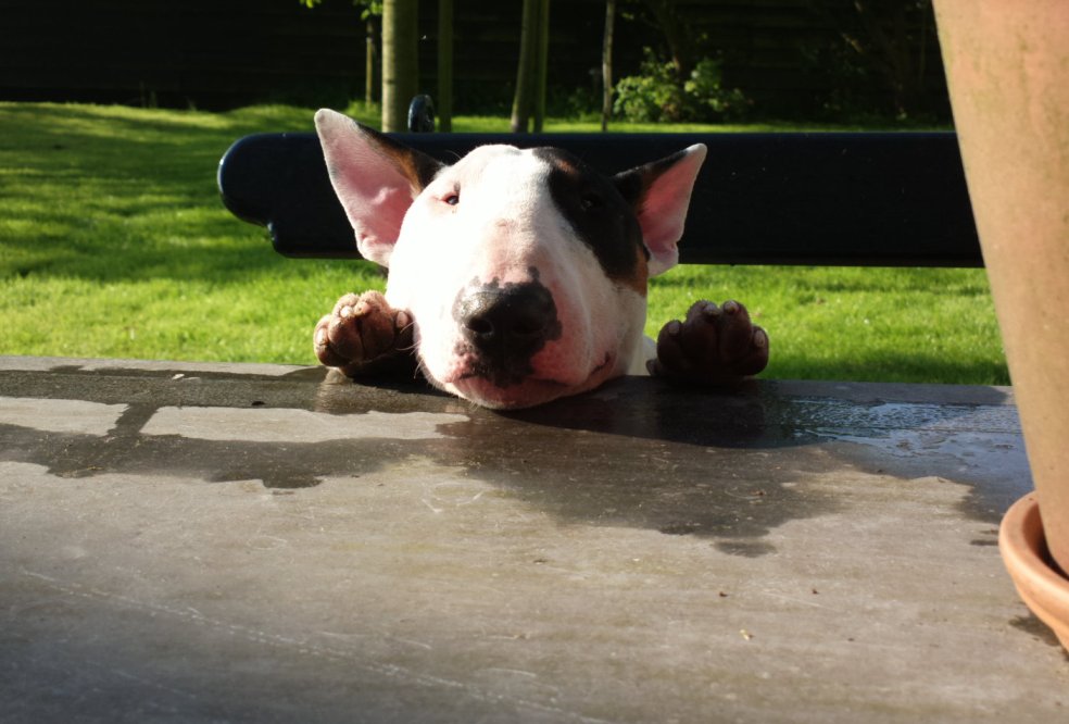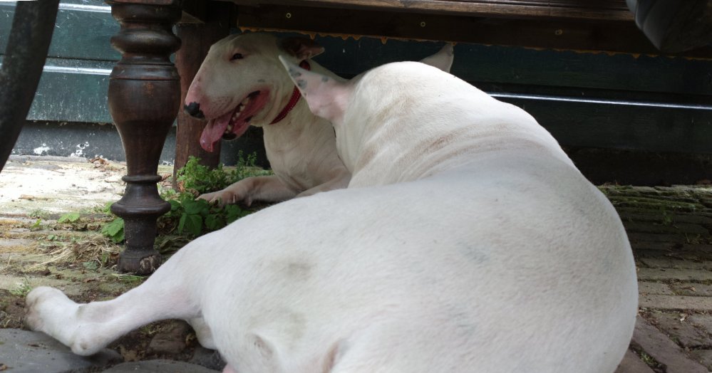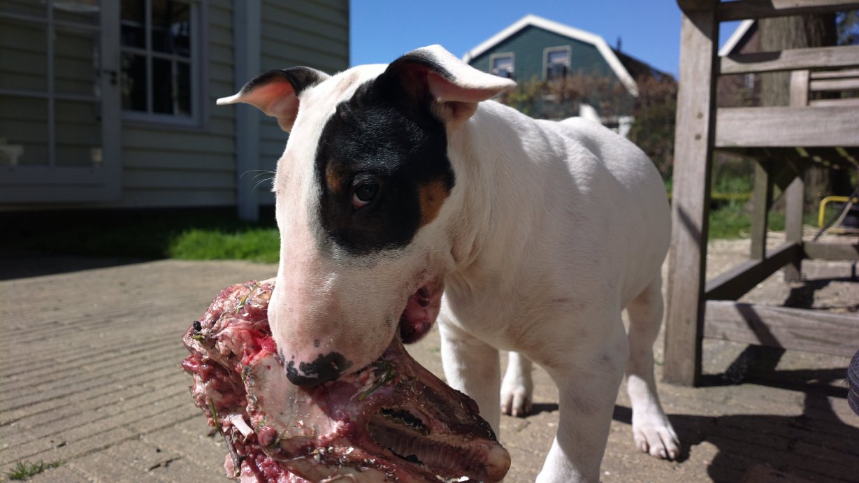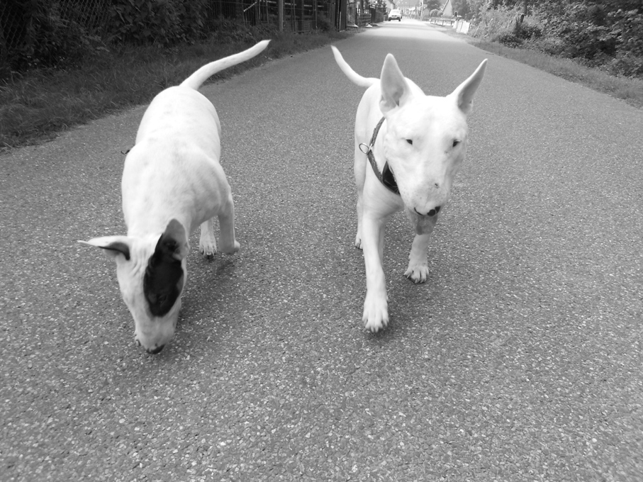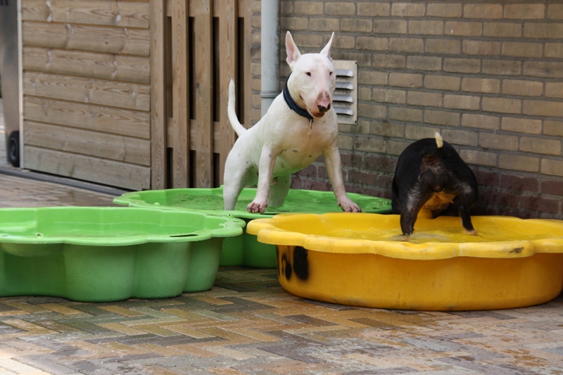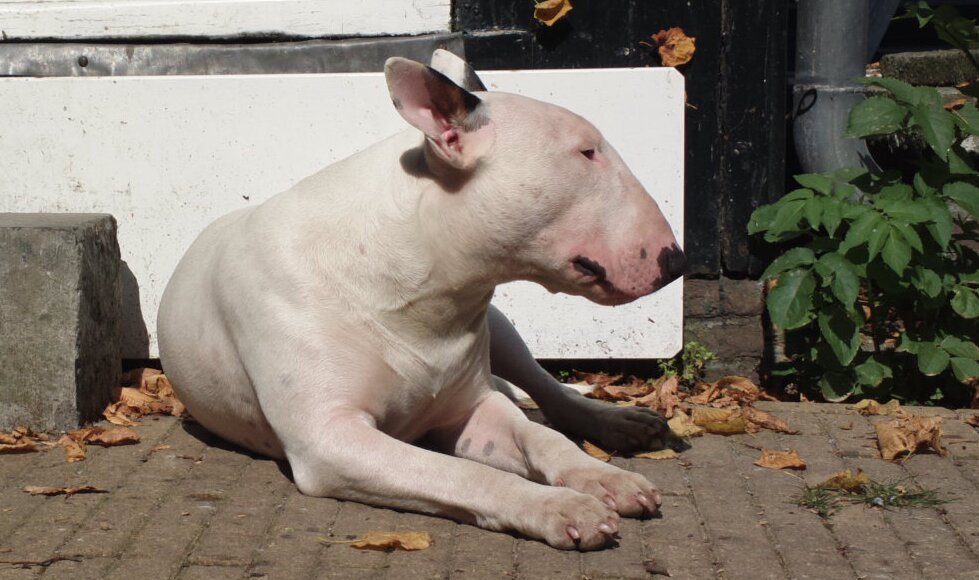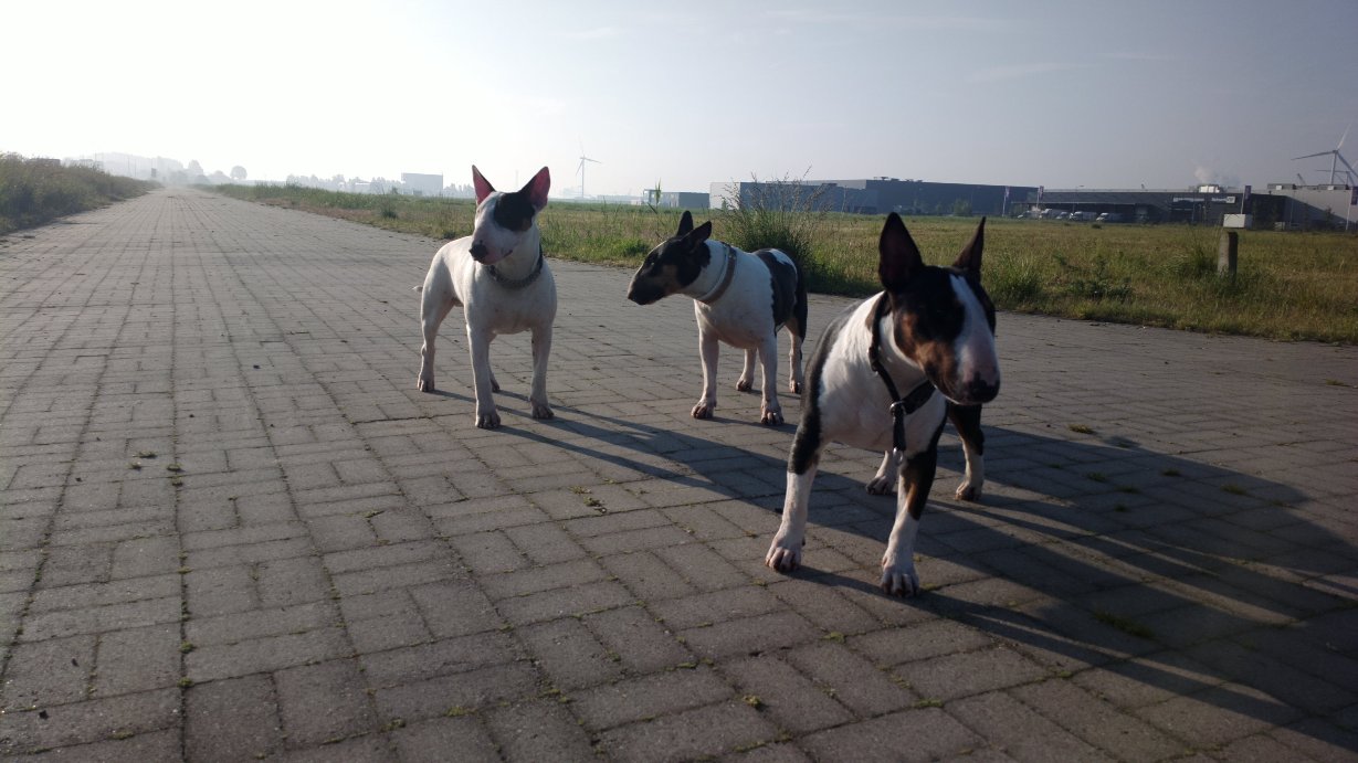 30 augustus 2019: leuk, vanmiddag Leo weer met Dessa's 9 weken oude BT pup Lady op bezoek. Het is zo'n snoesje... Wat zijn Bull Terriers toch een lieve, zorgzame en positief opvoedende honden!