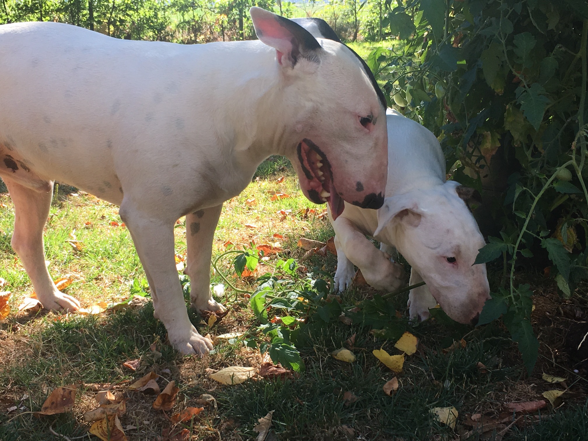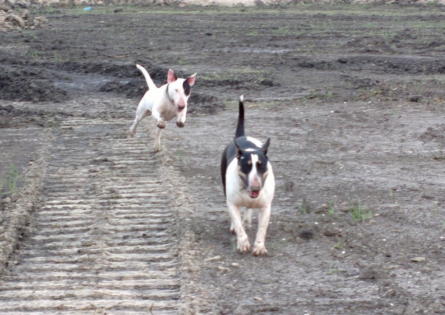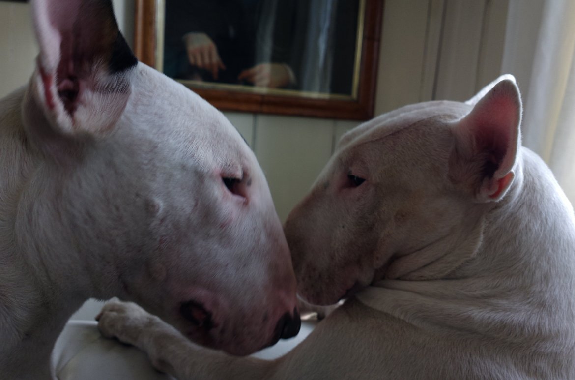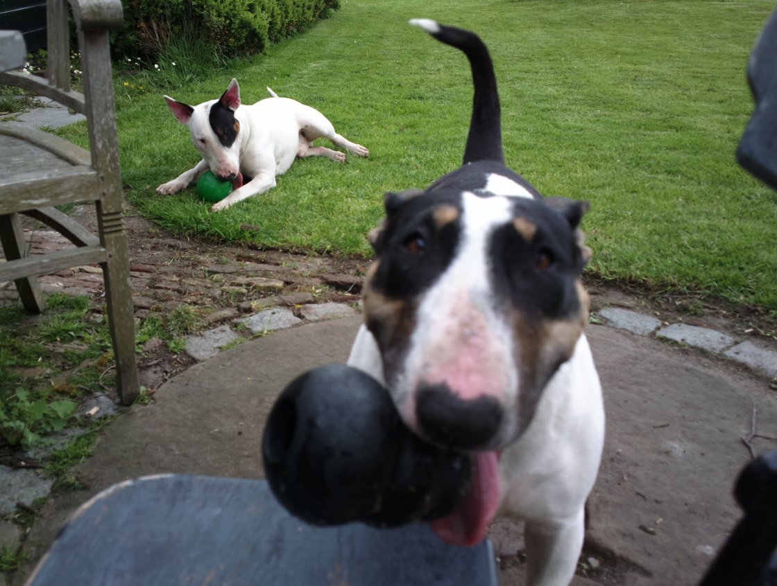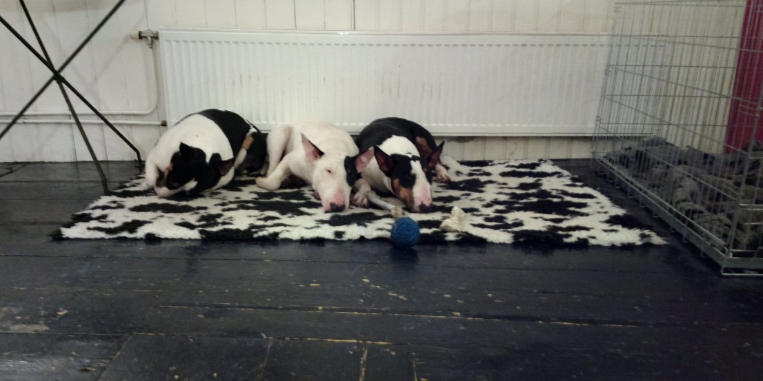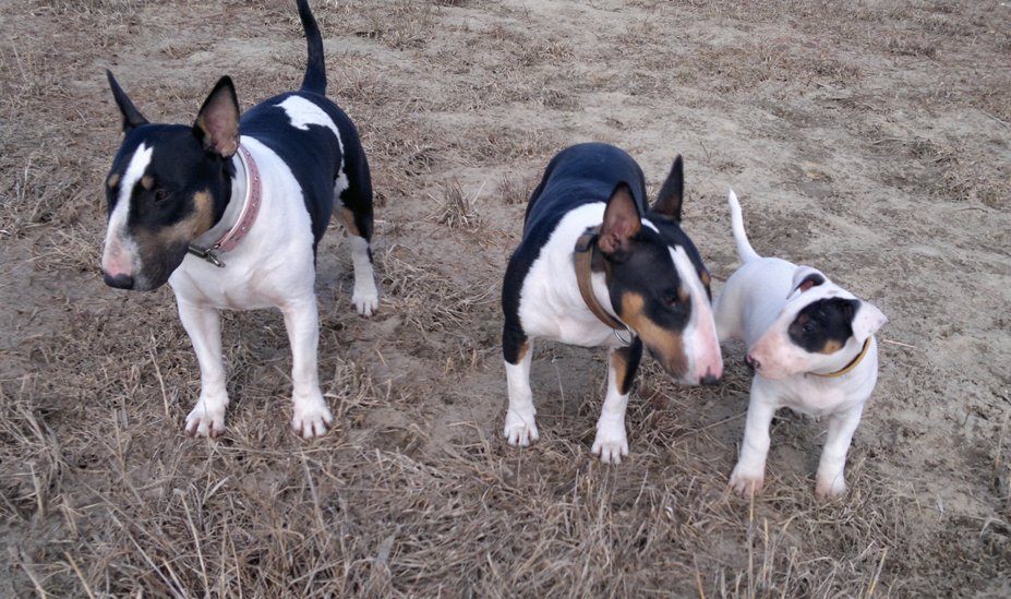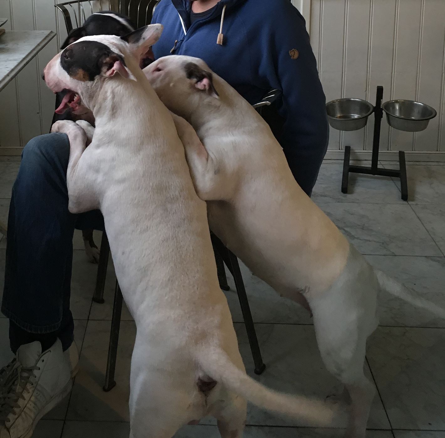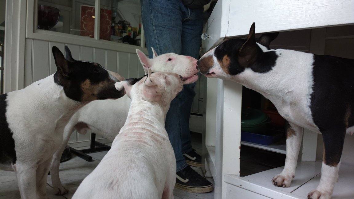 Very excited Bull Terriers: we're about to play the chase the doggy biscuits game J