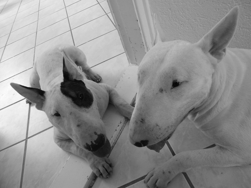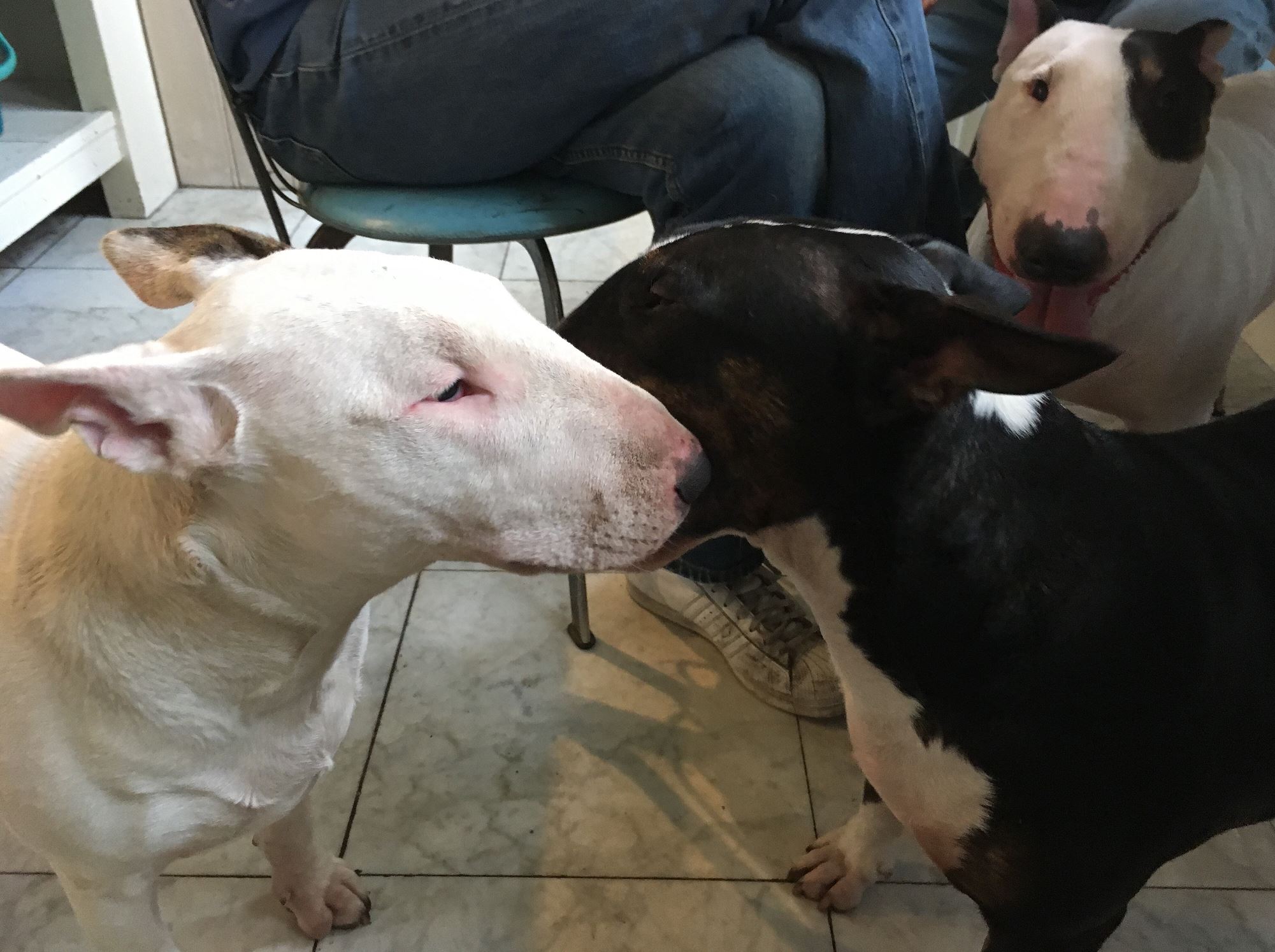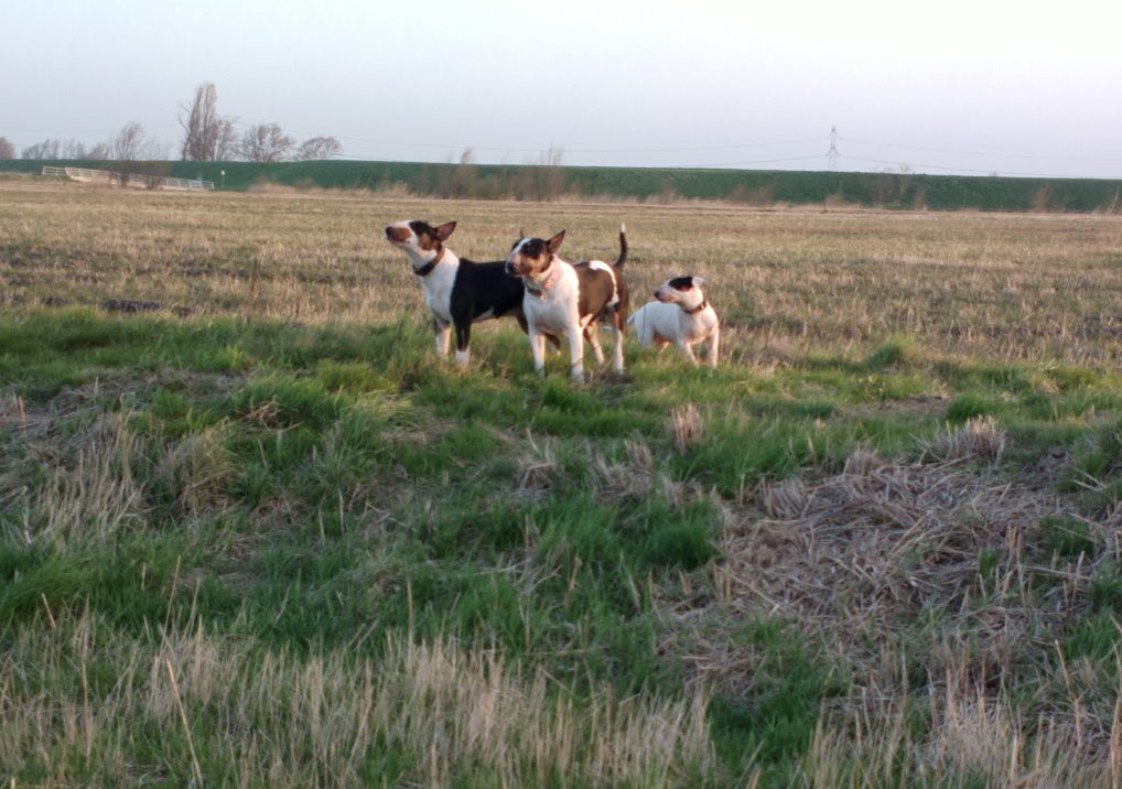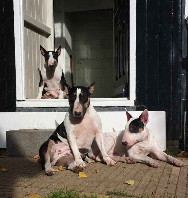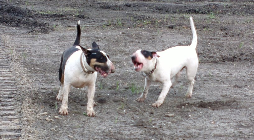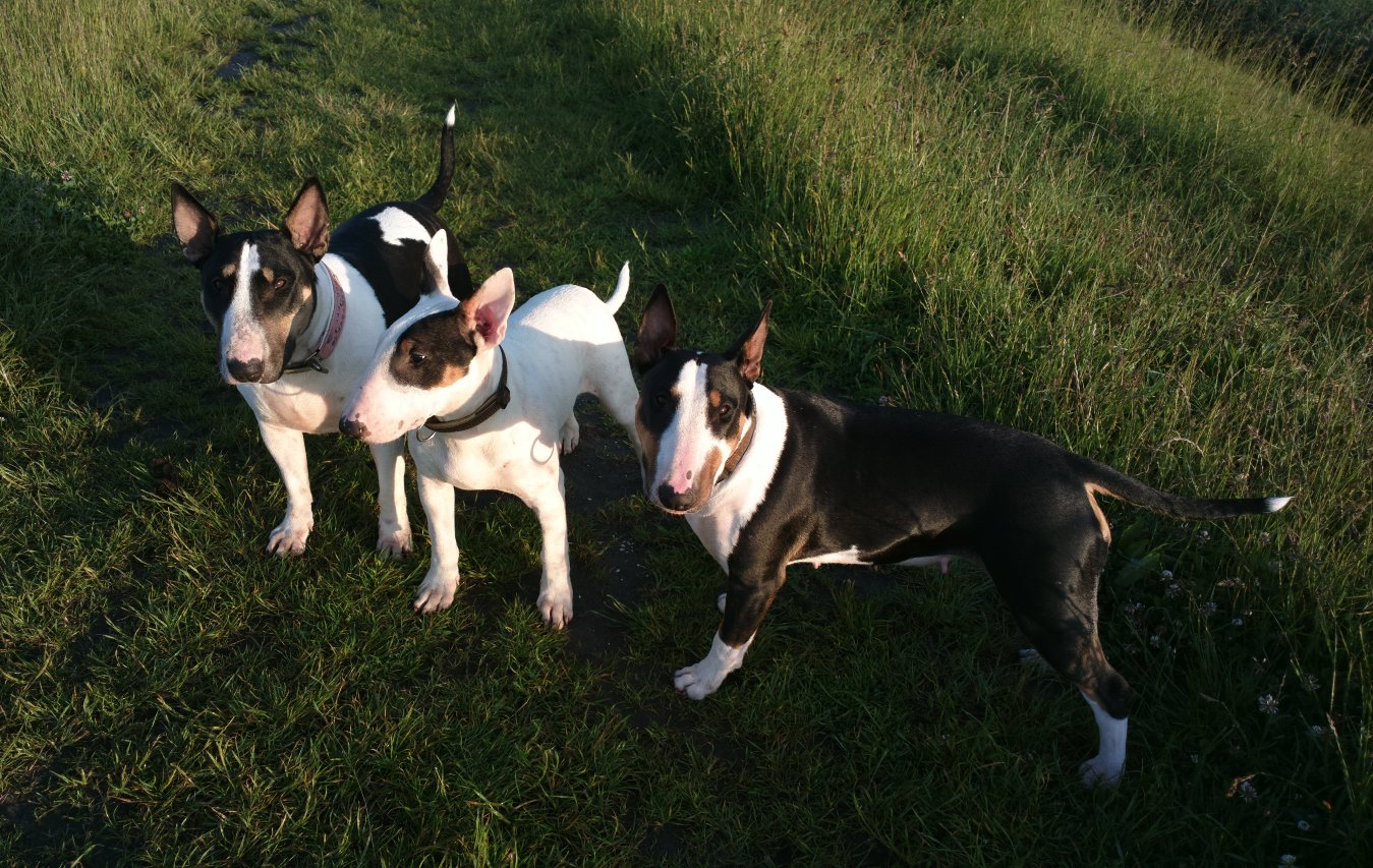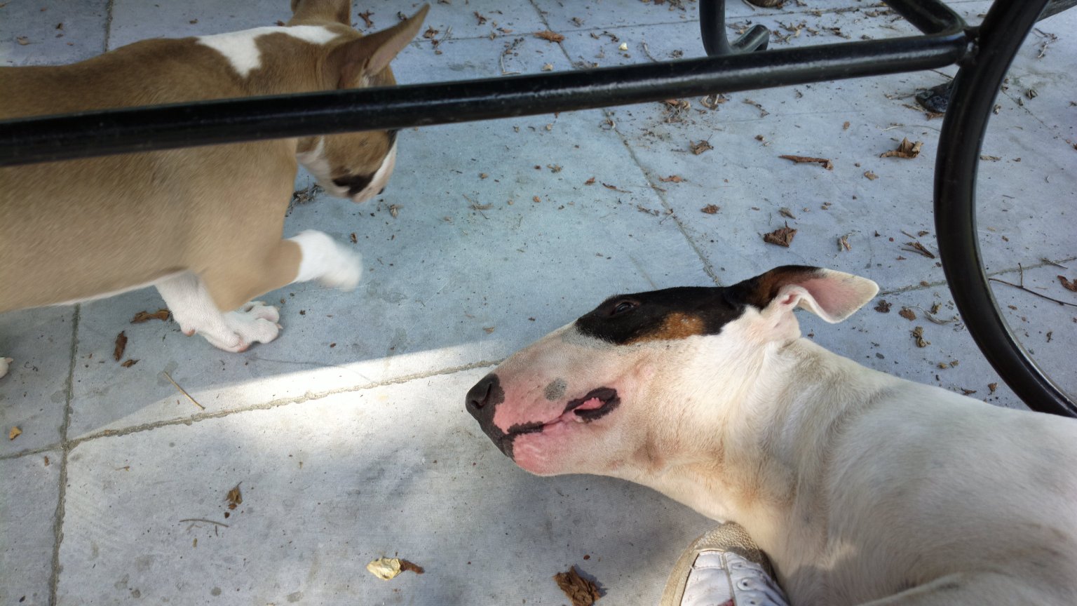 Very excited Bull Terriers: we're about to play the chase the doggy biscuits game J