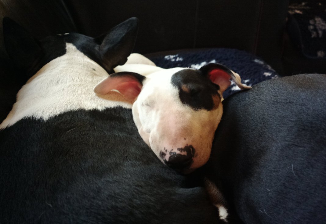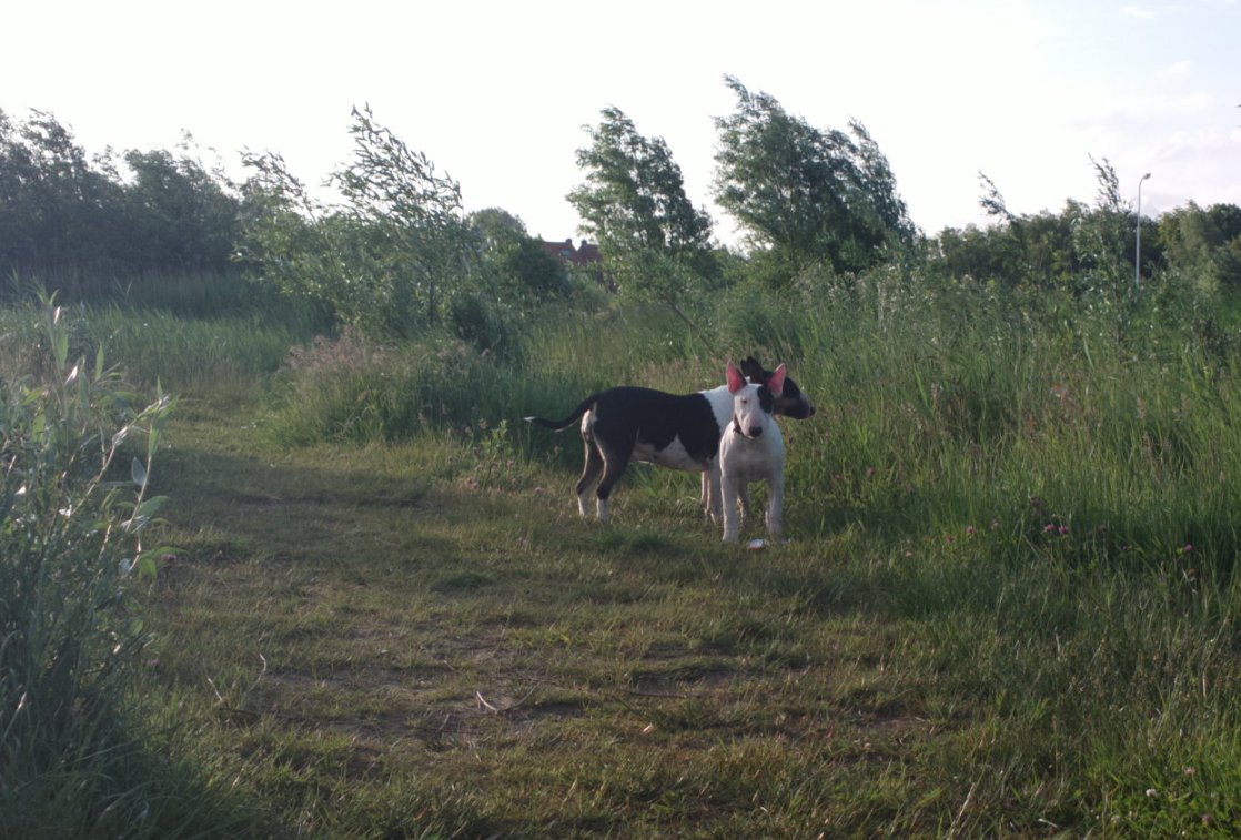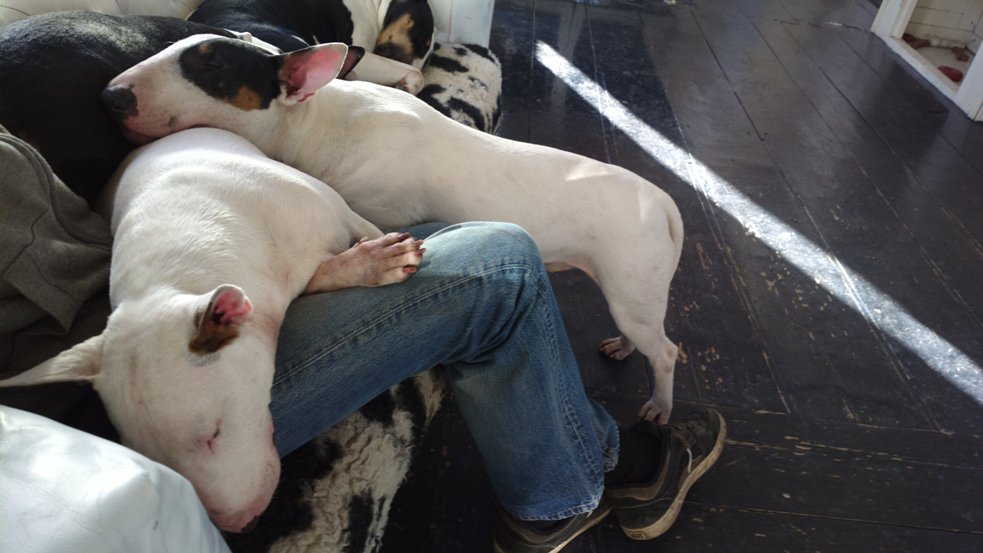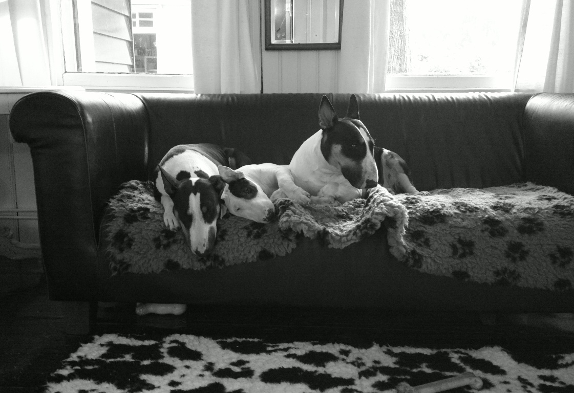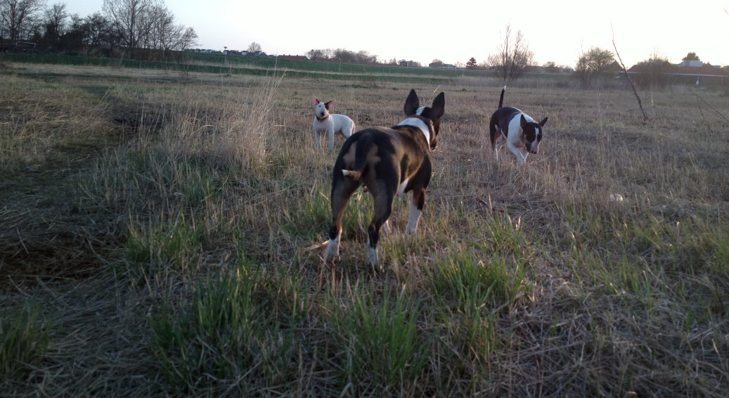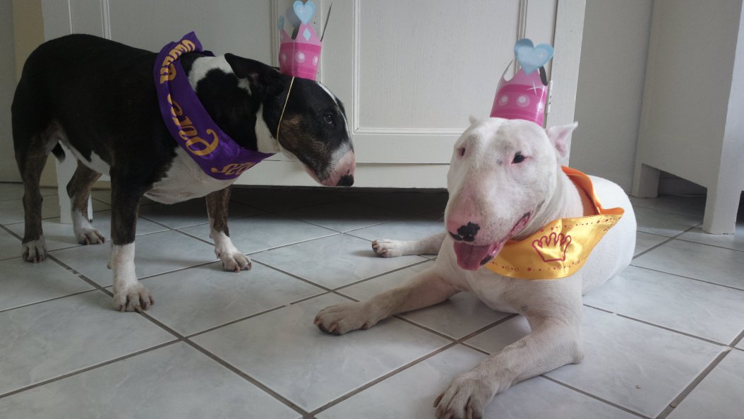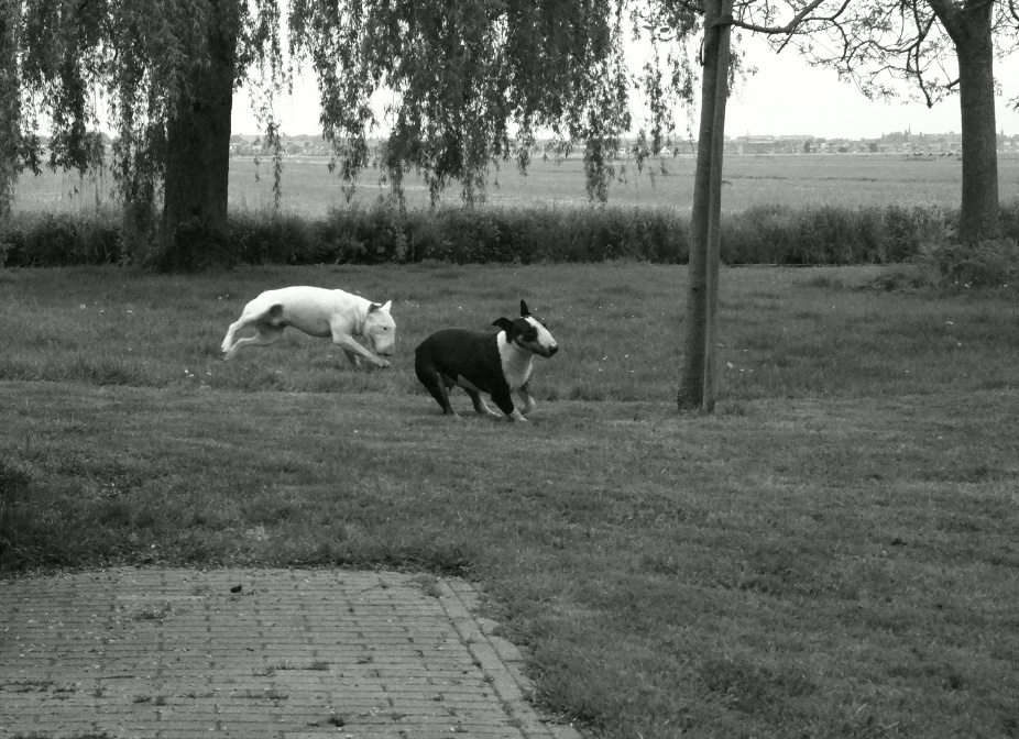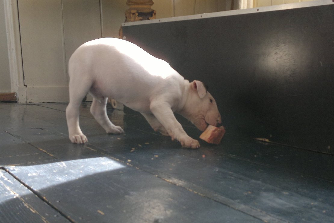 Very excited Bull Terriers: we're about to play the chase the doggy biscuits game J