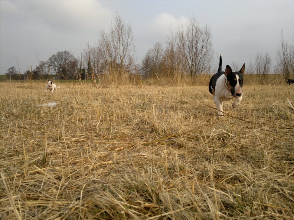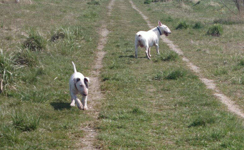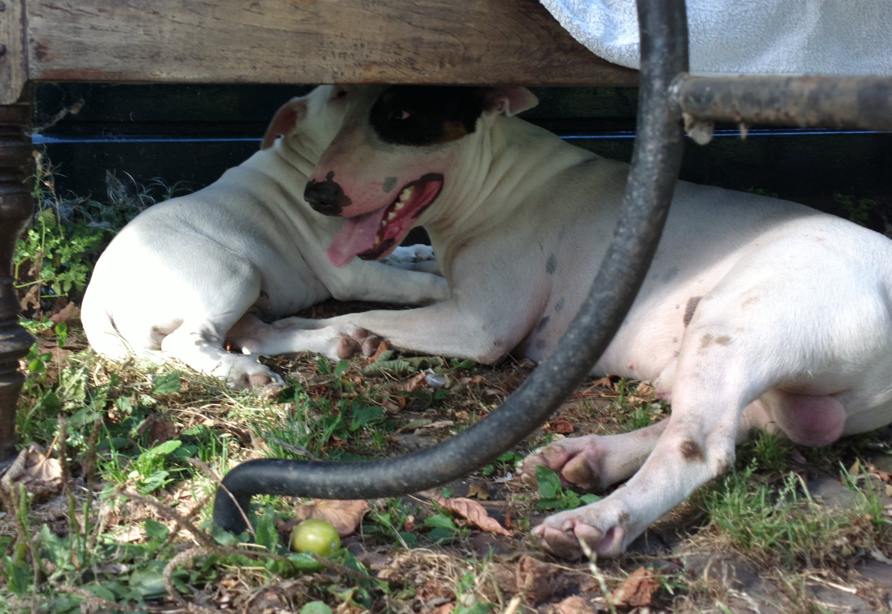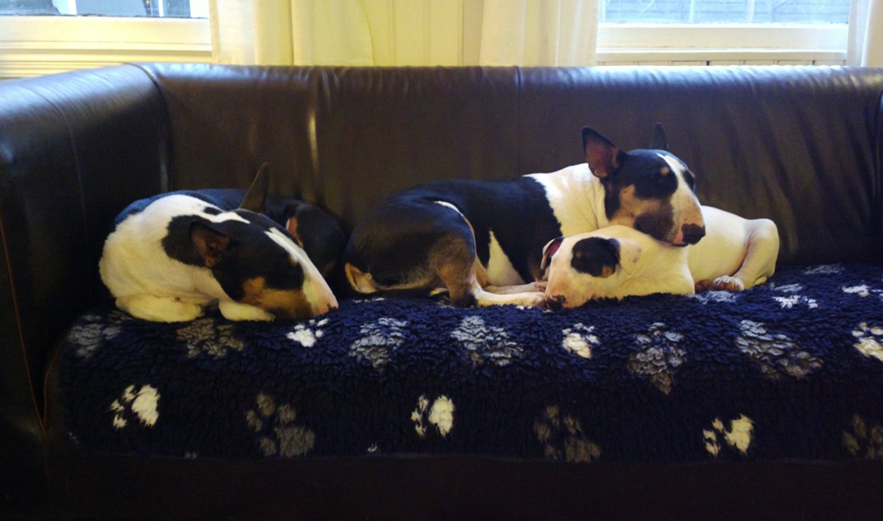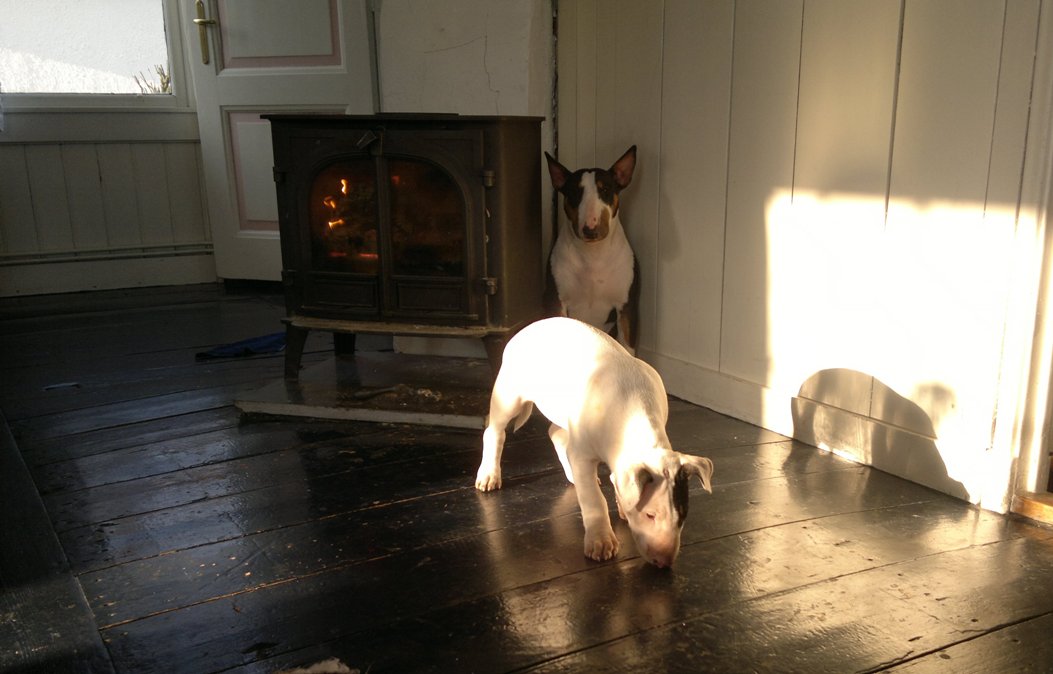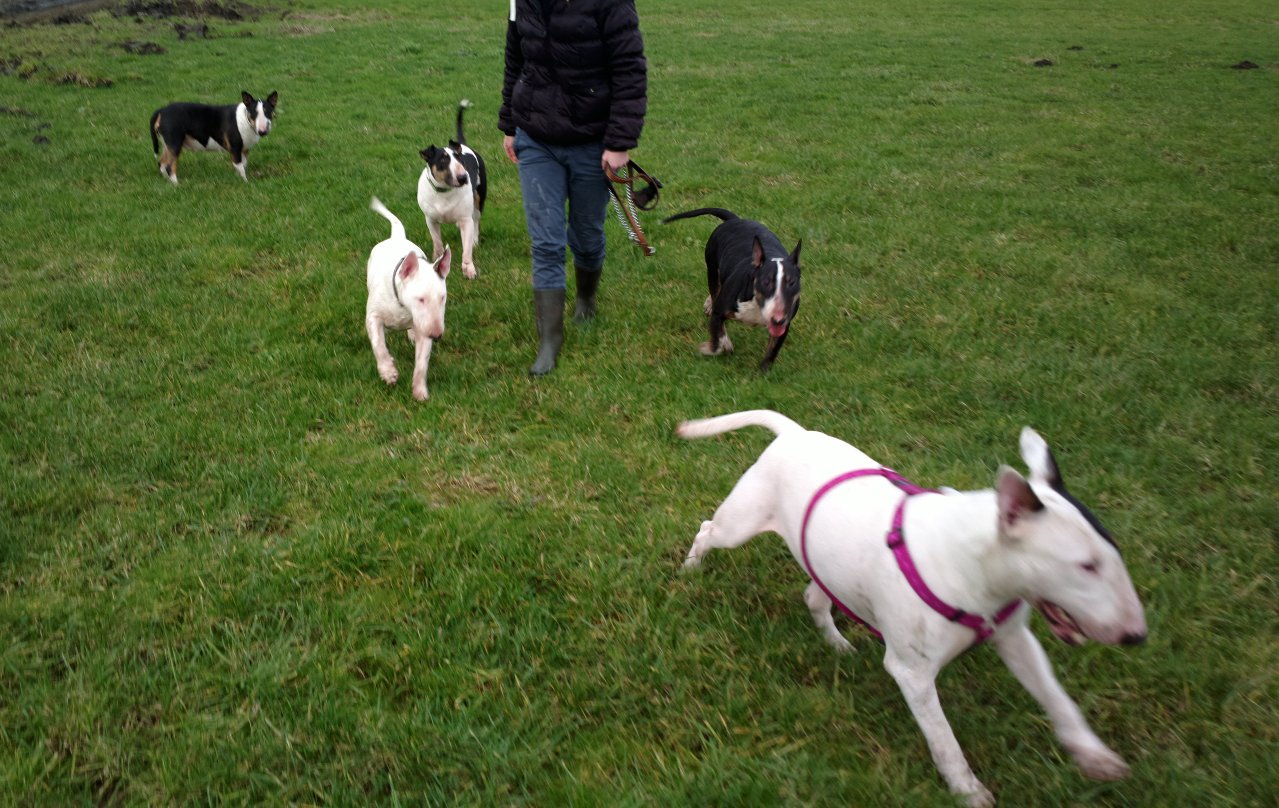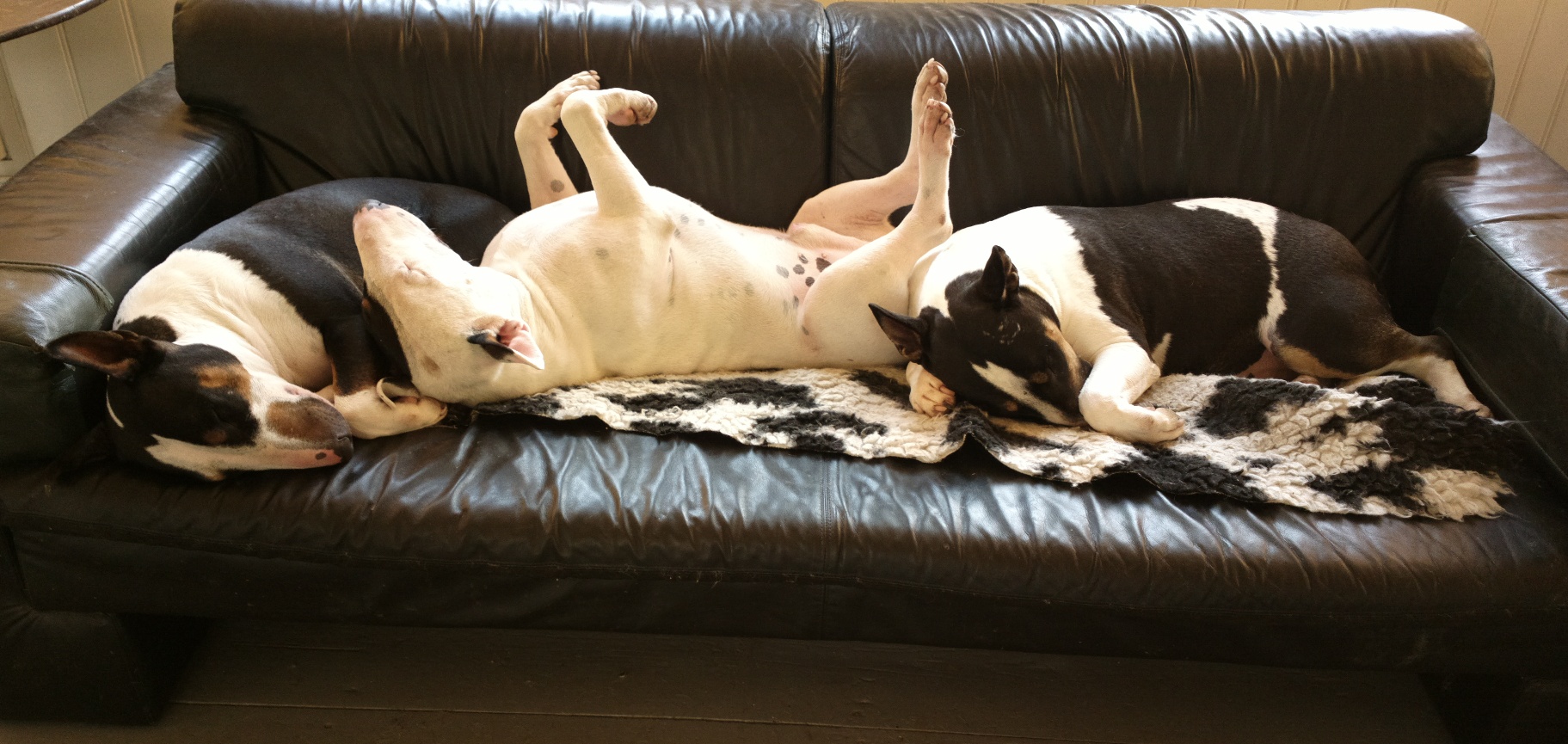 Very excited Bull Terriers: we're about to play the chase the doggy biscuits game J