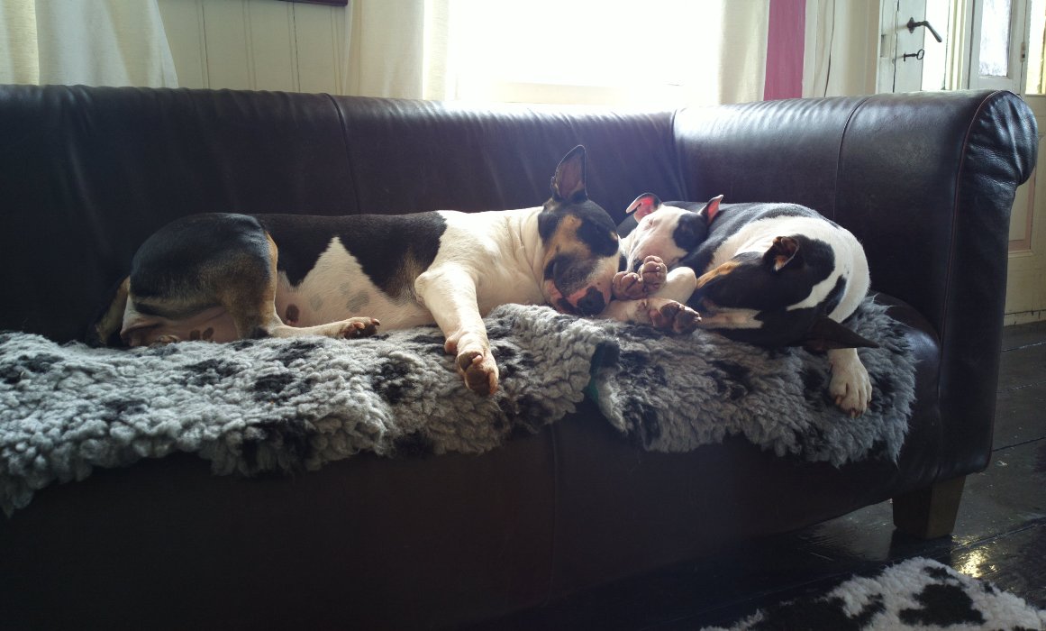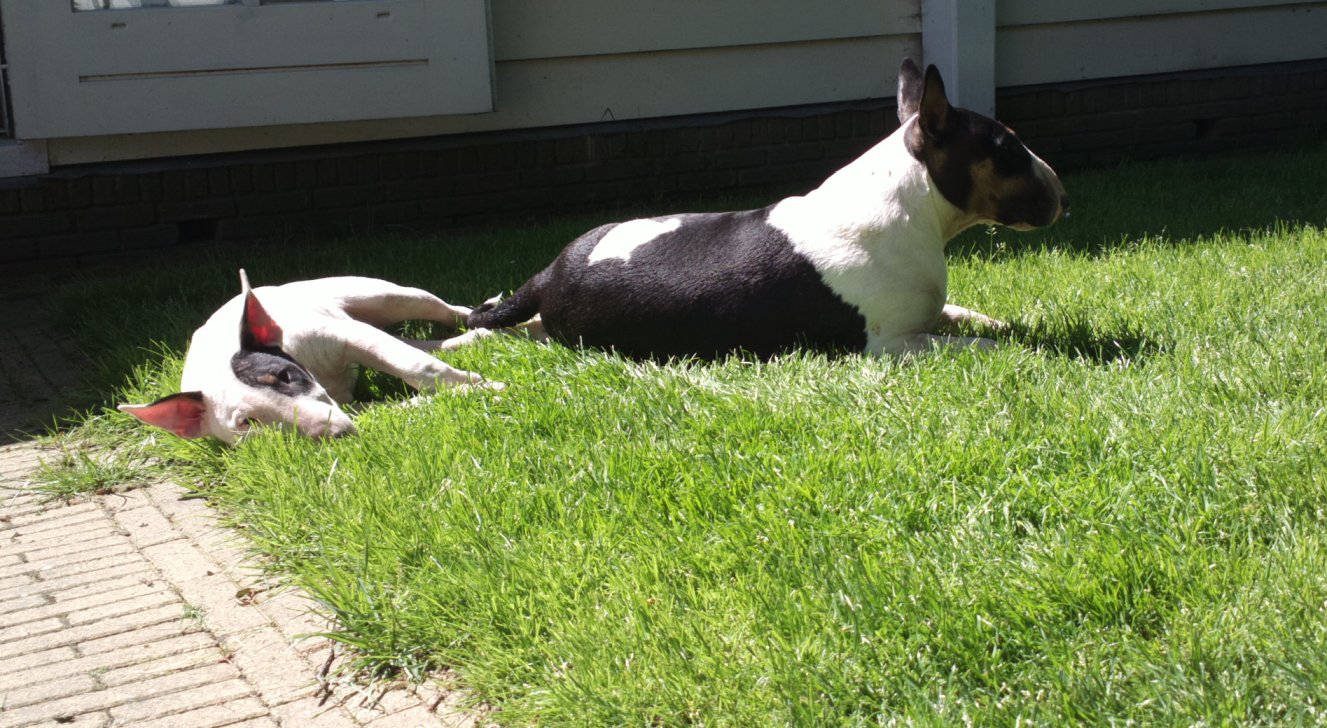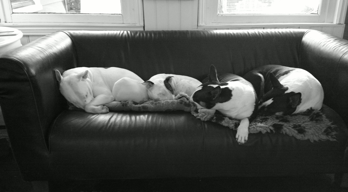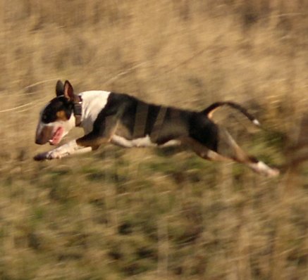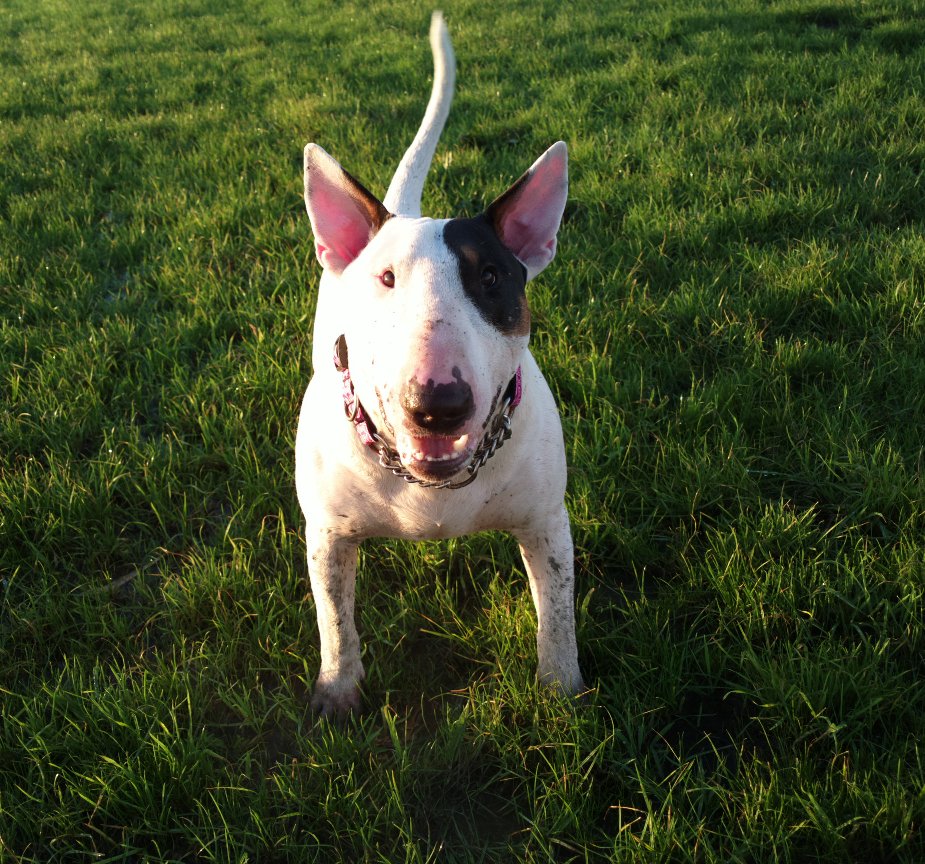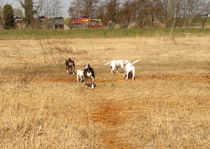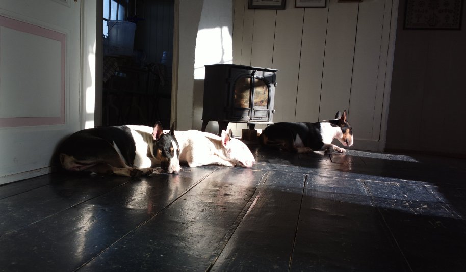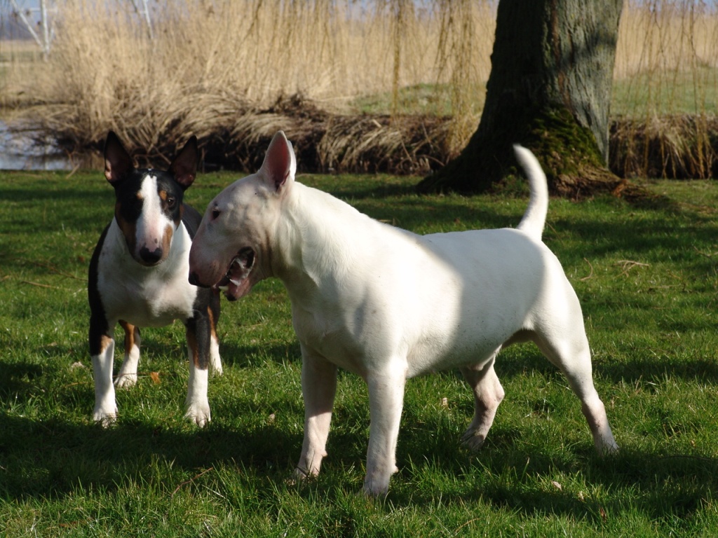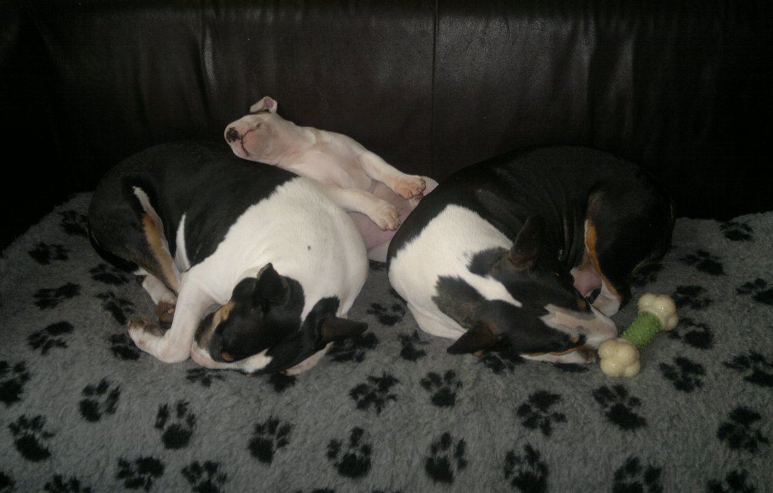 Very excited Bull Terriers: we're about to play the chase the doggy biscuits game J