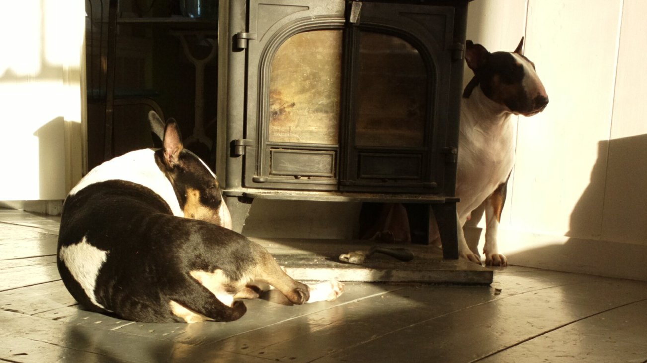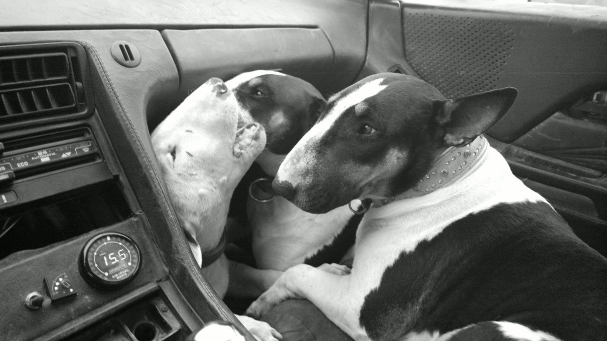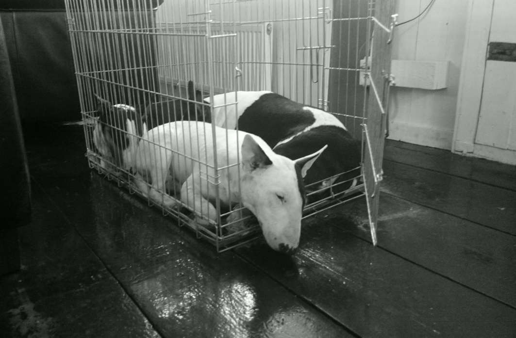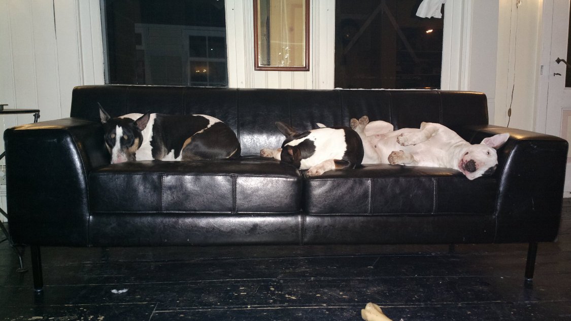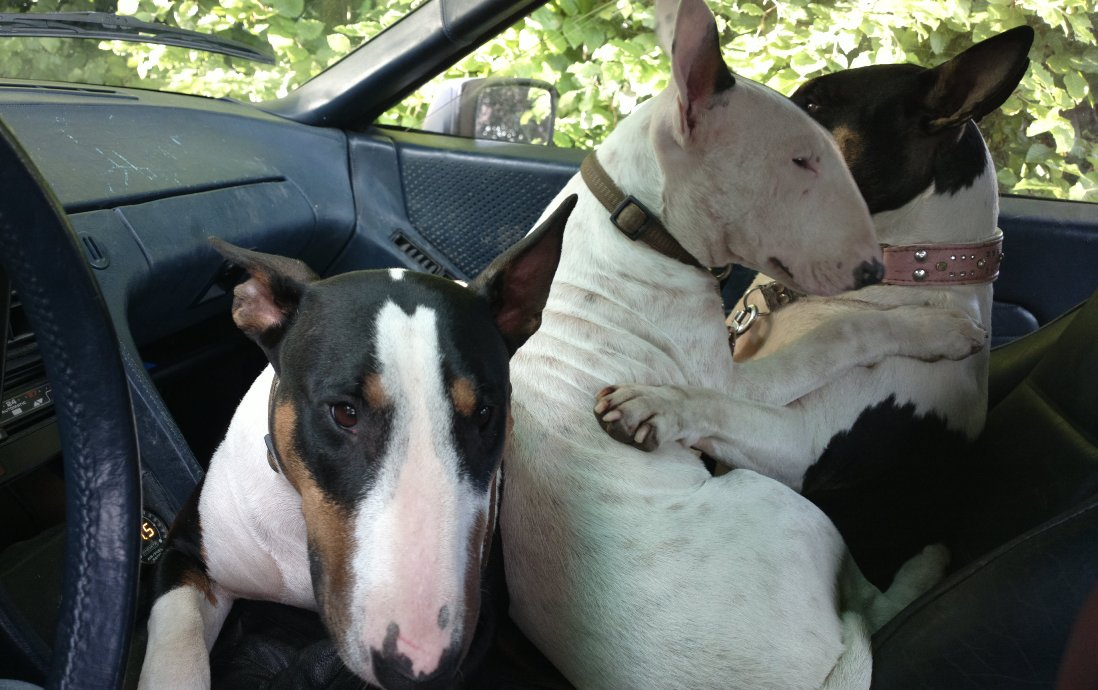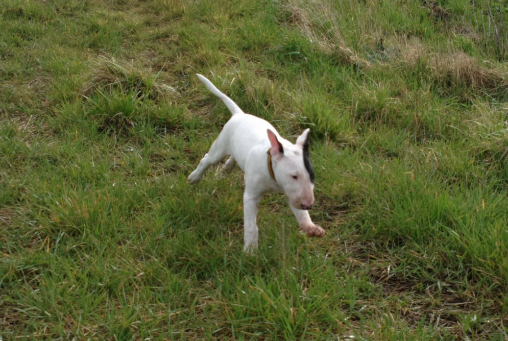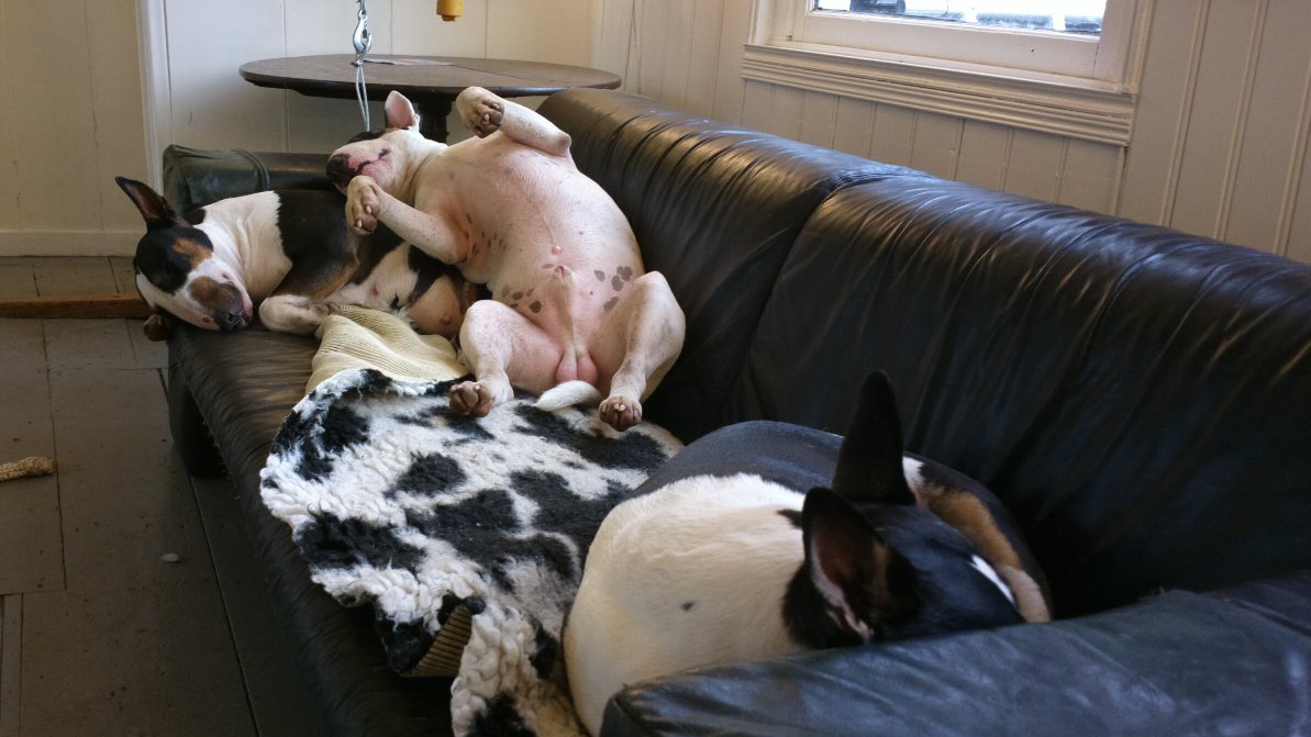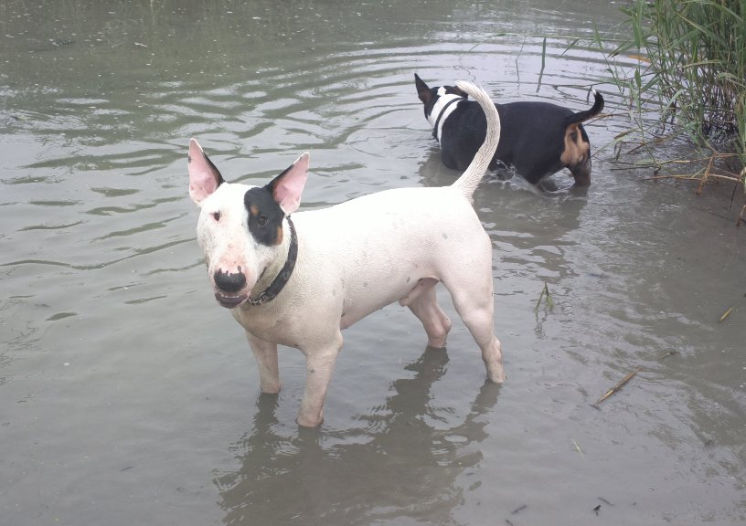 Very excited Bull Terriers: we're about to play the chase the doggy biscuits game J