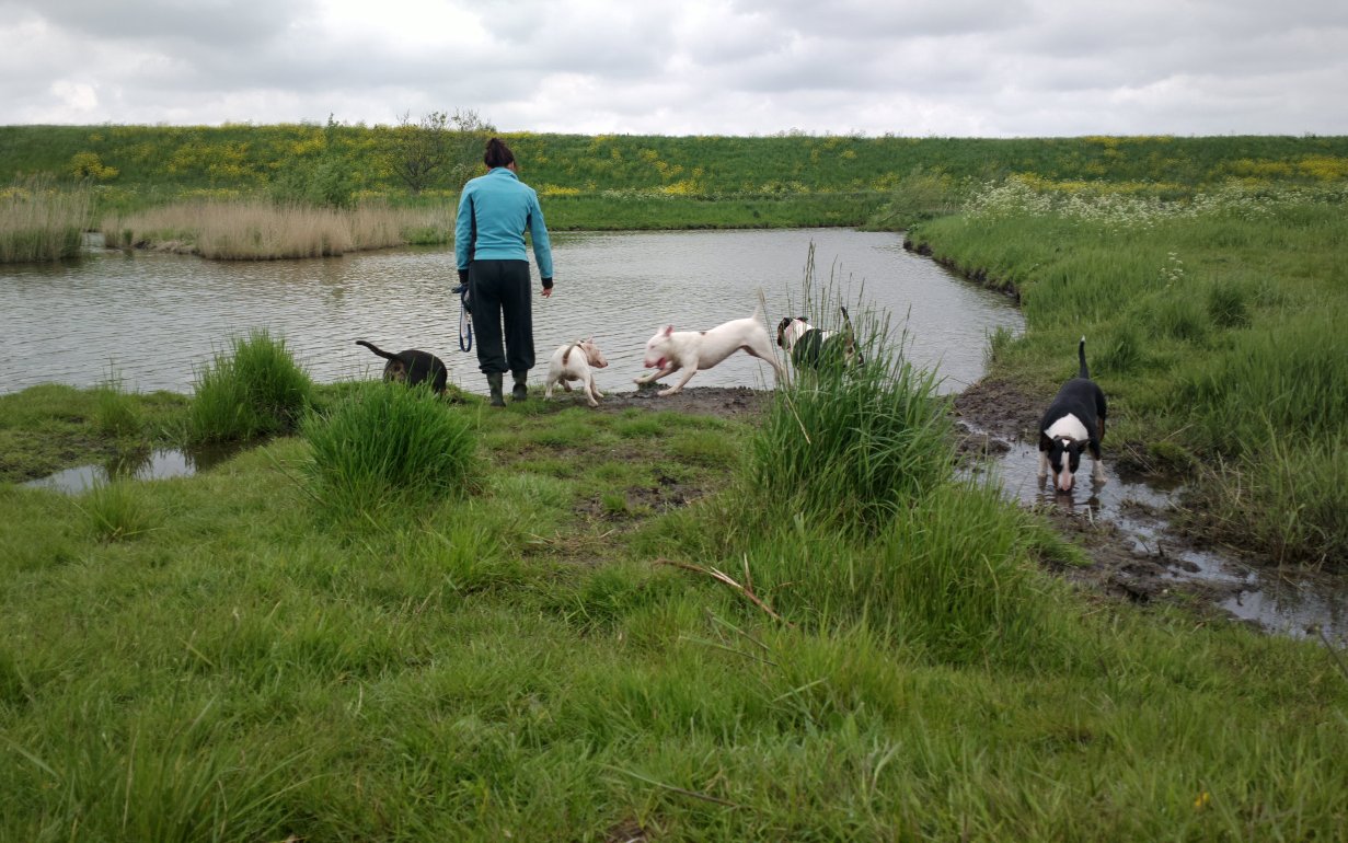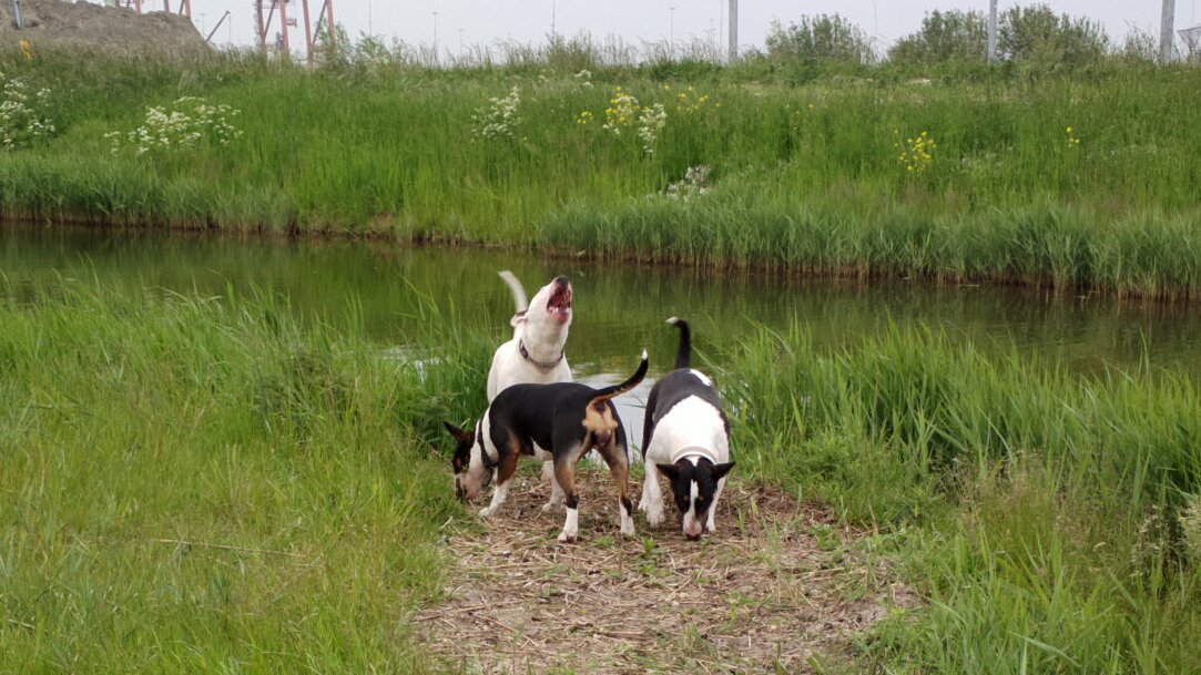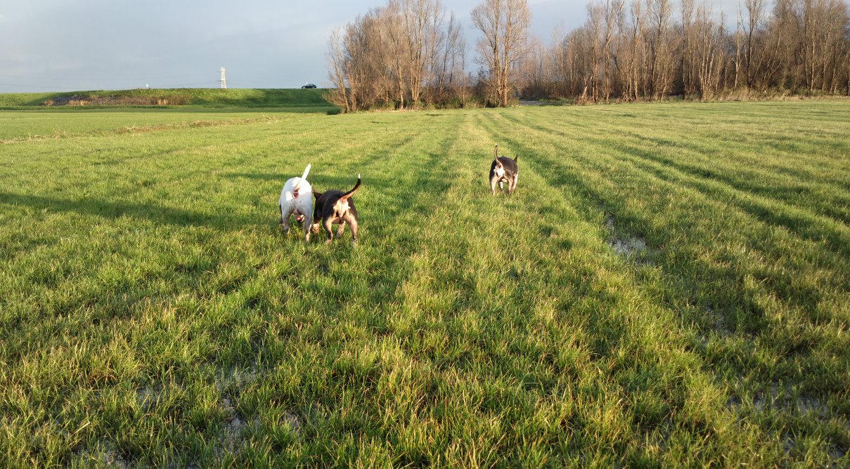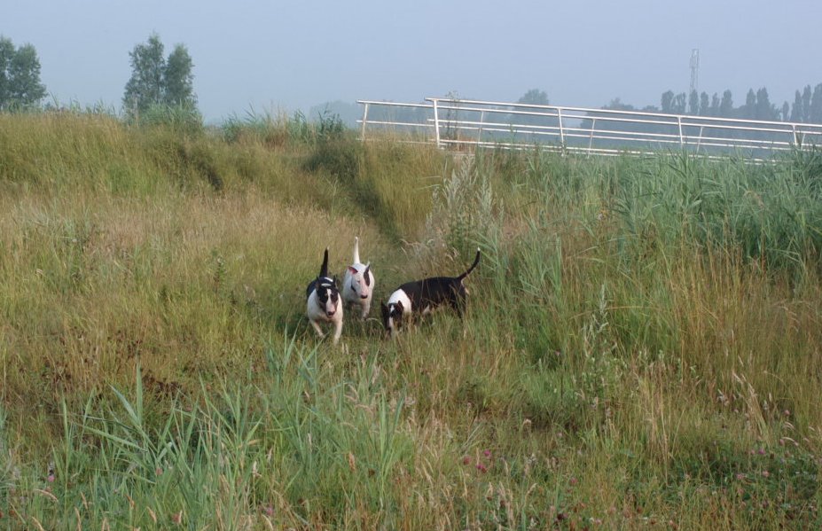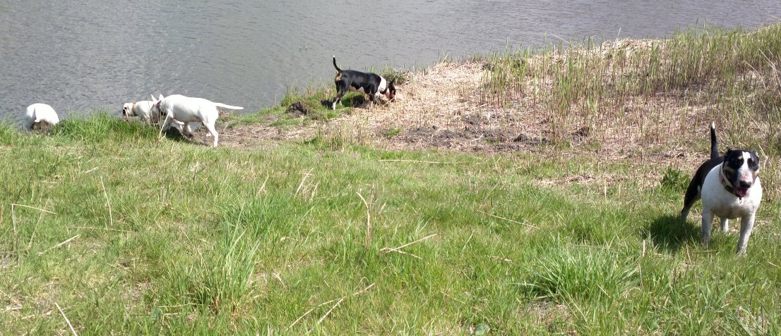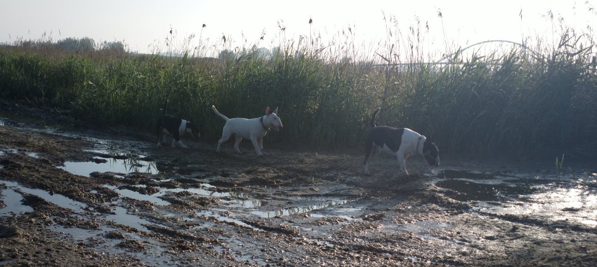 11 oktober 2015: mooie ochtend! De drie varkhondjes jagen op Nils en zijn vriendjes, rennen keihard terug voor een koekje en Sue doet weer even 'submarine' in de sloot. Alles goed met het roedel.