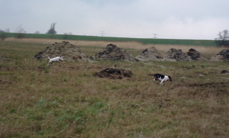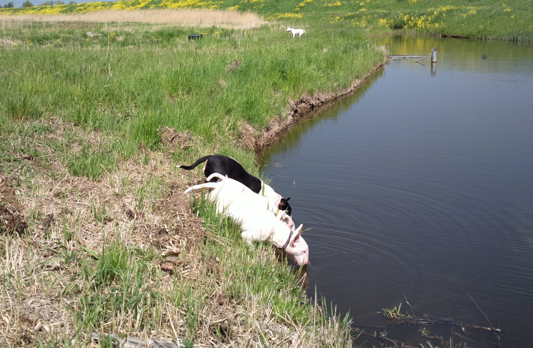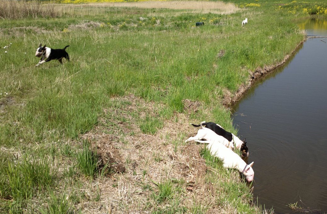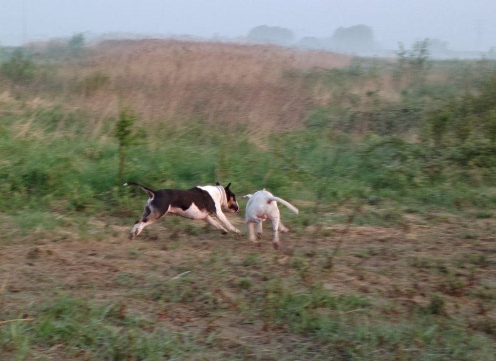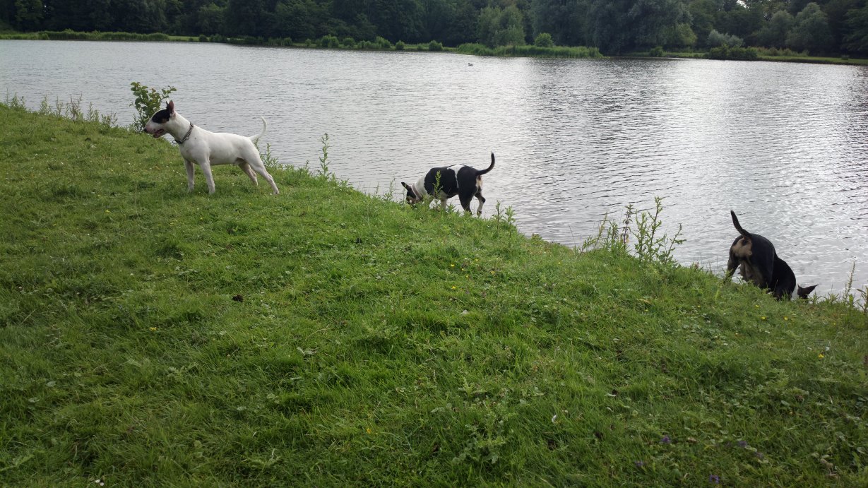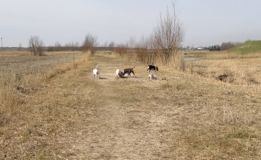 11 oktober 2015: mooie ochtend! De drie varkhondjes jagen op Nils en zijn vriendjes, rennen keihard terug voor een koekje en Sue doet weer even 'submarine' in de sloot. Alles goed met het roedel.