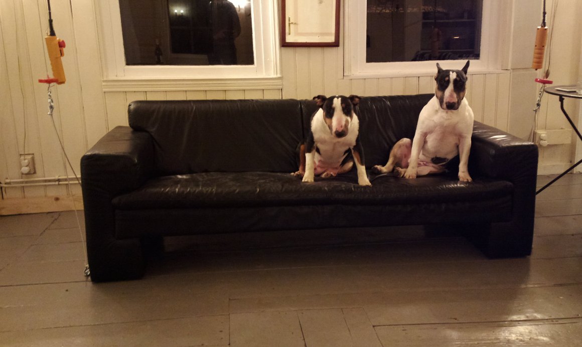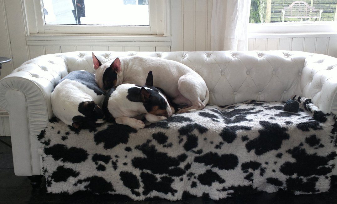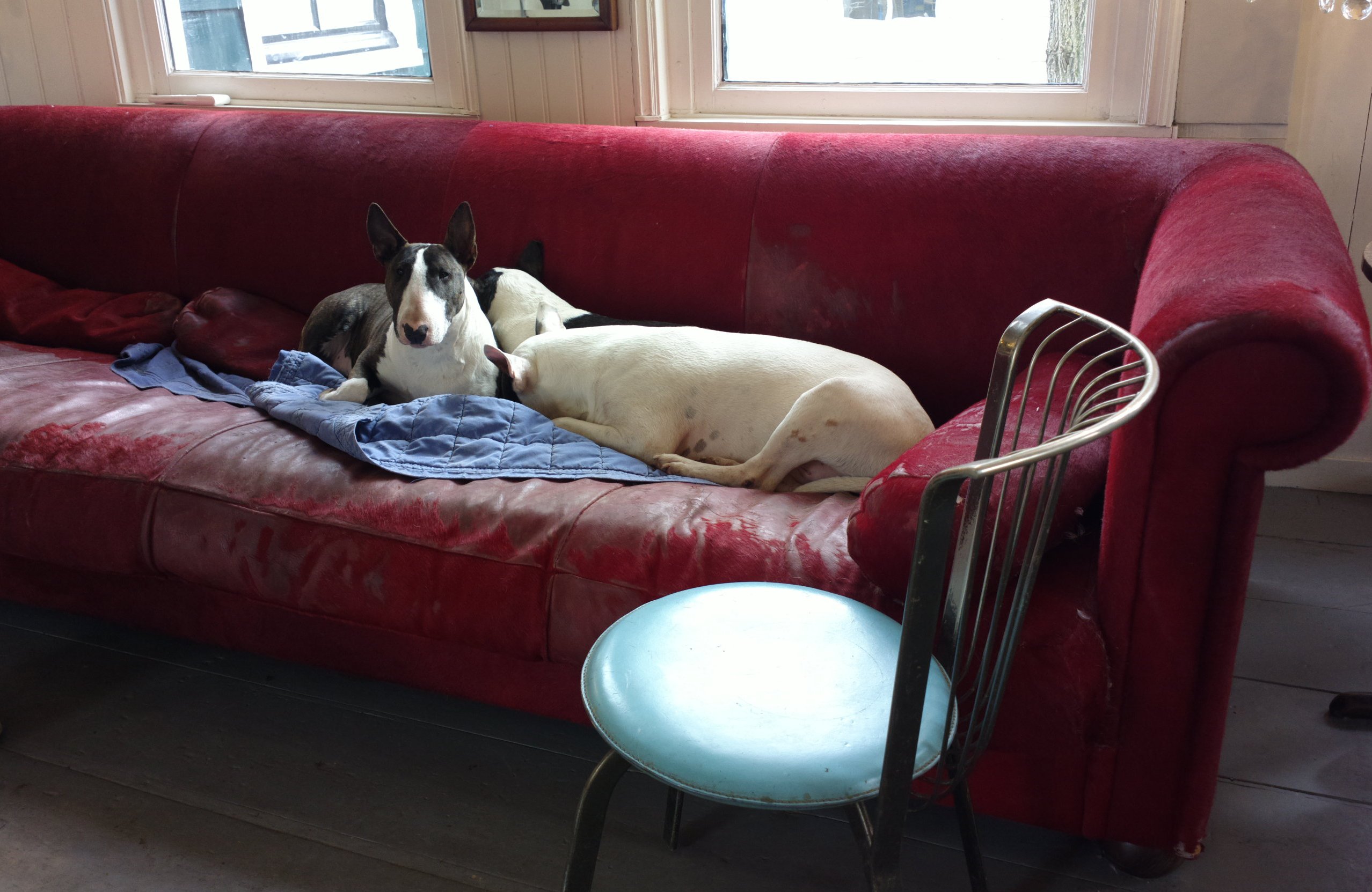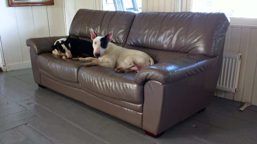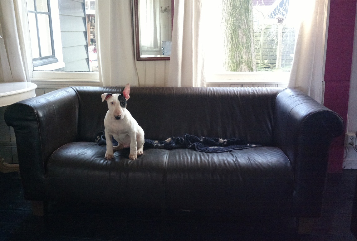 29 december 2014: nadat Sue in totaal vier bankstellen vernietigd heeft, allen op momenten dat ik er niet bij was, begon zelfs ik hier een beetje flauw van te worden. Uiteraard ben ik wel wat gewend, Gladys was goed voor twee bankstellen, Tess voor drie, maar dit wordt zelfs voor mij te gek. En voor Sue, die grote delen Skai en Leer opat. Ik heb echt van alles geprobeerd, liters anti-knabbel spray, een webcam zodat ik hem op afstand verbaal via mijn pc speaker kon corrigeren mocht hij weer zo'n bui krijgen, 3 x verbaal corrigeren, en dan moest het over zijn toch? Dit leek een dag perfect te werken, de hele dag hield ik hem via Skype in de gaten, hij gedroeg zich poeslief, maar volgens mij had hij door dat hij bekeken werd, wellicht hoorde hij mij via de microfoon op mijn werk? Afijn, ik zet de werk pc uit waardoor de Skype verbinding verbrak, reed in twintig minuten naar huis, hap uit het door Jack en Yvette gedoneerde bankstel. Gdvrdmme. Ook hebben we weken zonder bankstel geleefd, gezellig samen op de grond op een vetbedje (uren kleermakerszit ben ik te oud voor ;-), en staat nu ongeveer een maand de houten tuinbank in de huiskamer, met een vetbedje erop, geen centje pijn, die blijft wel heel.