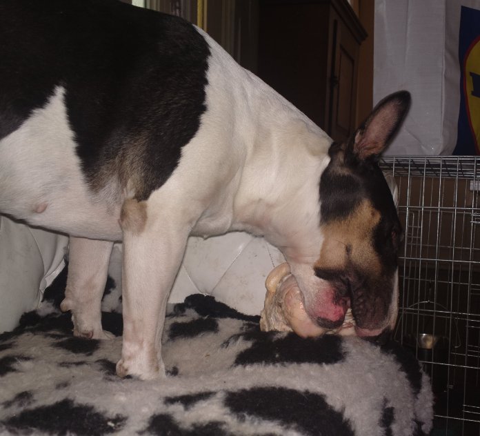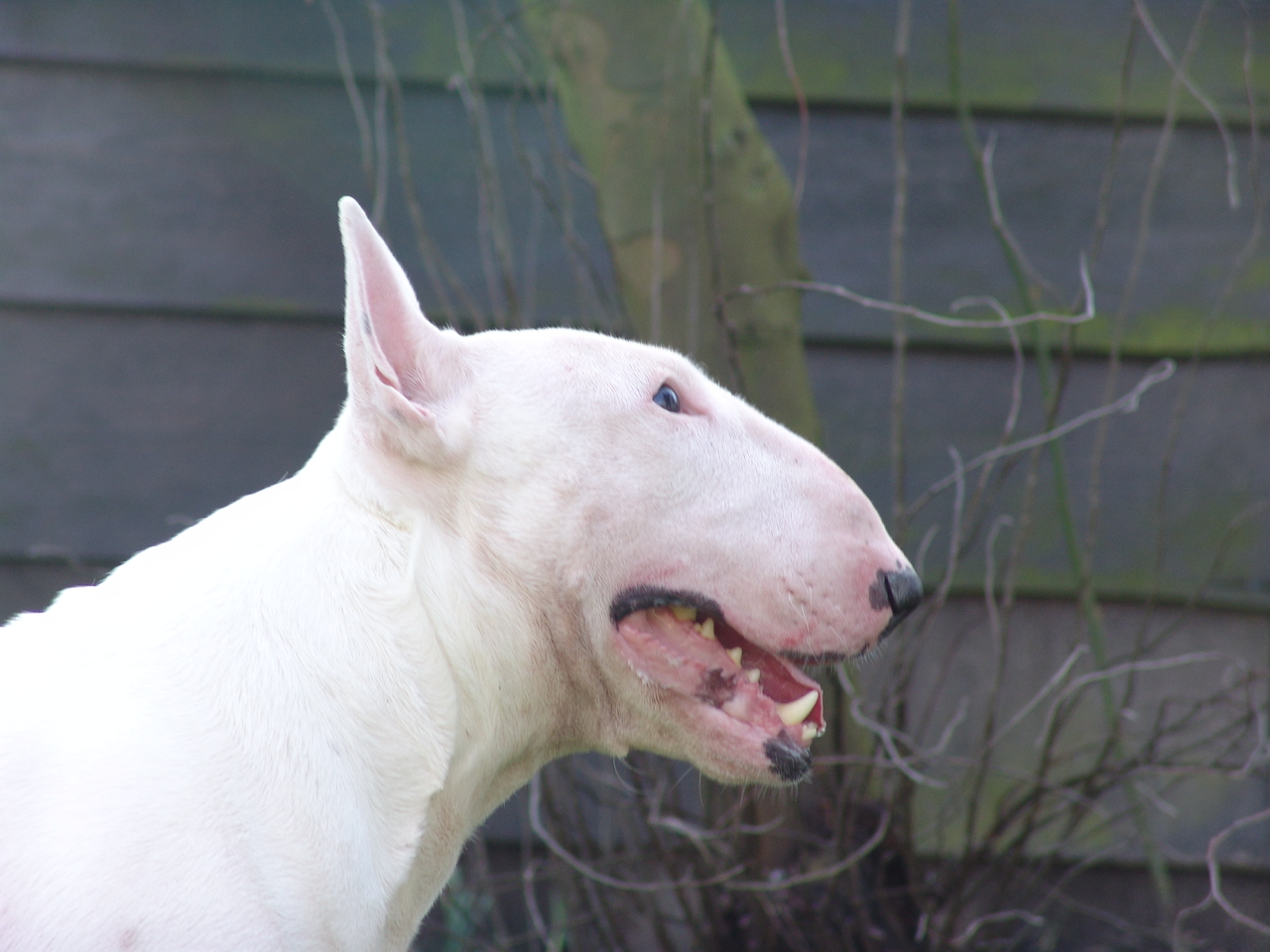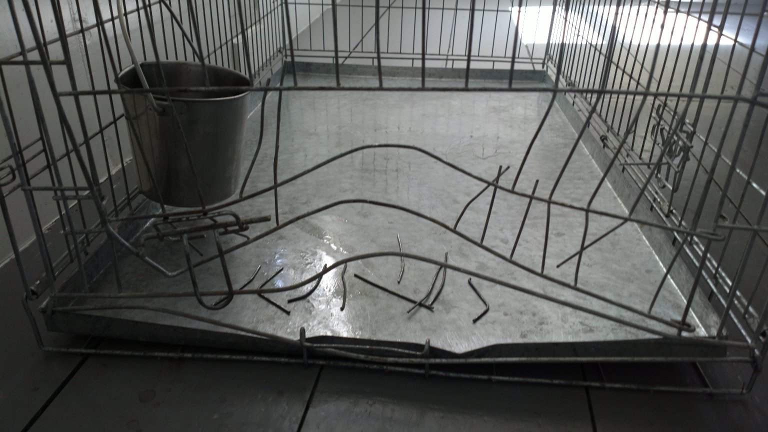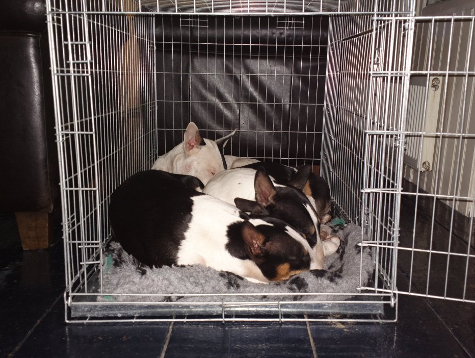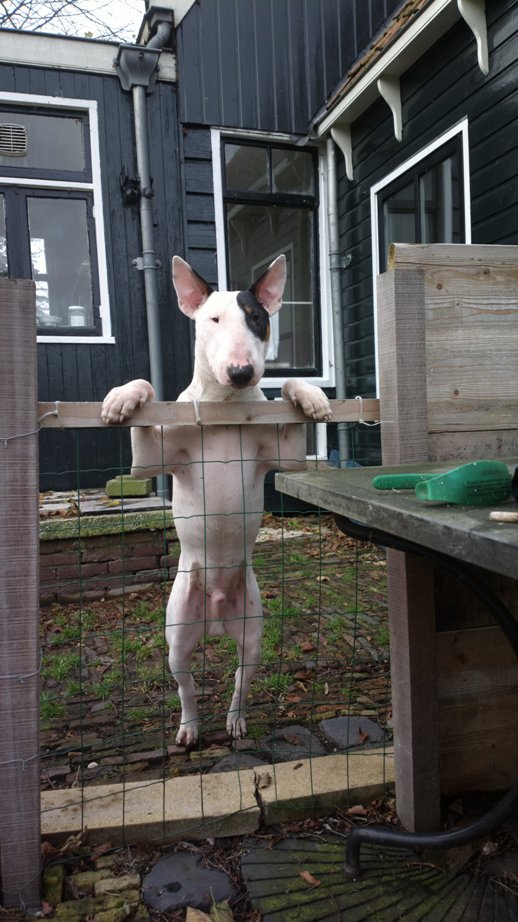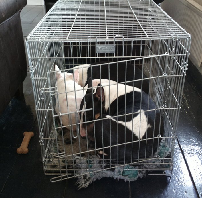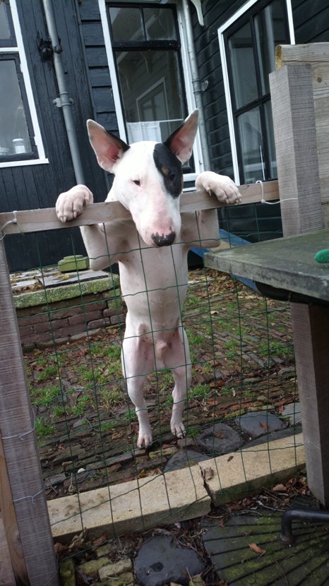 20 juli 2016: WAARSCHUWING DRAAD- OF RIJS BENCH. Sue was een uurtje alleen in een bench in de huiskamer, met daarbuiten loopse Tess. Houdini heeft zich net niet uit de bench weten te werken in dat uurtje. Sue bleef op een paar krassen op zijn neus na gelukkig ongedeerd: dit had hem een oog of een slagaderlijke halsbloeding kunnen kosten... Dit soort vouw, reis of draadbenches zijn totaal ongeschikt voor Bull Terriërs. Nooit en nergens, niet eventjes onbewaakt op een showtje, in de auto, thuis of waar dan ook. Als een BT een prikkel krijgt om zich eruit te werken, lukt hem/haar dat. Ik had al een hekel aan hondenkooitjes, maar nu ben ik er helemaal van genezen. GEBRUIK DIT SOORT BENCHES NIET VOOR BT'S!