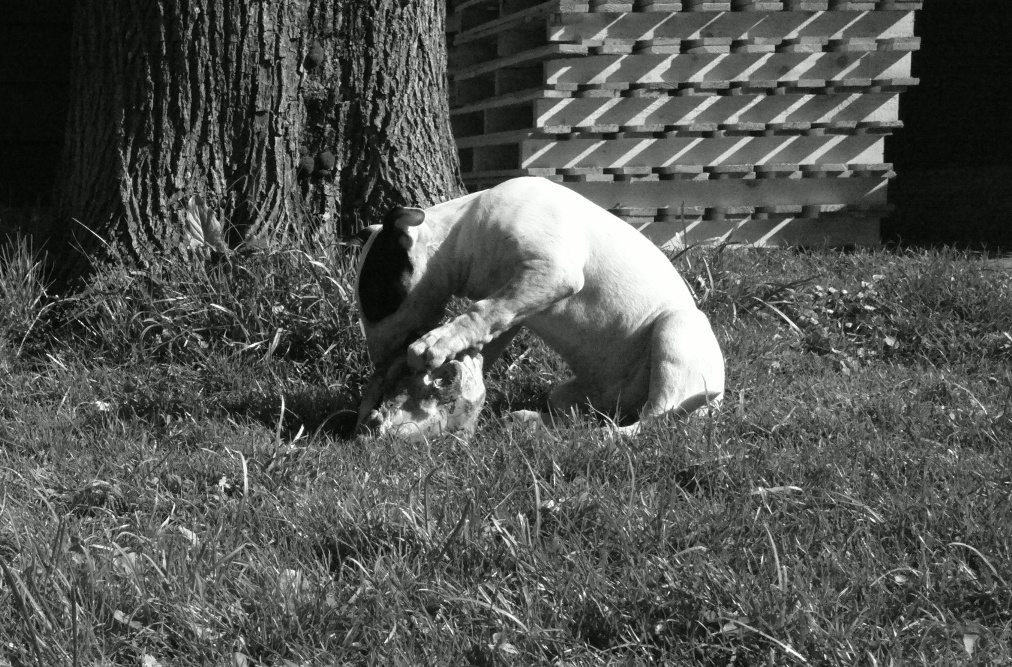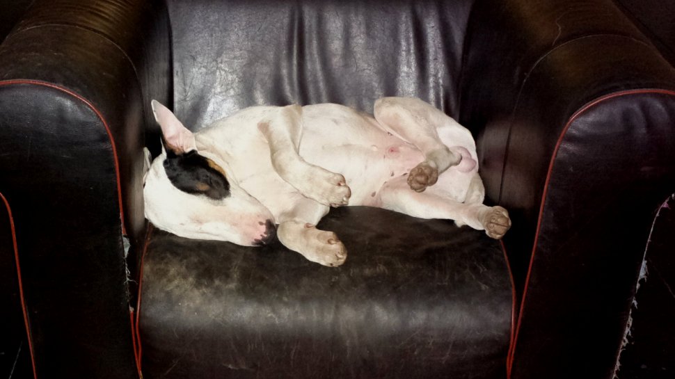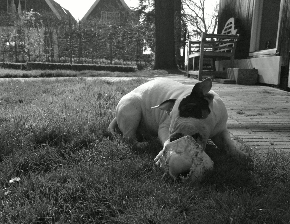 Na de wandeling een slaapje doen, terwijl de baas boodschappen doet, en dan je eerste bot. Wat nou hondenleven?
