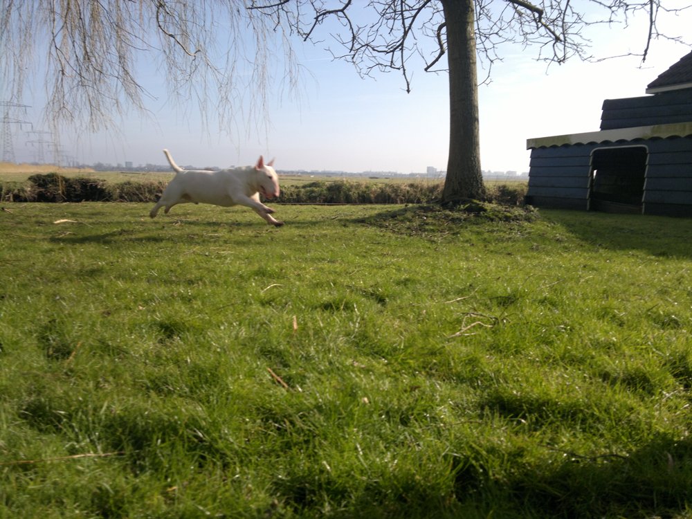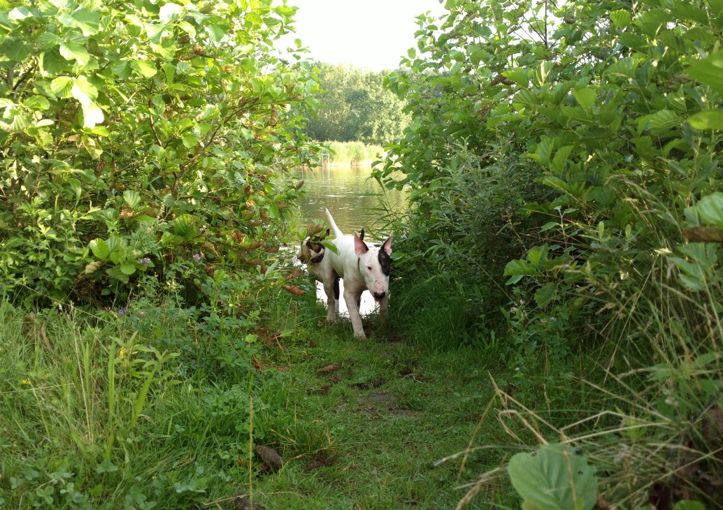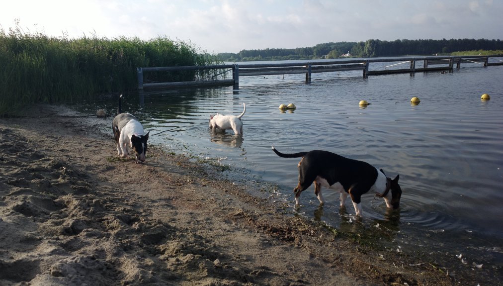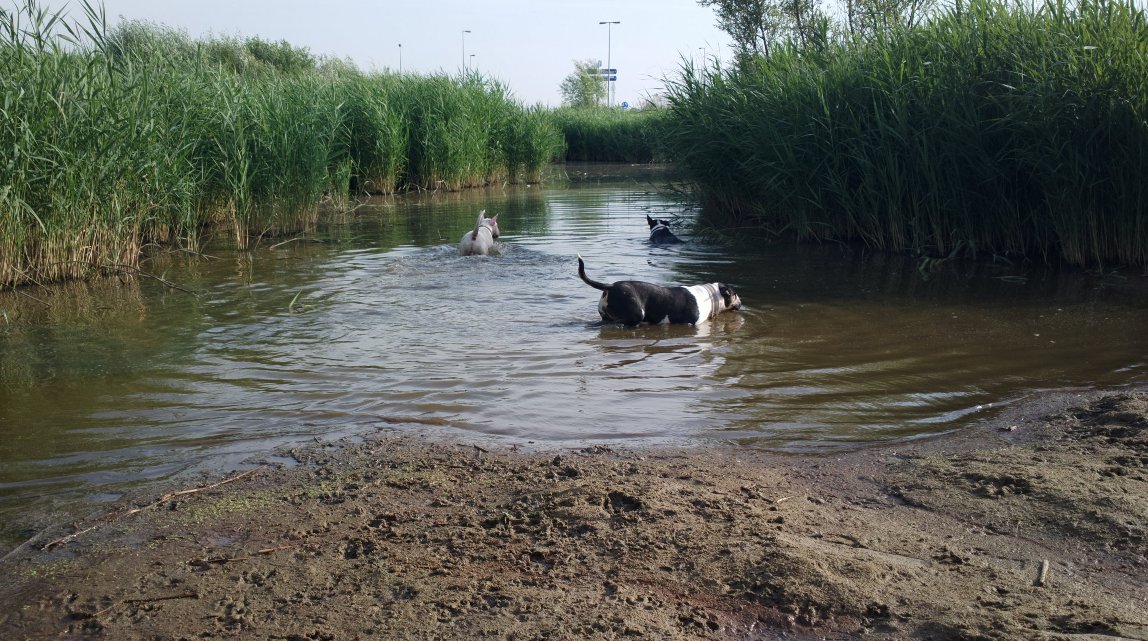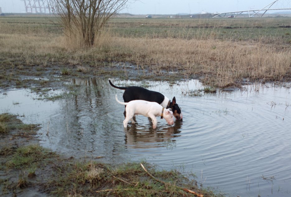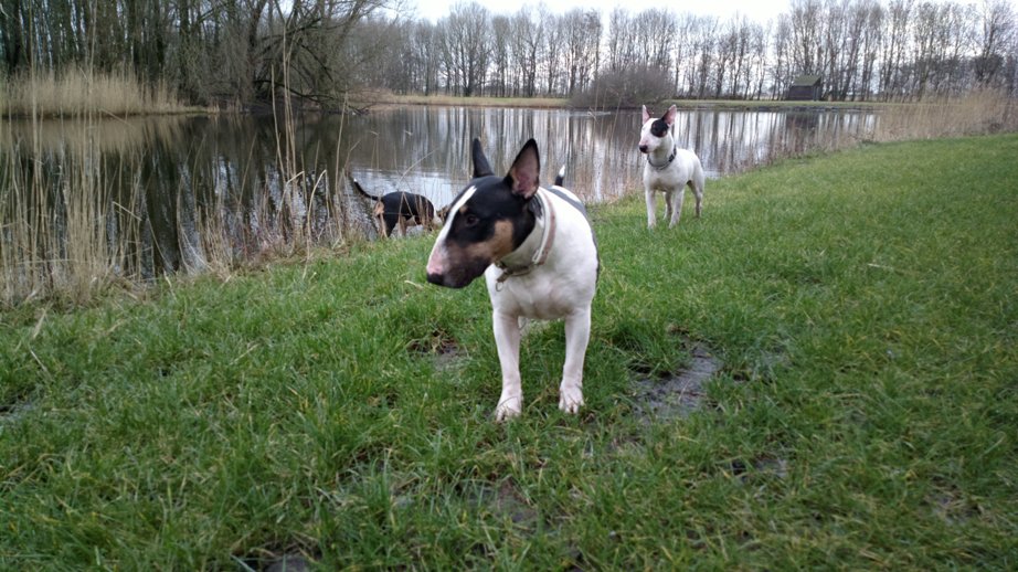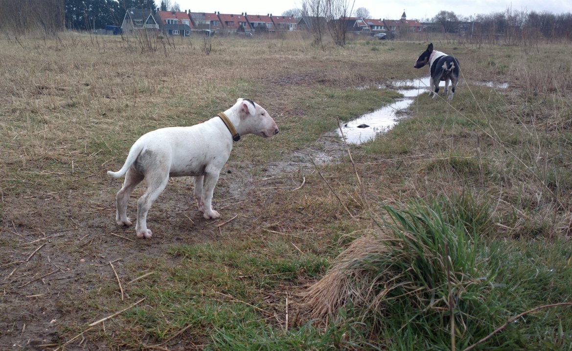 11 april 2015: met Sue naar het meertje, gelukkig is het er nog. De gemeente Zaanstad lijkt een tweede dijkwal aan te willen leggen op het braakliggende terrein waar wij wandelen. Ik ben benieuwd... Maar goed, Sue ging uit zijn dak van vreugde (Tess ook een nat pak ;-), mooi begin van het weekend!