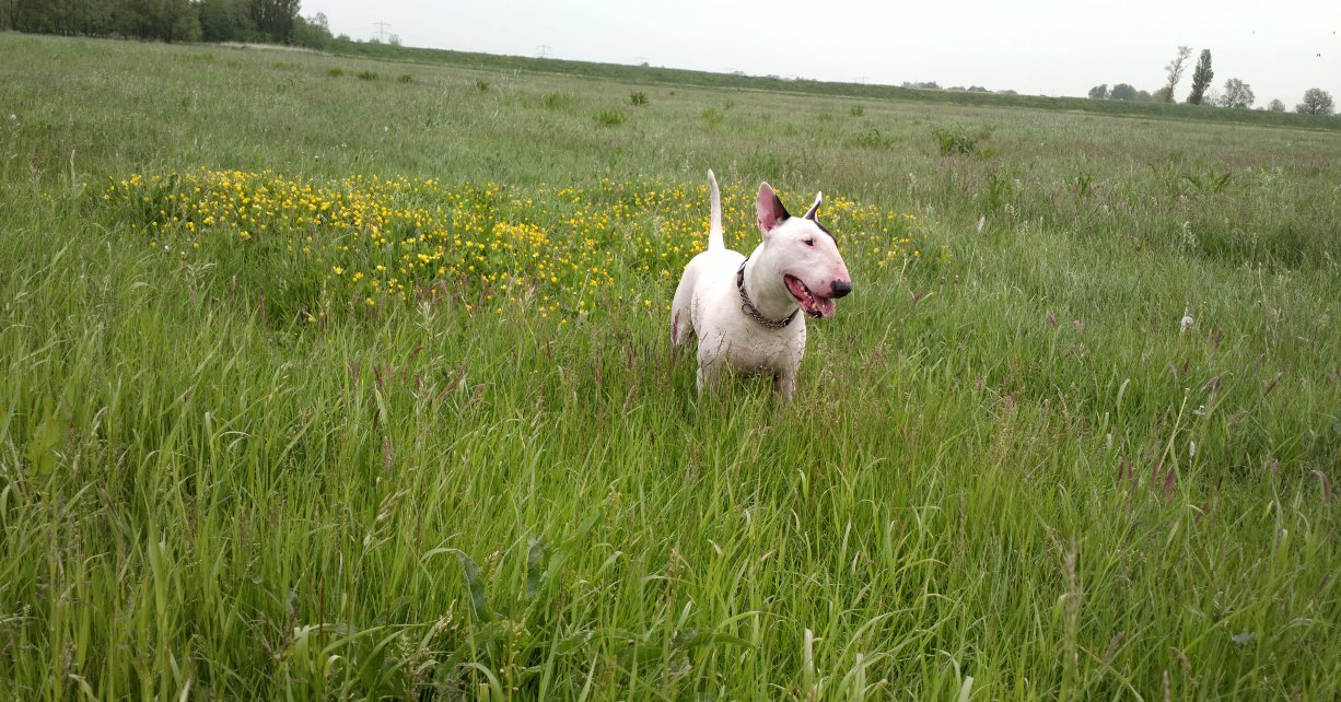 22 mei 2015: ochtendwandeling. Mmmmm, lekker, Buttercups: de bullies vinden het zo fijn in 'ons' nieuwe veld ☺
