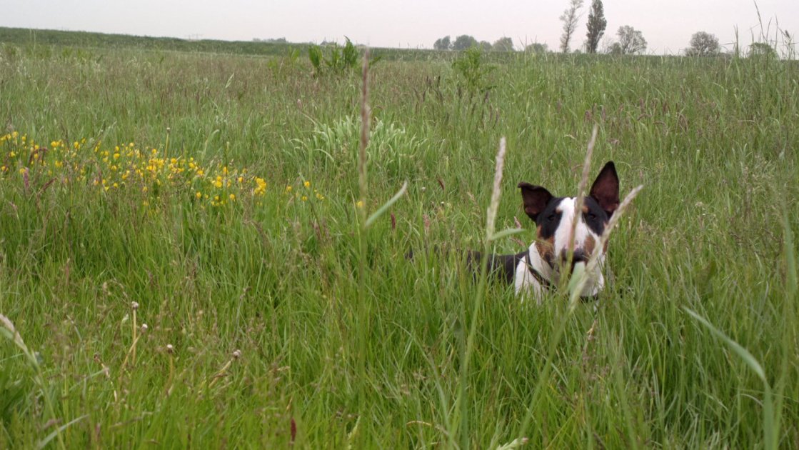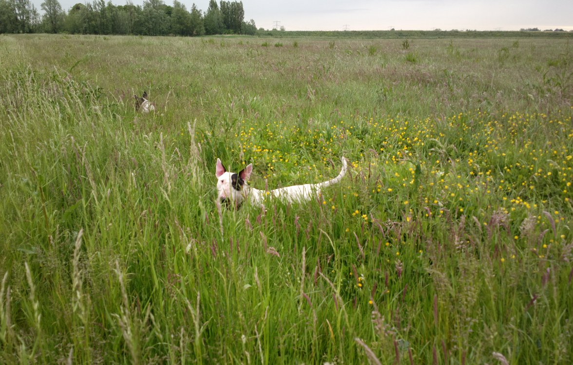 31 mei 2015: ochtendwandeling nummer 1, met Gladys en Sue. Tess is nu zo loops dat we in twee lichtingen wandelen. Lekker dollen in het hoge gras.