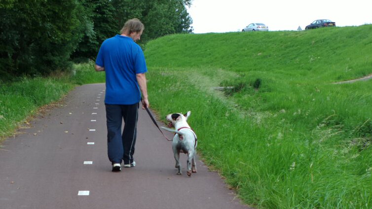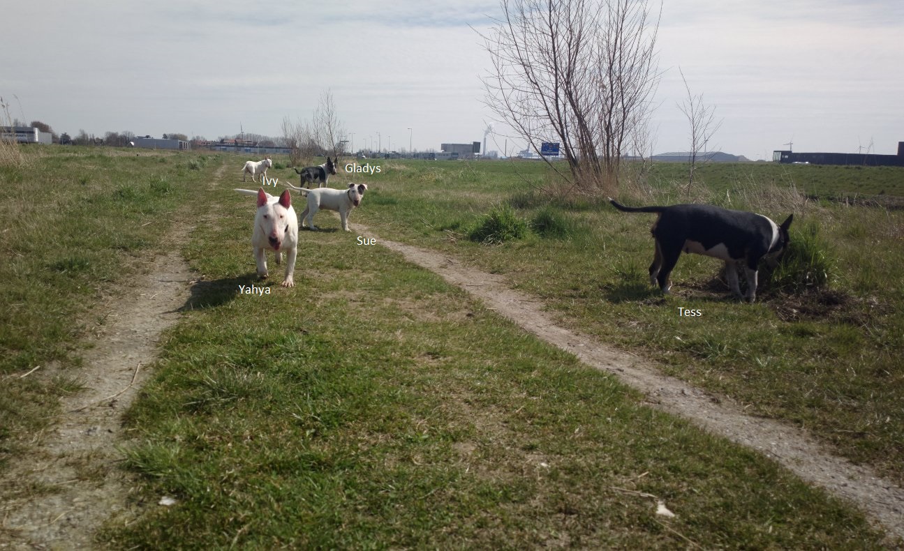 3 januari 2016: er is iets wonderbaarlijks aan de hand met Sue! De plek waar wij vrij en los kunnen wandelen ligt vier kilometer van ons huis. De hele rit daarheen in de auto piept en blaft Sue opgewonden. Dan stappen we uit en moeten ongeveer 300 meter lopen, o.a. over een smalle dijk met hard rijdende auto's en een druk fietspad, tot we op 'ons' veld zijn. Die hele aangelijnde 300 meter trekt Sue me al maanden zowat de arm uit de kom. Eergisteren zag Sue ook nog een poes, die stoer stopte en met bolle rug begon te blazen (niet heel handig) en Sue trok zo aan zijn wurg halsbandje dat 'ie zowat buiten adem stond te kokhalzen. Het is geen wurg ketting hoor, gewoon een Nylon bandje dat strakker wordt als je hard trekt, als door de Kynologen Club voor Sue aangeraden werd. Gisteren heb ik Sue voor het eerst sinds hij volwassen is een tuigje om gedaan. En zijn gedrag werd opeens anders: hij piepte minder in de auto, en trok niet meer aan de lijn: hij bleef netjes in de pas met mij, Gladys en Tess naast lopen. Huh? Ik dacht: okay, het tuigje is nog van Gladys toen ze pup was, het zit behoorlijk strak, waarschijnlijk is Sue daarom zo 'poeslief'. Dus vanmorgen een ruim zittend tuigje van wijlen Bolletje om gedaan bij de wandeling. Alweer 'best behaviour' van Sue! En wat is het begin van de wandeling dan opeens veel aangenamer! Okay, twee wandelingen geld nog niet als een 'wetenschappelijk onderzoek' J maar ik vermoed dat juist dat 'wurgende' van zijn halsbandje Sue's gedrag verergerde, i.p.v. het te 'corrigeren'. Wordt vervolgd!