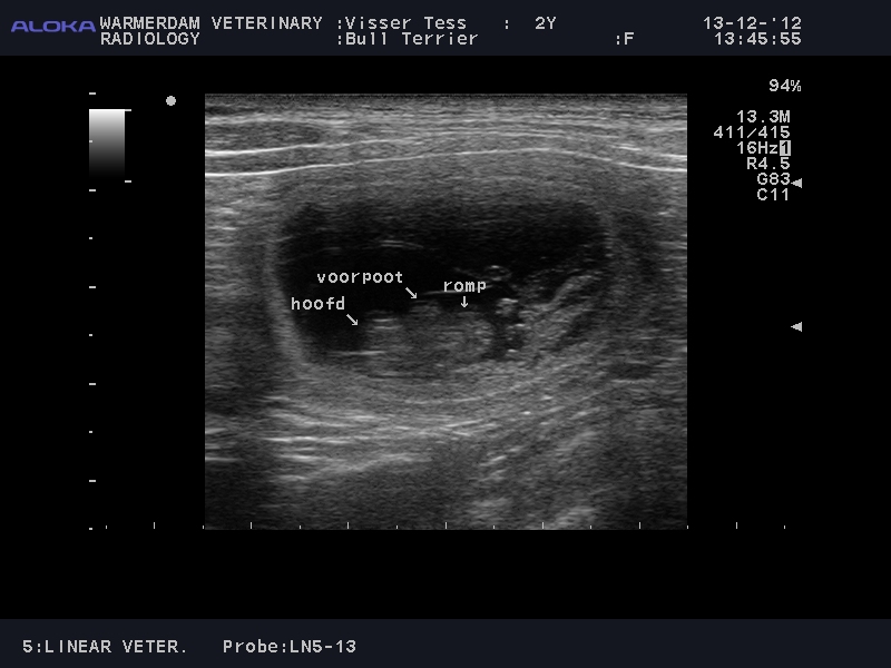 31 December 2012: vanmorgen waren Tess en ik bij de Dierenarts, ik was bang voor een complicatie maar de pup is gezond. Tess heeft last van vocht ophoping in haar pootjes en liep daardoor moeilijk. Na het krijgen van een pijnstillertje loopt Tess weer als een kievit, en dat is ontzettend goed om het vocht weg te werken. En Tess heeft (wellicht door het prikje) totaal geen angst voor het vuurwerk dat om ons heen wordt afgestoken, terwijl Gladys trillend in het aanrechtkastje zat (ligt nu met Tess bij mij op schoot). Tess is ook zo serieus en hormonaal met haar pup bezig, heel aandoenlijk maar ook lastig, o.a. een veel te vroege melkafgifte (de DA kneep in een tepeltje en ik moest mijn brillenglazen poetsen ;-). Ik heb de echo gezien: jeetje wat mooi, dag 48 en al een duidelijk waarneembaar ribbenkastje en een gezond kloppend hartje, prachtig. En de pup ligt met zijn hoofdje gelukkig de goede kant op. Hartelijk dank dierenartspraktijk Krommenie voor de snelle en goede hulp op oudejaarsdag, en voor het maar in rekening brengen van een halve echo! En bovenal hartelijk dank Mathé en Yvonne, ondanks dat ik met Facebook, Linkedin, Netlog, Skype enz. gestopt ben en met 90% van de BT fokkers in NL geen contact meer heb, hoor zelfs ik nog wel eens gemopper over de bereikbaarheid en hulp van de zgn topfokkers: daar vel ik geen waardeoordeel over, ongetwijfeld zit daar in sommige gevallen een sterke kern van waarheid in, maar voor mij, ook voordat ik zelf een Daikini hondje (Tess) had, hebben topfokkers Mathé en Yvonne ALTIJD 24/7, al 5 jaar, direct klaar gestaan met raad en daad, zo ook vanmorgen, om 7 uur ochtends op oudejaarsdag: thank you Mathé en Yvon: respect!