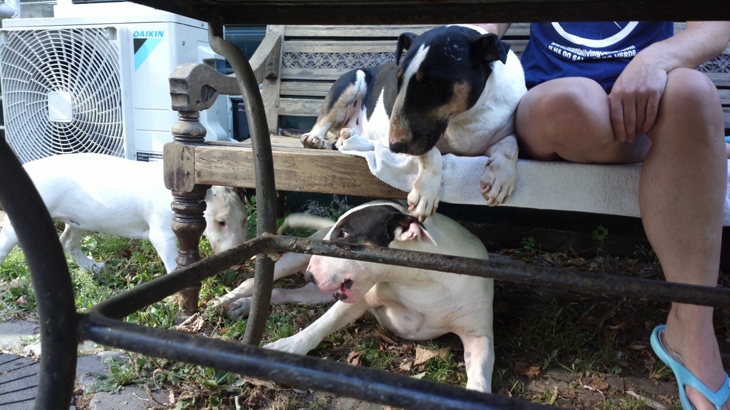 24 juli 2021: tsja, ik zou een vrolijk verhaal kunnen schrijven, ja, we hadden Leo met zijn BT Dessa en Floortje met haar BT Sky op bezoek, we proberen er het beste van te maken, maar het is wel voor de buhne. Met Sue gaat het slecht: hij heeft al 4 jaar last van goedaardige gezwellen bij zijn sluitspier, die zijn nu zes keer zo goed mogelijk operatief verwijderd, alleen zijn ze nu kwaadaardig geworden. Hij heeft vocht in zijn longen, wellicht door uitgezaaide kanker, is van 30 naar 25 kg afgevallen, hijgt en puft benauwd als een oude vent, het ziet er slecht uit. We maken er het beste van zolang Sue nog niet continu lijdt. Toch een paar foto's om de boel op te vrolijken, 5 BT's bij ons...