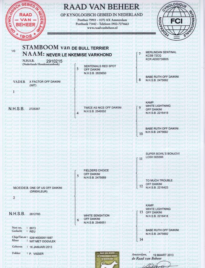 Toelichting Stamboom: onderstreepte stamboom namen hebben een hyperlink naar verdere digitale info. Rood gedrukte stamboomnamen hebben een kampioenstitel. Van de grijs gedrukte namen kan ik geen verdere digitale info vinden. Cursief gedrukte namen zijn de roepnamen.