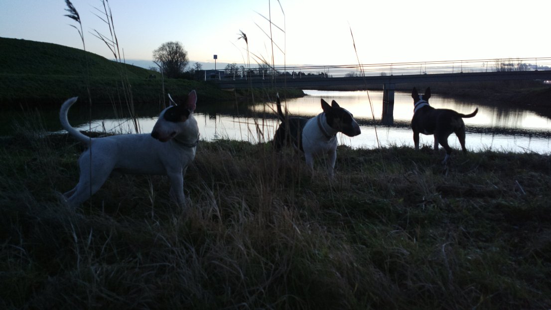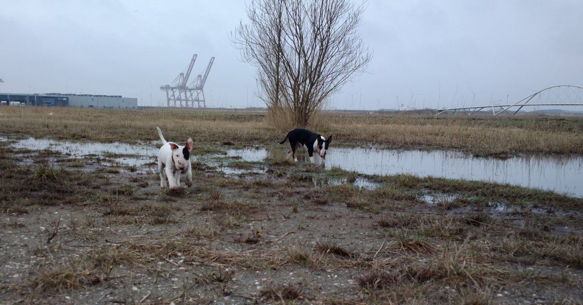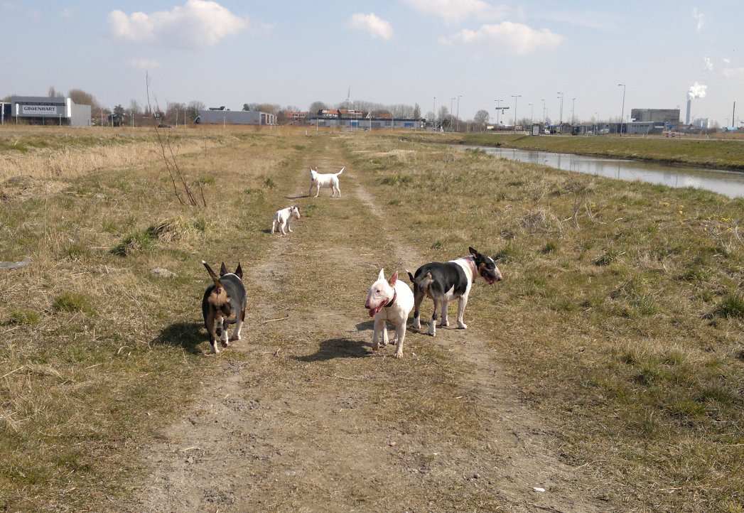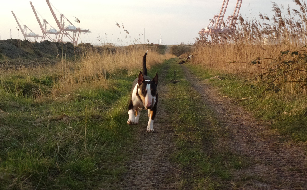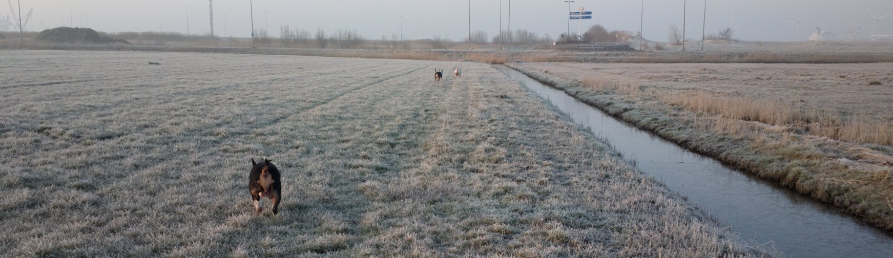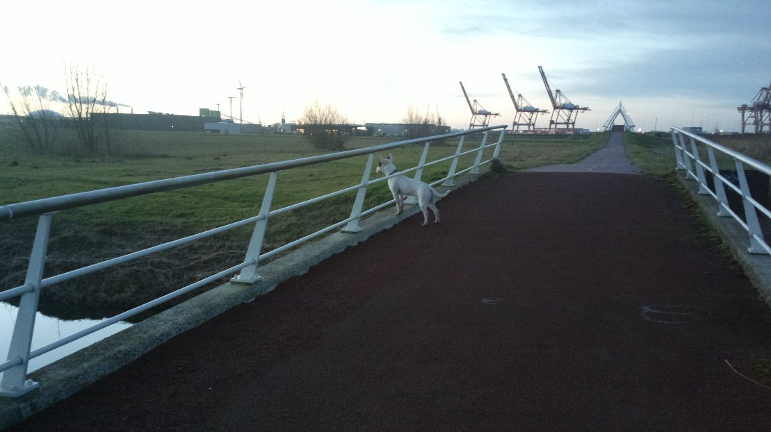 7 februari 2015: langs het Noordzeekanaal wandelen. Droog, niet meer glad en windstil: heerlijk! De BT's zijn happy, de baas ook.