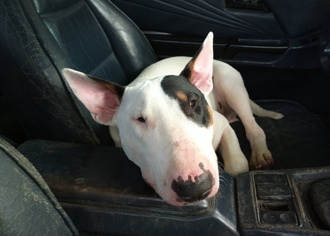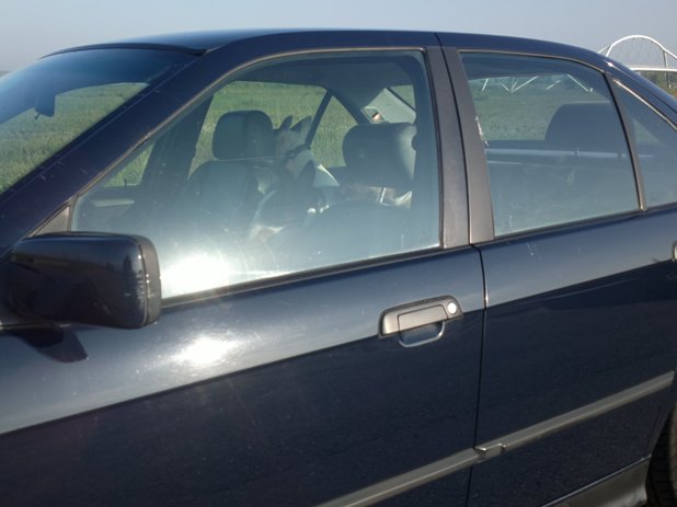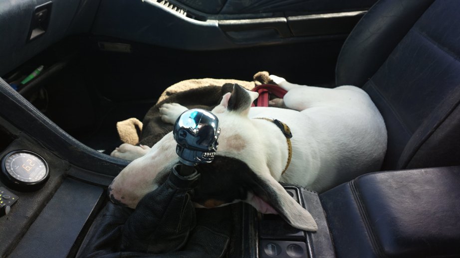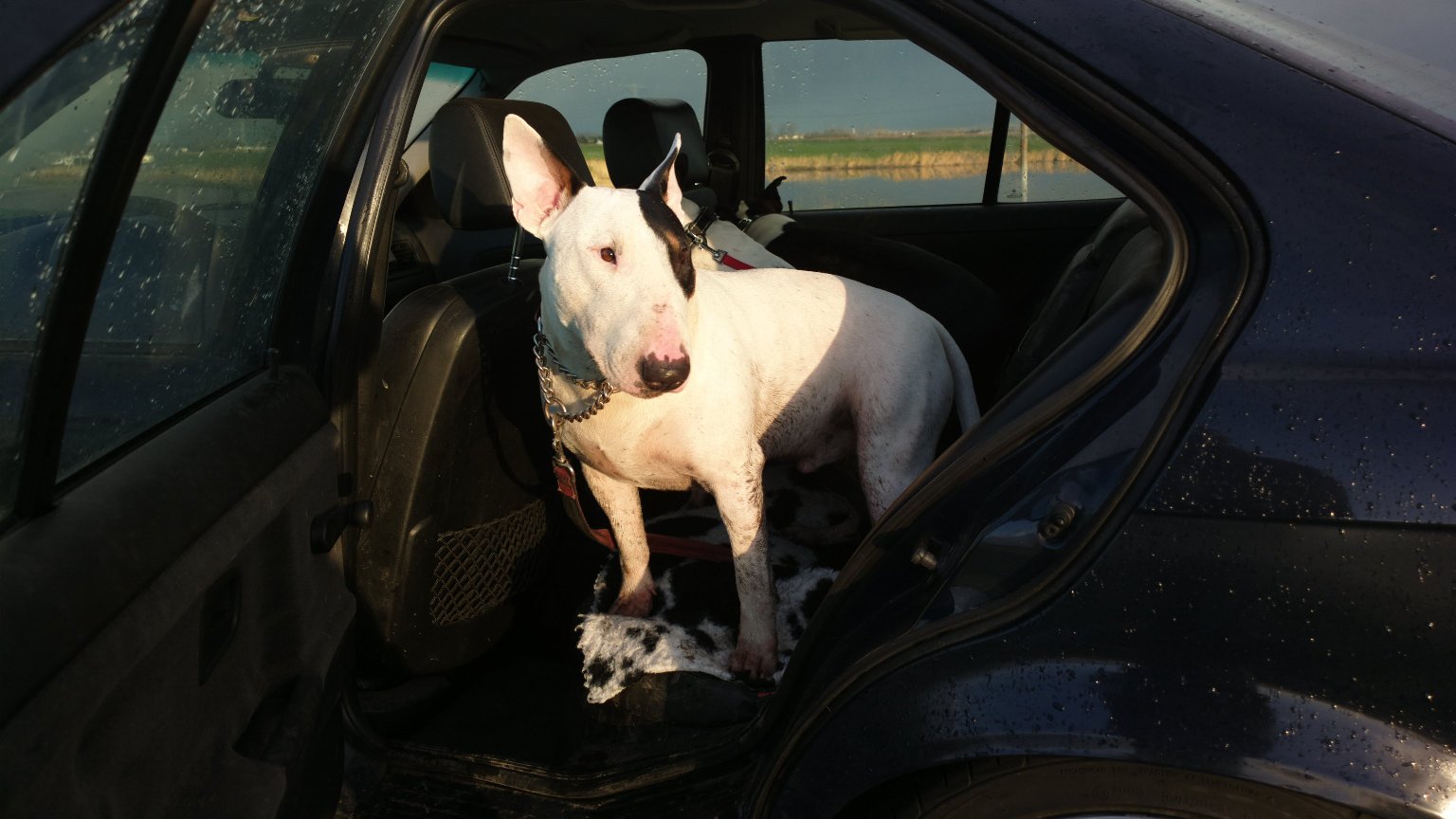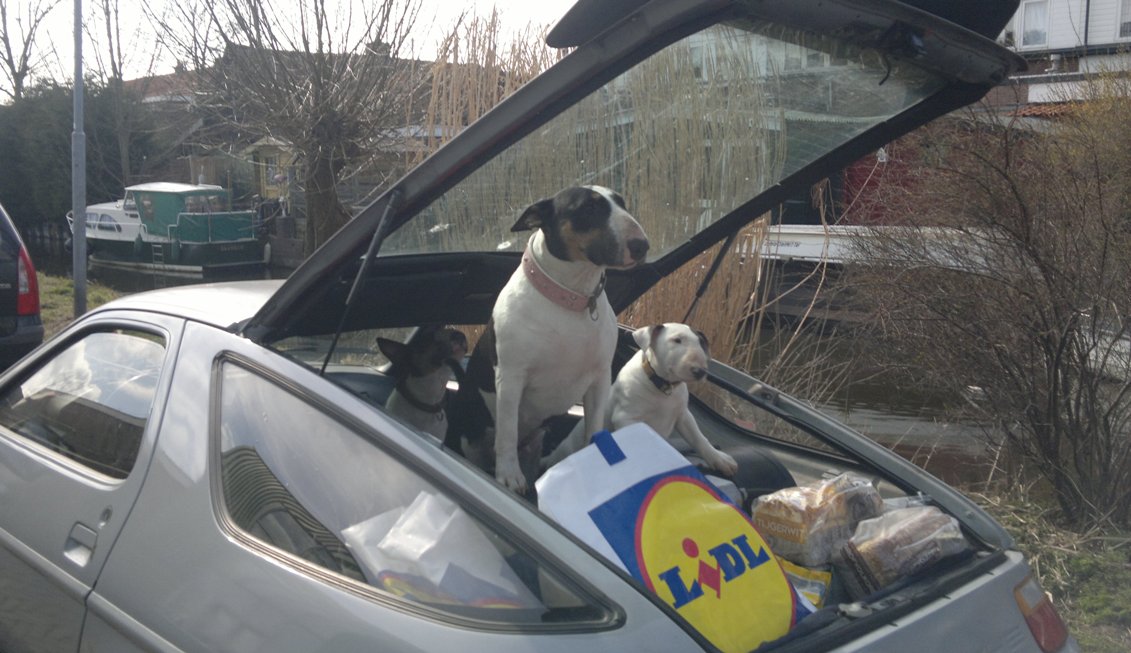 26 maart 2017: een van Sue's lievelingsplekjes voor een middagdutje, in het zonnetje, in de auto en lekker beschut van die eeuwige Noord Hollandse wind.