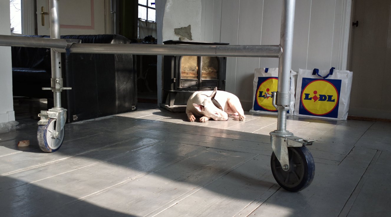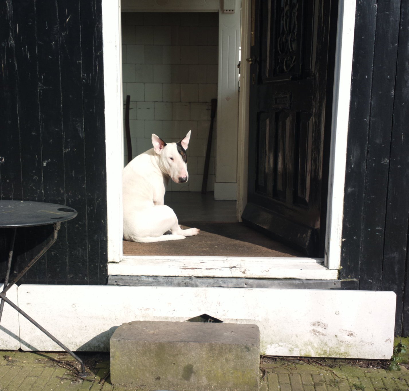 3 maart 2013: Sue was vanmorgen weer mee de polder in, maar de fut was er een beetje uit na de twee wandelingen van gisteren. Dat geeft Sue perfect aan, en dan draag ik hem tot hij luid piepend aangeeft dat hij iets ziet dat dringend nadere studie nodig heeft, waarna ik hem weer op zijn pootjes op de grond zet. We hebben dit weekend flink geoefend met het hondenluikje, Sue heeft het bijna door ;-)