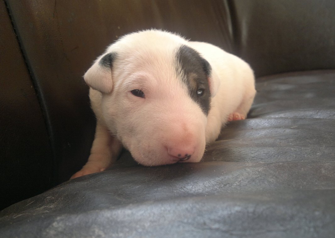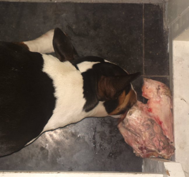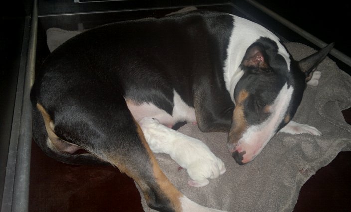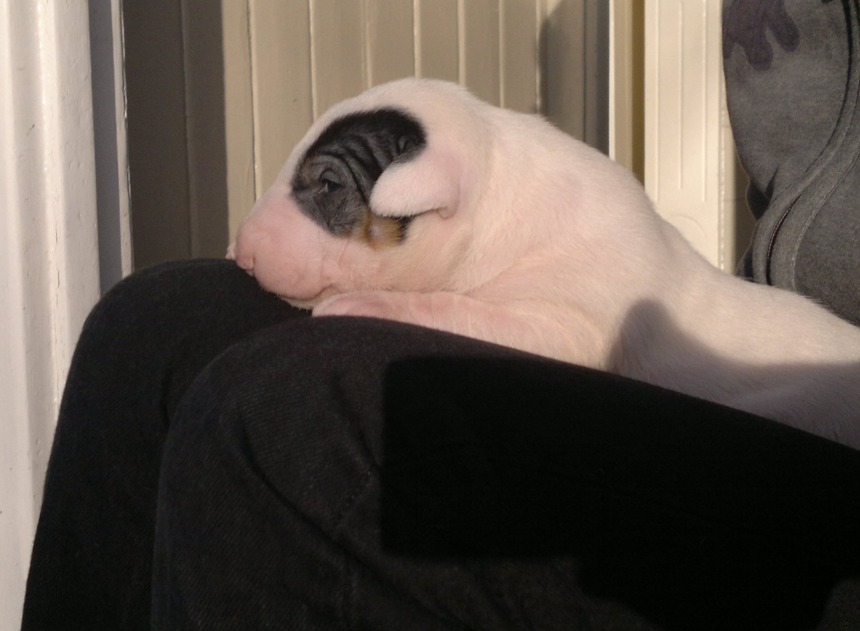 16 januari 2013: vanmiddag is Sue geboren. Het was een inspannende maar geheel natuurlijke thuis bevalling voor Tess. Never Le Nkemise Varkhond is een wit reutje met een tricolour oogvlek. Tess is een fantastische moeder! De bevalling was zwaar, vanaf gisteravond 11 uur onrustig, hijgen en voorweeën, vanmiddag om 14:30 pas de geboorte, na 1 3/4 uur intensieve pers weeën, maar Sue is geheel natuurlijk de wereld in gekomen, net als dat hij verwekt was, en dat lijkt binnen de BT fokkerij een m.i. onnodige (en m.i. zeer ongewenste) zeldzaamheid te worden. Nog geen 10 minuten na zijn geboorte lag Sue al genoegzaam aan een tietje te sabbelen, that's my boy ;-).