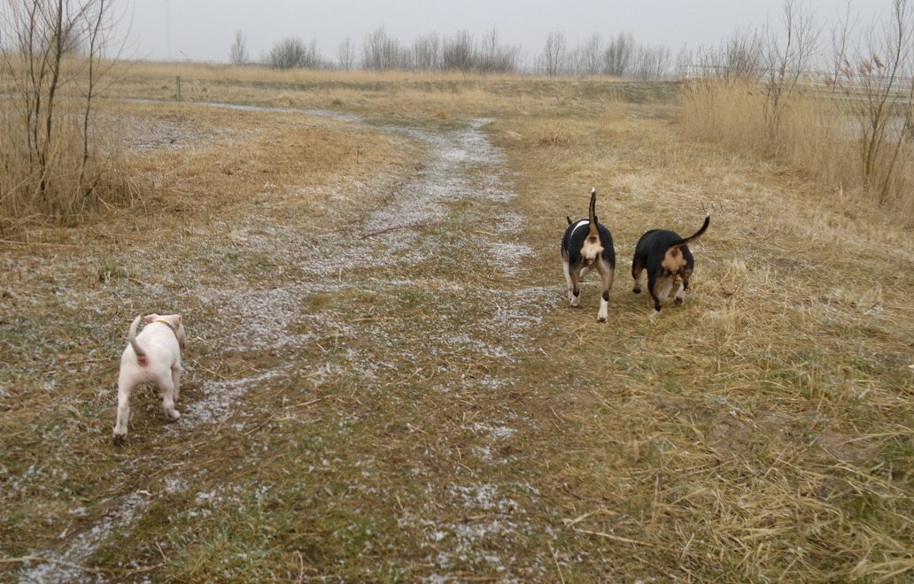 15 januari 2017: ochtendwandeling op een bevroren veld. Sue vind het prachtig, Tess vind het maar ongemakkelijk lopen...