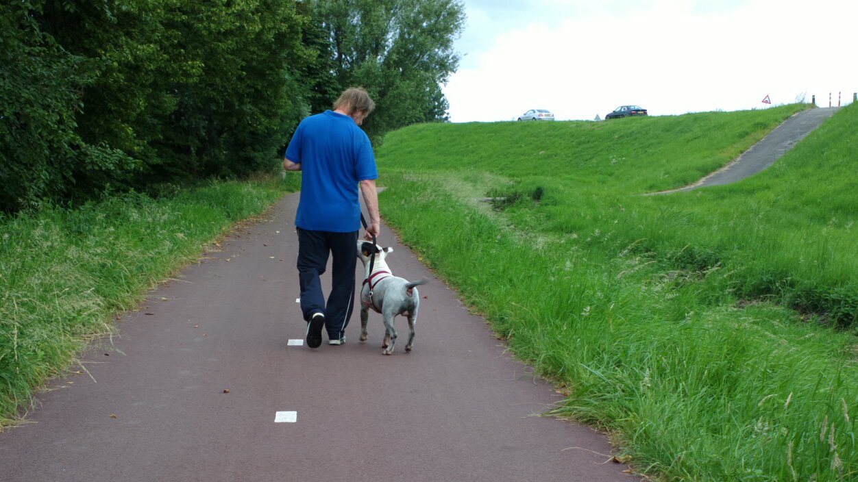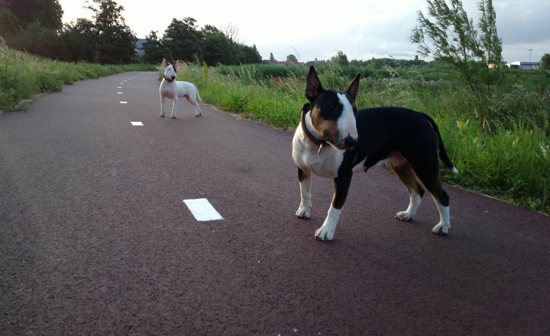 30 juli 2016: gezellig, Leo liep vanmorgen mee met onze wandeling. Leo woont een dorp verderop, en wacht al + anderhalf jaar op een kindje van Tess. Sue heeft 5 minuten tegen Leo lopen klieren, blocken, tegen hem op springen, blaffen, schijn hapjes enz. Tot Leo mij om Sue's lijn vroeg en hem overnam. Meteen positieve verandering en kijk naar de foto's hieronder van een half uur later: Sue loopt keurig aandachtig naast en iets achter Leo, maakt oogcontact en gedraagt zich voorbeeldig. Ehmmmm, zo netjes heeft Sue nog nooit naast mij gelopen. Petje af Leo, jullie zien er uit als dikke maatjes die al jaren op een prettige manier met elkaar optrekken. Ik kan aan de bak J...
