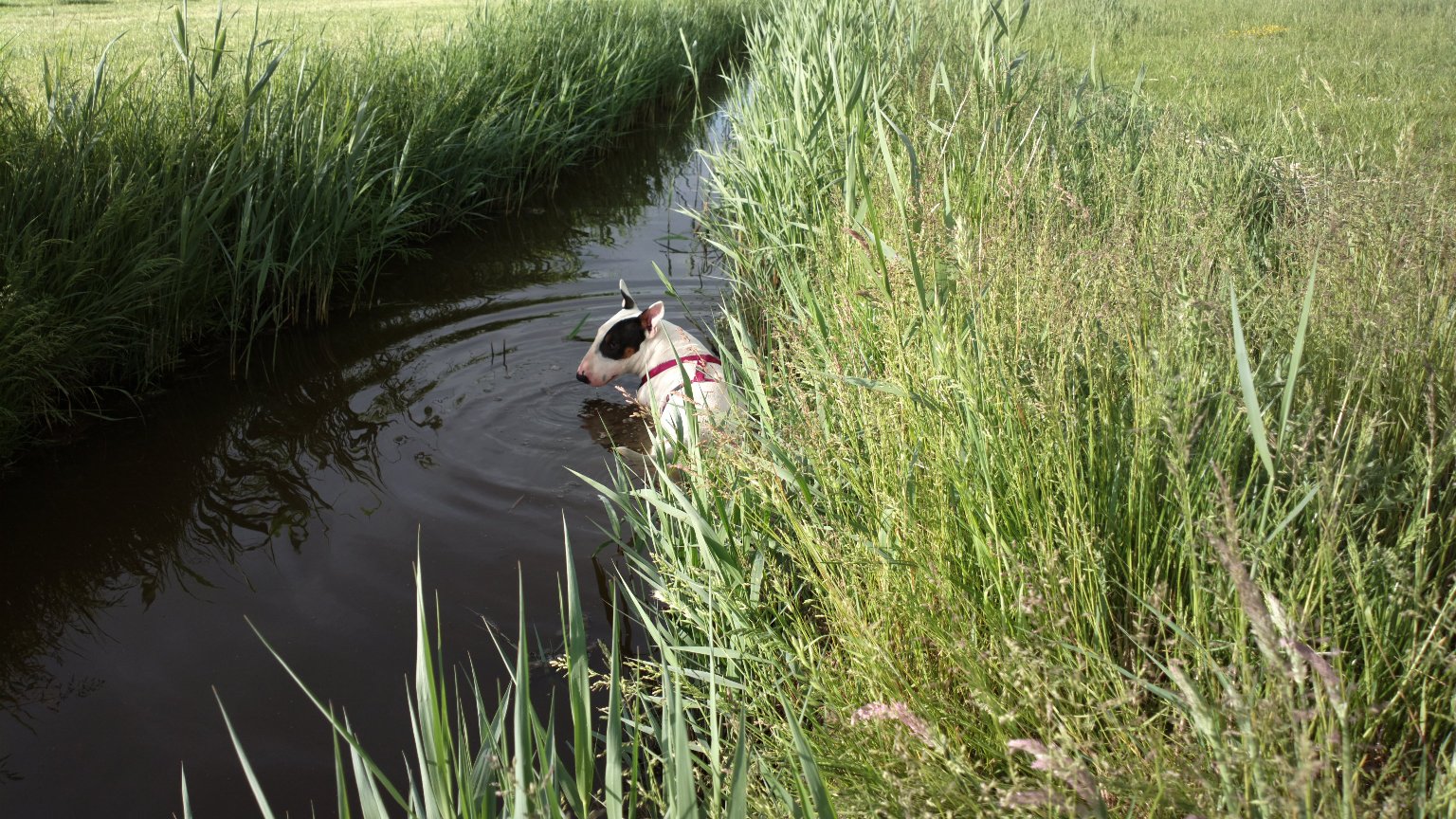 9 augustus 2015: 100 meter zat Sue een haas achterna, en net toen die hem bijna te pakken had kruiste een kroossloot hun pad. De haas deed slootje springen, Sue uiteraard plons. Een nieuw record aan modderigheid...