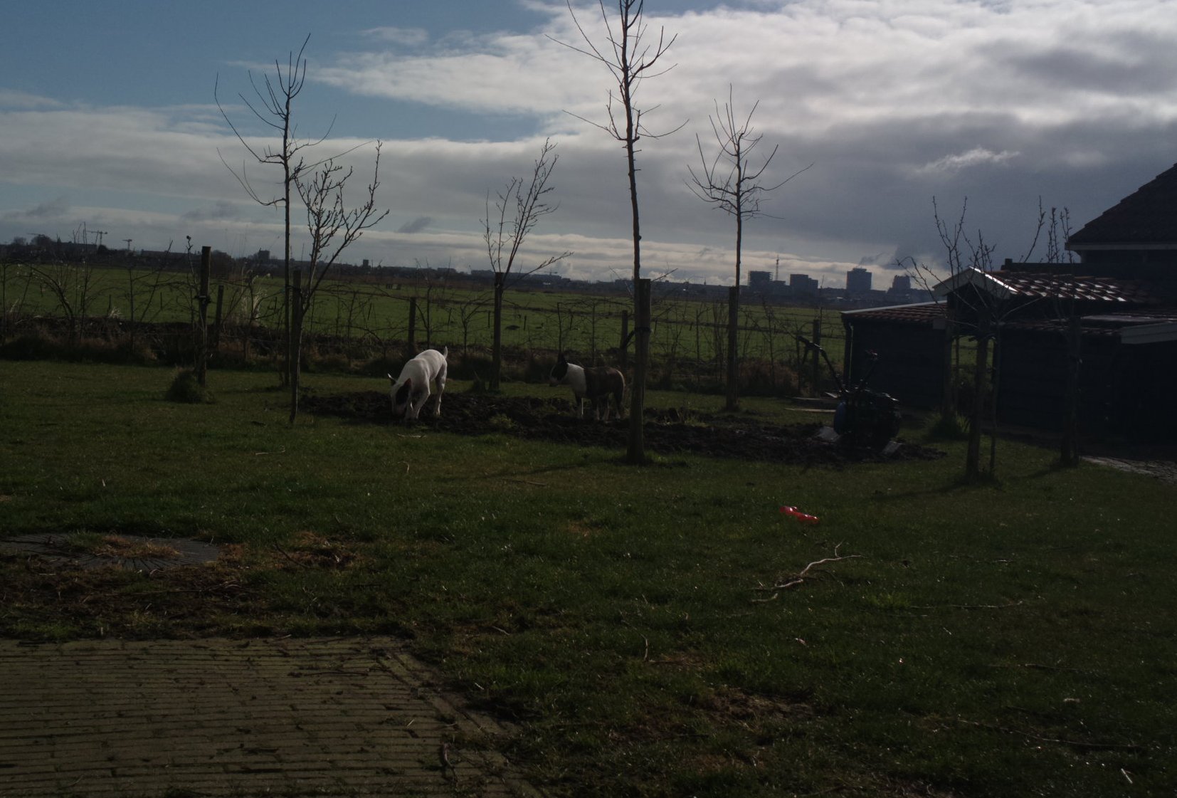22 maart 2021: met grof geschut (een grondfrees met een benzinemotor) de moestuin aan het prepareren voor een nieuw seizoen, de vogeltjes tsjilpen en Sue en Norma helpen goed mee ☺