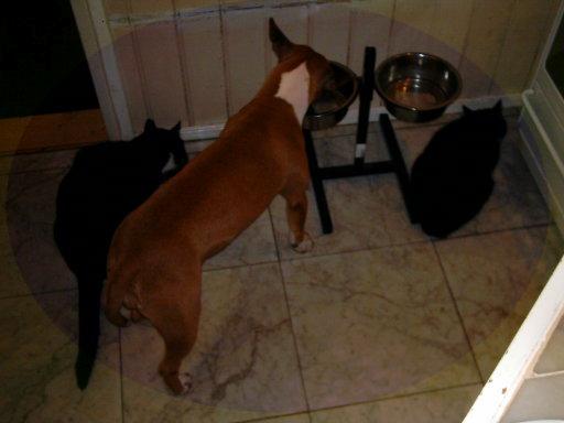 Bij de avondmaaltijd zit regelmatig iets extras als banaantje, mango, wat rijst die over is, hart of lever. Tijdens het koken valt er ook wel eens iets van het aanrecht. Als ik eet zit ze op haar plaats, bedelen mag niet!