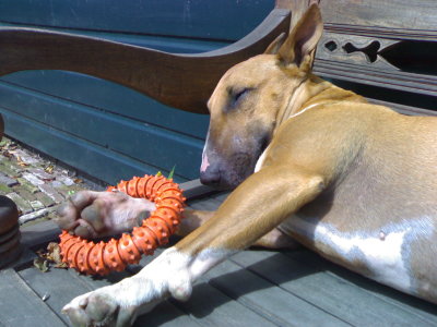 23 april: zo, dat is een tijd geleden. Na het avontuur met Thora was ik even helemaal klaar met de combinatie internet+Bulterriërs. Natuurlijk ging ons leven gewoon door, en de foto's ook. Tosca maakt goede vorderingen op de Flyball cursus: ze springt nu moeiteloos over 4 hindernisjes, rent er niet meer om- of doorheen, keurig! Het ballen lanceer apparaat snapt ze nog steeds niet, lastig daarbij is dat ik haar nooit het (in mijn ogen zinloze) commando poot heb geleerd, dit heeft ze nodig om als ze voor het 'trigger' plankje staat dat te bedienen. Nou ja, ze heeft er enorm veel lol in, als wij op zaterdag ochtend haar rode sporttuigje aantrekken weet ze meteen waar we heen gaan (Pavlov) en wordt helemaal hyper. Tosca geniet enorm op de cursus, en daar doen we het voor...