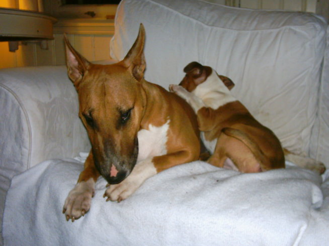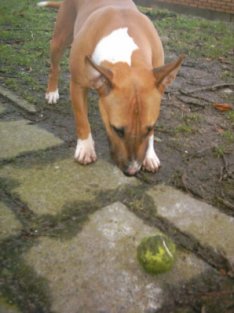 10 februari: Tosca en baasje zijn vandaag voor de Flyball aanleg test geslaagd, dit houdt in dat wij hierin samen met 11 andere honden een cursus mogen doen. Baasje was hier best wel een beetje zenuwachtig over, hoe komt een autodidact opgevoede hond (met behulp van de boeken van Jan Fenell en Klaas Wijnberg, beiden hondenfluisteraars) nou over op een club die volgens de gevestigde methoden honden les geeft? Redelijk goed, Tosca heeft zich sociaal gedragen, wellicht ietwat speelser en ondeugender dan de rest, maar luistert in principe goed naar me, ook al moet ik een vraag soms 3 keer herhalen, maarja, ze was behoorlijk enthousiast opgewonden en ze blijft natuurlijk vooral een Bulterriër... Wat Flyball precies inhoudt weten wij nog niet, maar o.a. over 2 of 3 hinderdissen springen om te landen op een apparaat dat tennisballen lanceert zit in het programma. Vooral de tennisballen lanceer machine zal volgens baasje Tosca enorm aanspreken! Verder ontspannen en gezellige sfeer, leuke mede cursisten (eigenaren en honden) waaronder Chels en relaxte leraren / vereniging. De hechte vriendinnenschap met Chels zal waarschijnlijk een van onze moeilijkste hindernissen worden, de meiden willen natuurlijk het liefste gewoon samen lekker keten. Volgend weekeinde eerste les, wij zullen onze progressie hier beschrijven!