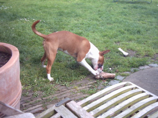 Enkele foto's van deze week: nieuw speeltje uit USA, stokje vernietigen en vandaag een heel groot biologisch bot van opa & oma / slagerij de Ridder.