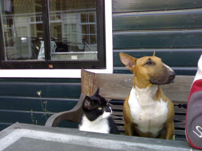 Tosca is vanavond weer voor jaarlijkse prikkencircus bij de dierenarts geweest. Rabiës cocktail is nu gelukkig 3 jaar geldig binnen EU. Verder de volledige inentingscocktail (nodig met al dat sloot zwemmen) en voor beiden wormenkuurtje gekocht. Baas heeft baby's voorlichting gekregen: 5 tot 13 dagen na begin bloeding moeten we heel voorzichtig zijn, en dag 1 komt alweer snel dichtbij. Moeilijke beslissing: baas wil heel graag een keer een nest en dan een pup houden (Tosca heeft zo een goed karakter dat ze natuurlijk moet werpen om dit te vereeuwigen), kans is klein maar echter reëel dat Harry hier voorgoed komt wonen en 3 Bully's wordt ff te gek...