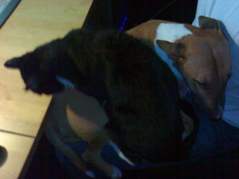 Gelukkig kerstfeest allemaal! Zelfs Flint en Tosca zijn helemaal in de stemming, schoot te klein, dan maar stapellen. Nog nooit eerder vertoonden ze zoveel intimiteit. Dit bewijst dat rood vlees niet agressief maakt (ze hadden net allemaal een grote bak bloederige lams lever voor het kerstontbijt opgepeuzeld), dat liefde door de maag gaat en wellicht zelfs dat ontspannen gemoedstoestand baasje direct in huisdieren gedrag weerspiegeld wordt...